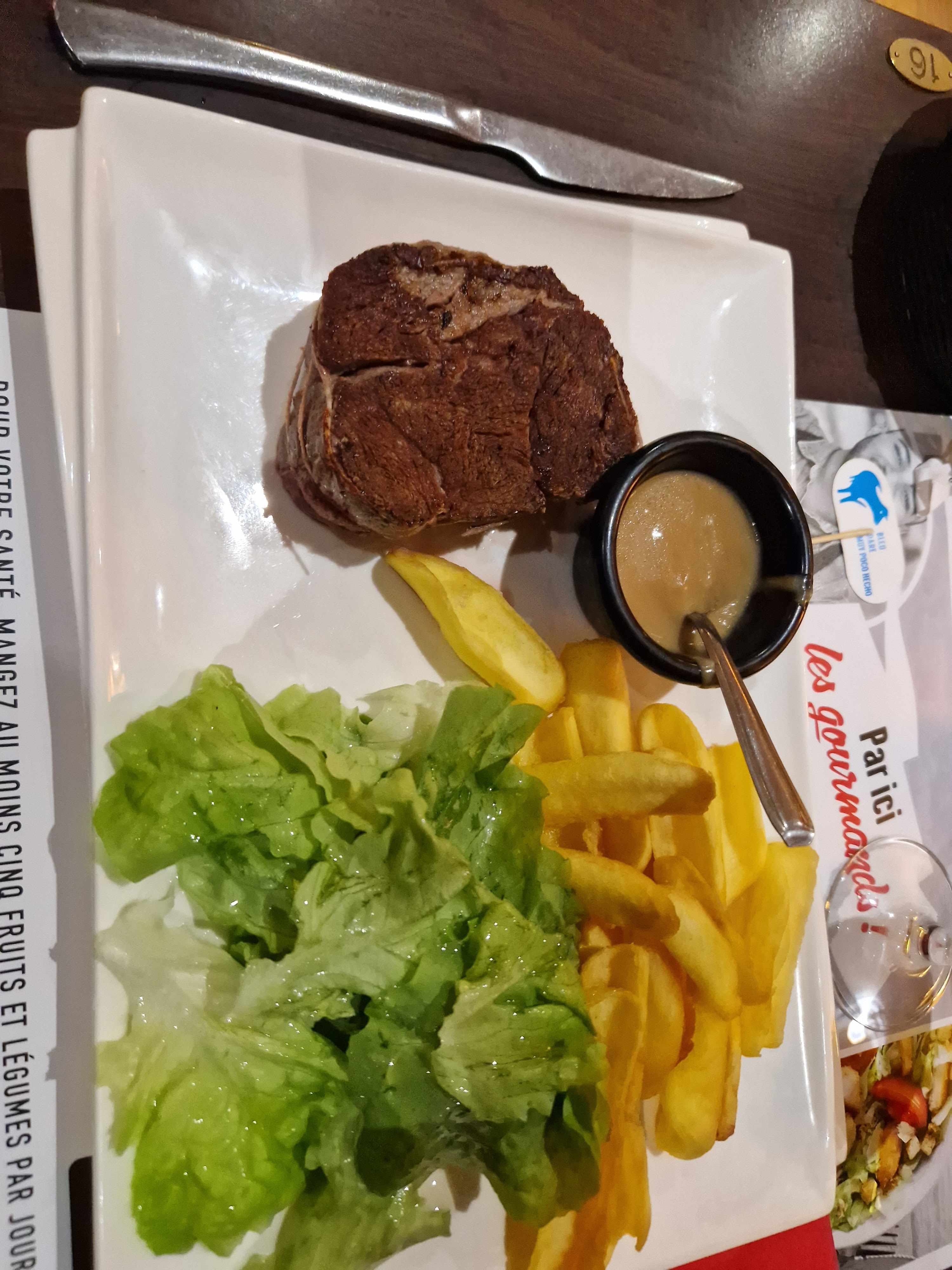 viande de bonne qualité et service avec le sourire service très agréable avec le sourire, les cocktails sont bien servis pour le prix 6.20e, nous avions choisi le tournedos dans le filet qui était très bon avec une sauce au choix, des frites et de la salade. rien à redire si ce n'est le petit bémol qui rendrait l'assiette sans faute, ce serait de penser à proposer des frites fraîches et non surgelées. en résumé pour une première fois dans ce restaurant je trouve qu'il n'y a rien à redire, j'y retournerai volontiers