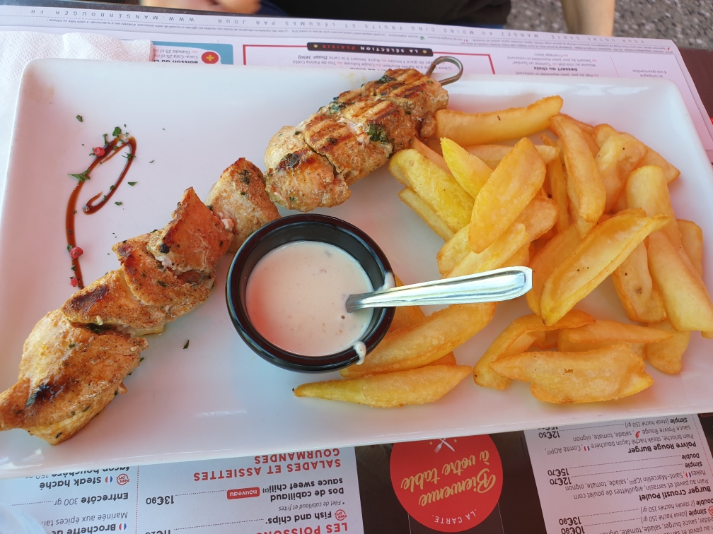 Nous étions seulement 2 tables en terrasse et il y avait beaucoup de monde à l'intérieur nous avons attendu très longtemps avant que on vienne prendre notre commande.Les sauces ( mayo, ketchup), sont dans un petit chariot qui est au soleil donc je ne trouve pas cela bien vu les températures excessives qu' il y avait.La mayonnaise va virer.Sinon la brochette de poulet était parfaite, les autres plats très bien, le service bien et le personnel est très aimable . Voilà je recommande ce lieu car dans l'ensemble c' était vraiment bien
