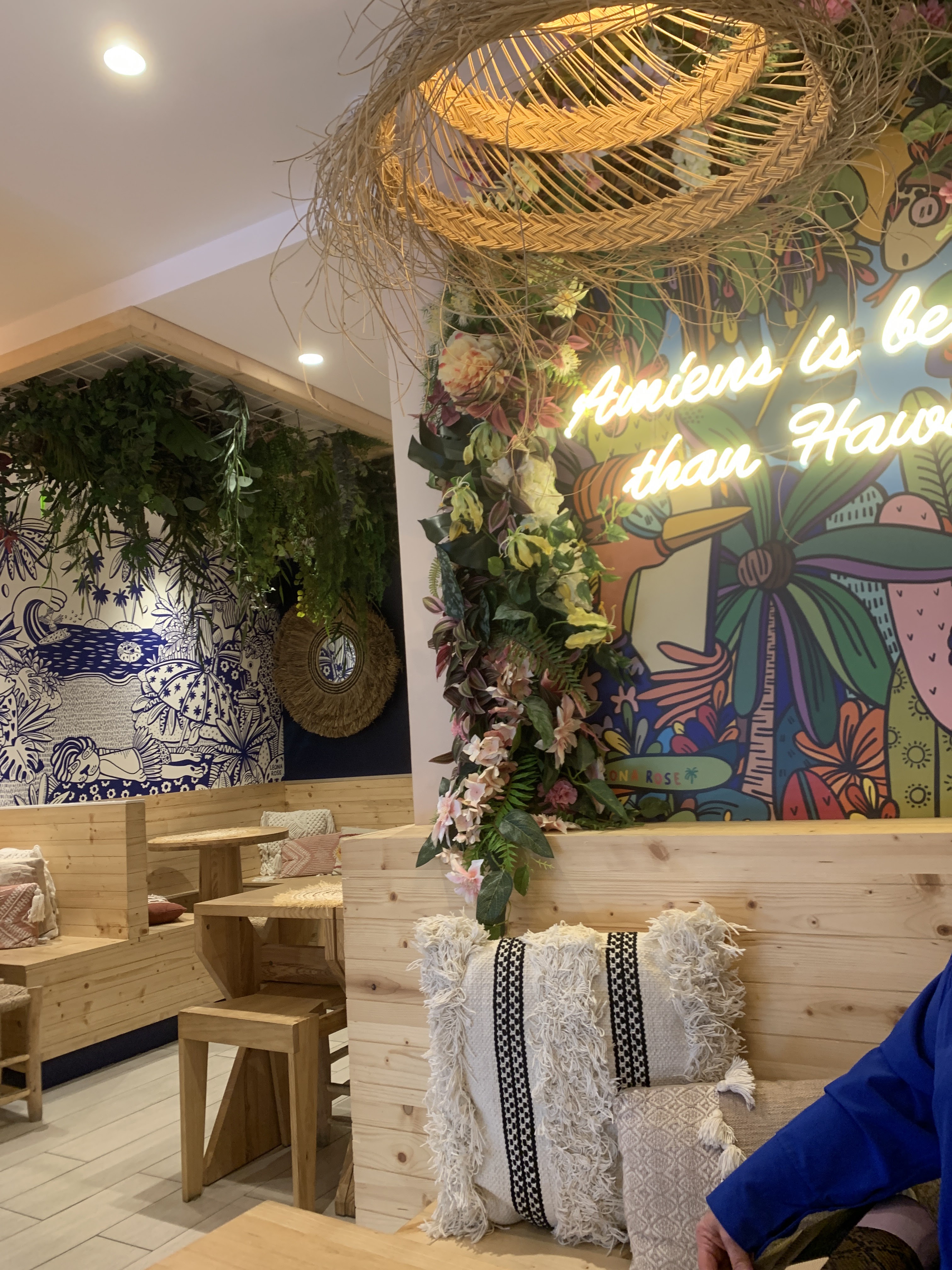 Décoration agréable et solaire Personnel accueillant et sympathique Pokebowl frais, savoureux, un peu plus de sauce ça serait parfait Petits Bémols : musique un peu trop forte et prix un peu élevés.