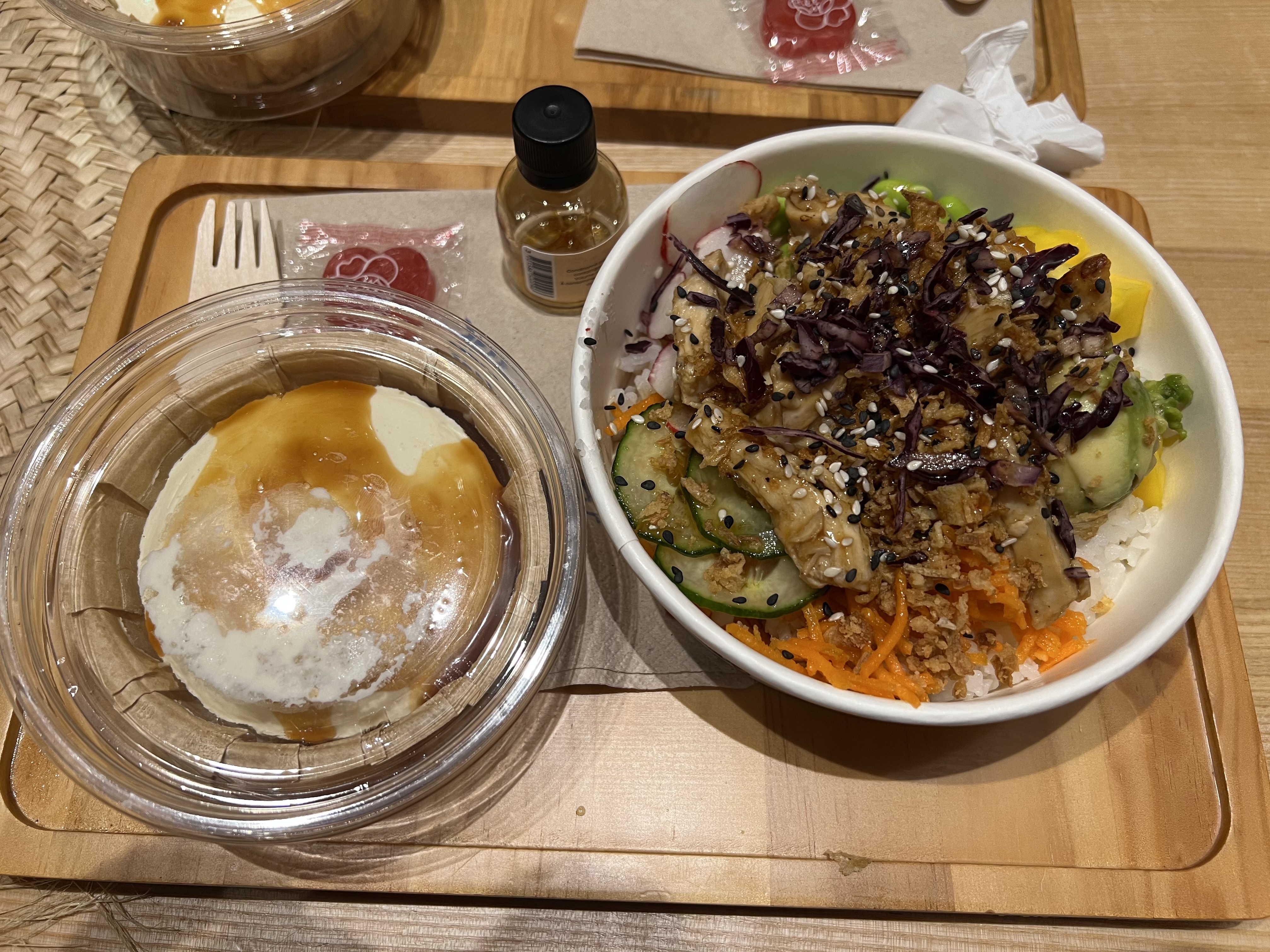 Très bon et généreux poké au poulet. Je ne connaissais pas ce dessert, originale découverte. Préparation très rapide, je recommande. Ouvert toute la journée même le dimanche, c’est très pratique.