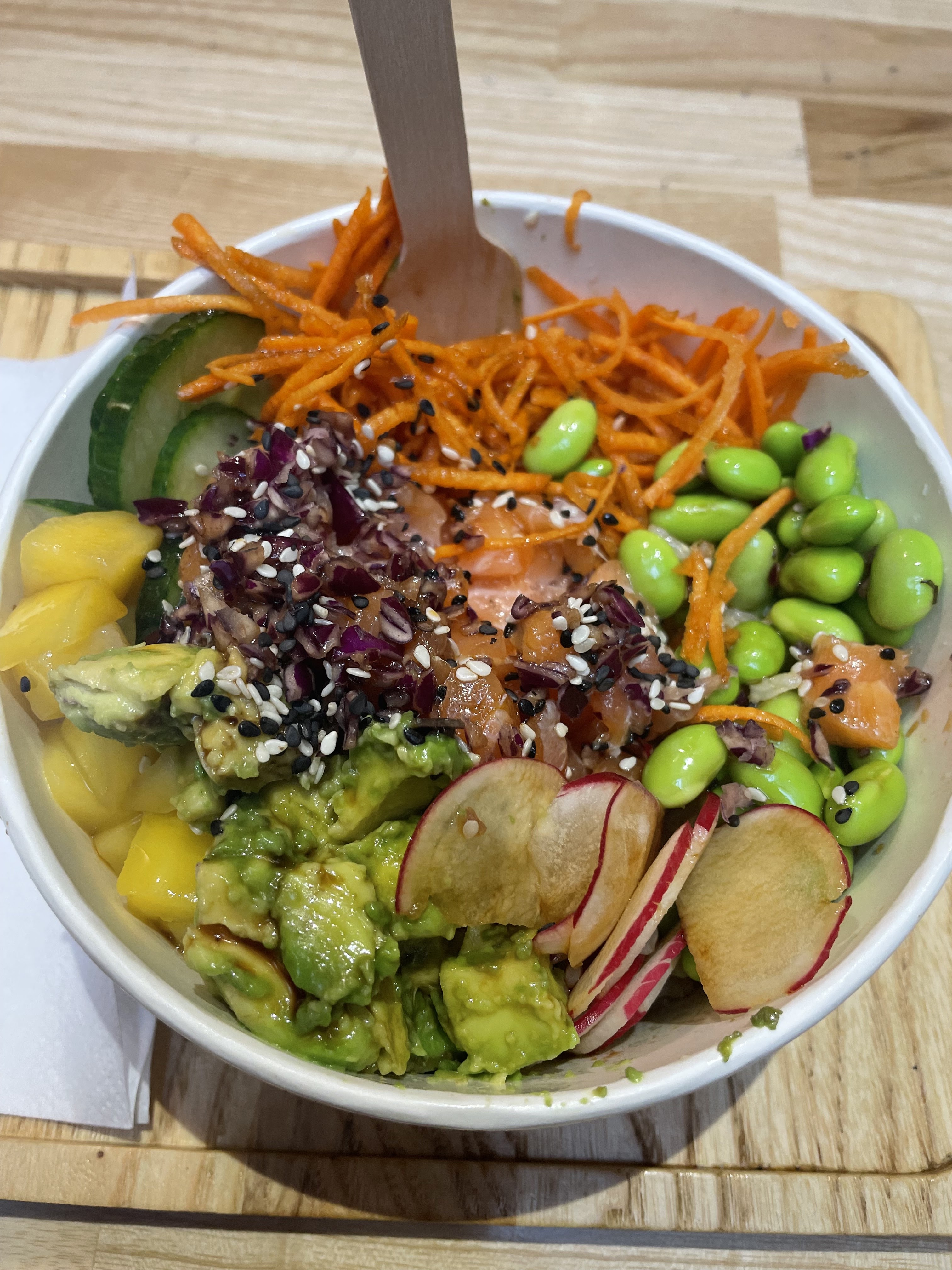 Déçue. J’avais déjà été déçue une première fois en livraison (poisson avec odeur, avocat noir, ingrédient manquant) puis je passe il y a pas longtemps devant le restaurant en ville et je décide de prendre à emporter. Quand j’ouvre 10 min après chez moi, le saumon était ultra gras sans goût, la mangue marron, le pire l’avocat tout pourri et noir, caché sous la coriandre. Comment peut-on verser ça consciemment dans le bol en le préparant ? J’étais la seule cliente en plus.. je ne rachèterai plus, j’ai tout jeté..