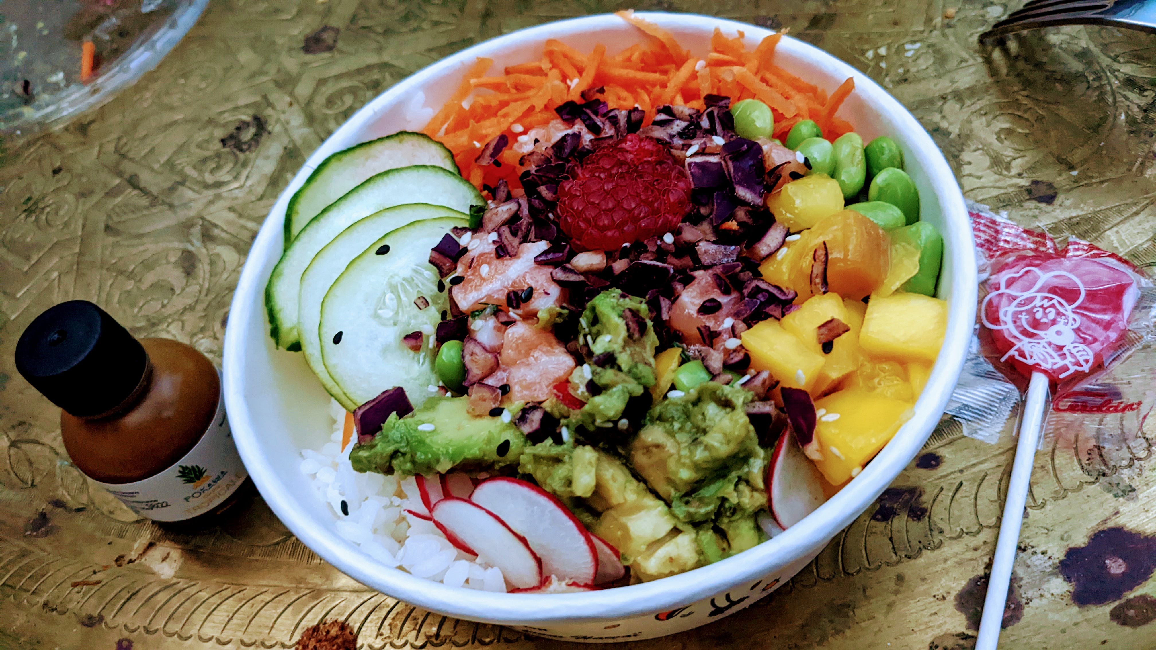 Depuis le temps que je l'attendais... A emporter, vous repartez avec votre poke bowl, une fourchette (pas en bois, donc agréable en bouche), un petit mot d'amour, une sucette, le tout dans un jolie sac. C'était delicieux! La petite sauce spicy mayo, relevée comme il le faut! Je recommande ++++