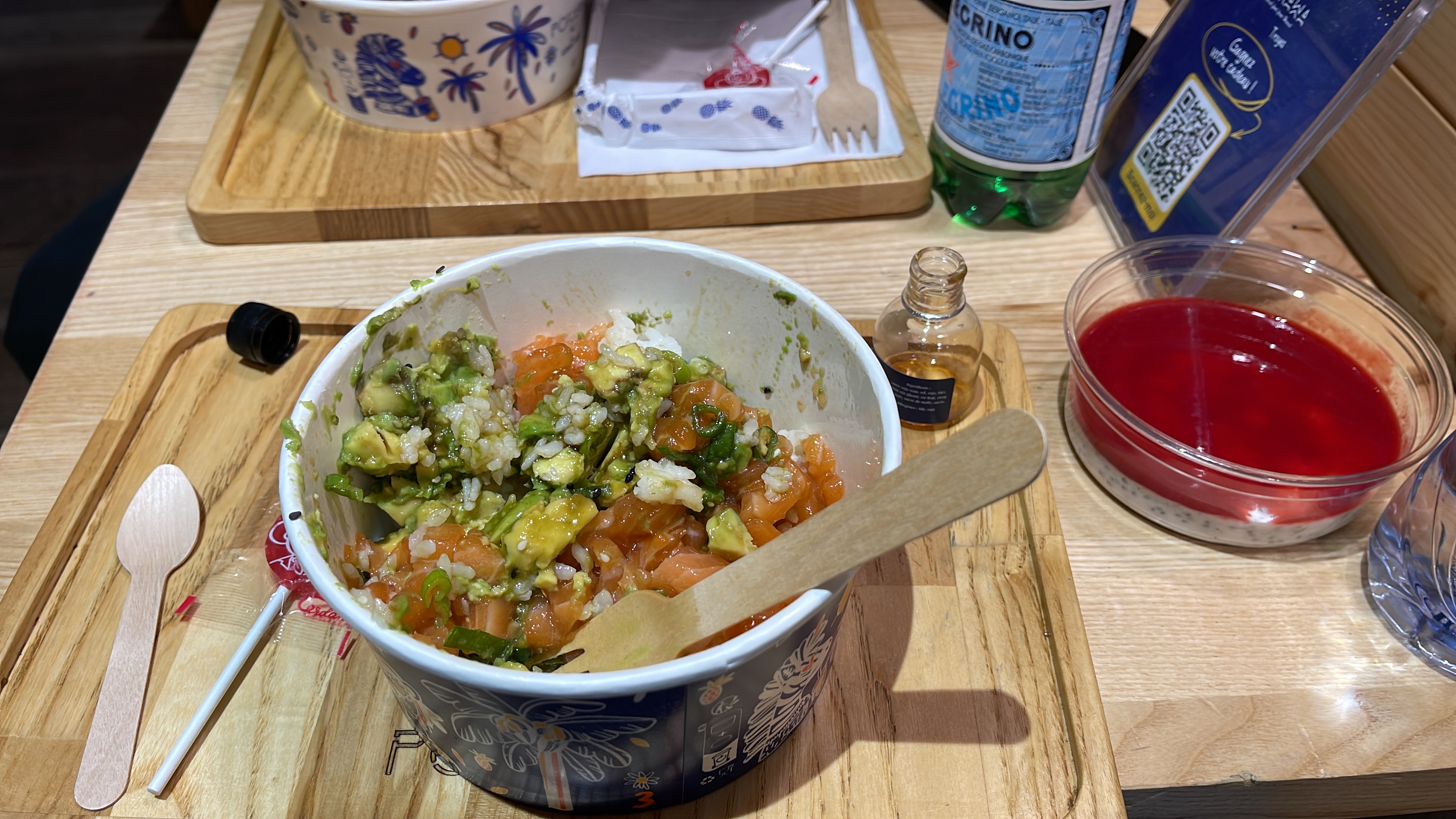 Excellent ! 6/2/22 J'ai pris une formule avec mon copain, il y a 2 bornes disponible à l'entrée directement sur votre gauche. Pour moi formule Poké super protéiné, avec une limonaid et en dessert le pudding vegan. J'adore votre limonaid, rafraîchissant et pas trop sucré, le pudding 🍨 je n'aime absolument pas, les goût et les couleurs ... Pour la Poké un régal, bémol, nous n'avons pas eu les sauces comme vous pouvez voir sur les photos, contrairement aux autres clients, nous n'avons pas osé en faire la réclamation, mais bon, sans la sauce la poké est top tout de même. Service et serveur rapide et agréable. Prix haut, mais de qualité. La taille médium largement suffisant. Décoration et ambiance agréable, même si le lieu est tout petit, vraiment petit. Je me demande si nous aurons toujours de la place .. Je mange pour la 1er fois dans un couloir😅 Je recommande vivement