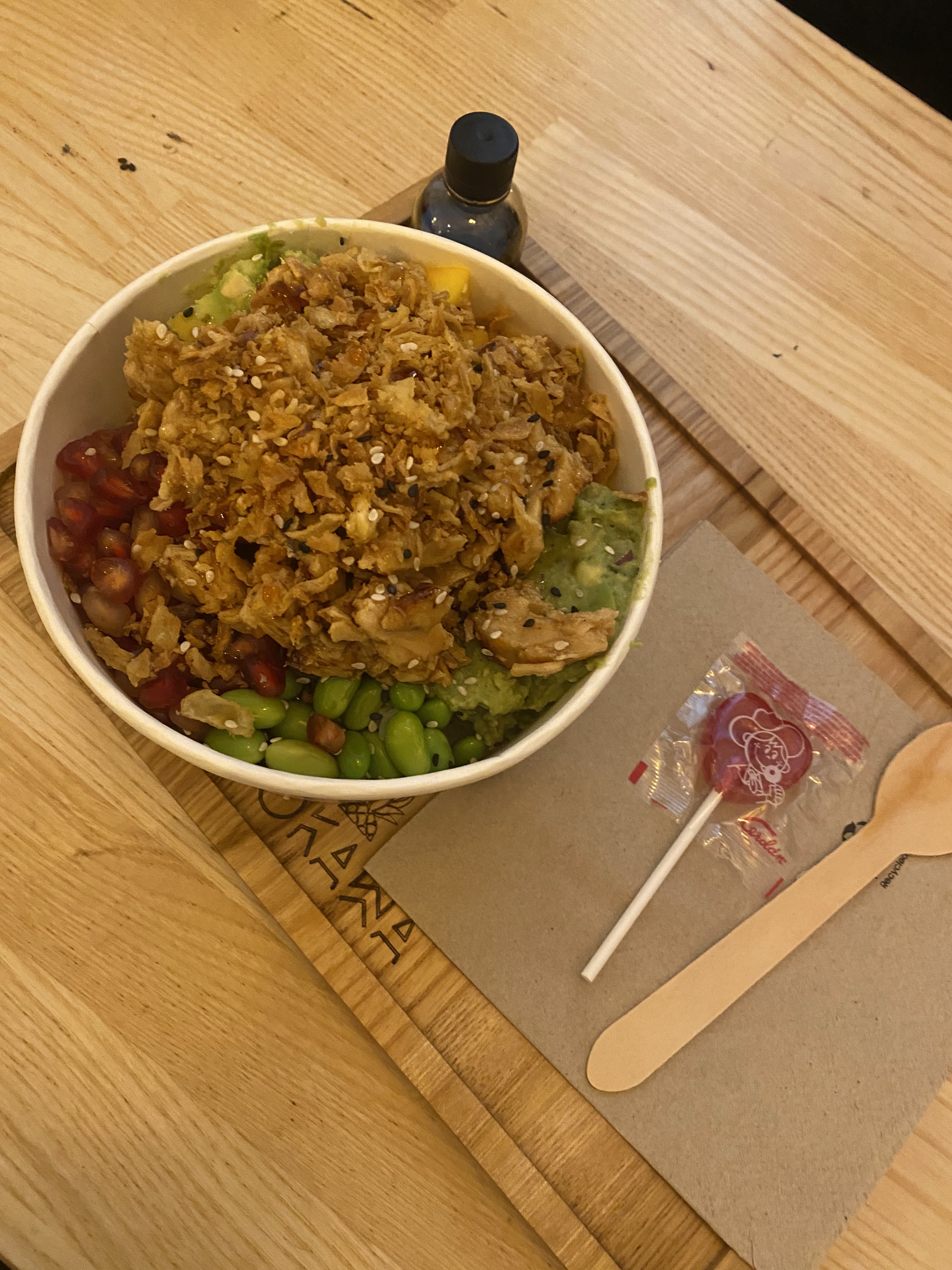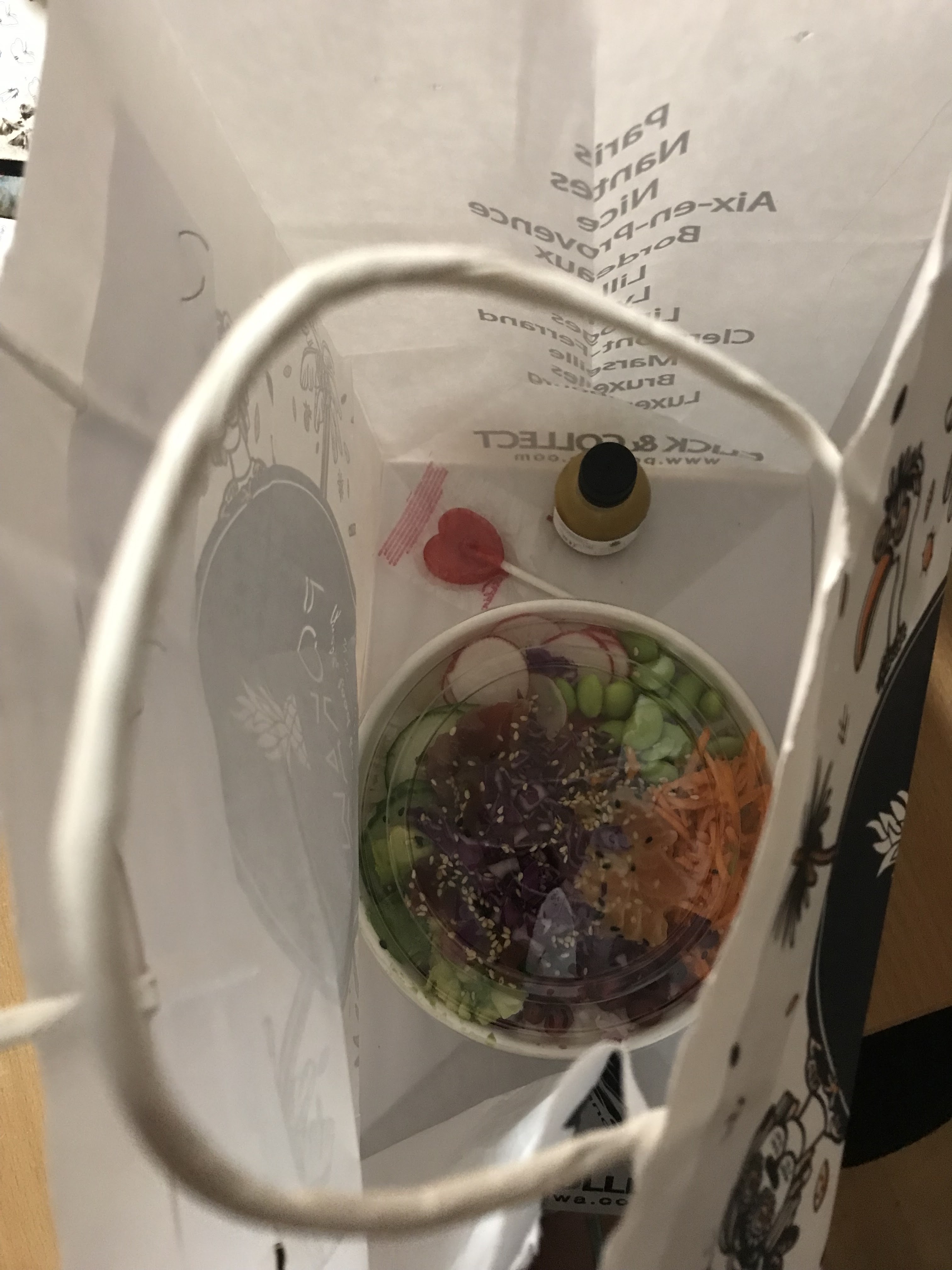Commandé par Deliveroo… Tres satisfaite du délais annoncé qui a été respecté et de la fraîcheur du produit!… J’ai commandé un pokbowl superproteiné avec grenade (miam)… Une jolie attention m’attendait en ouvrant mon sac…. (Constatez par vous même sur la photo) merci 🙏🏽🙏🏽 ✨✨ Aussi, je recommande et la prochaine fois je n’hésiterai pas à me déplacer! ^^