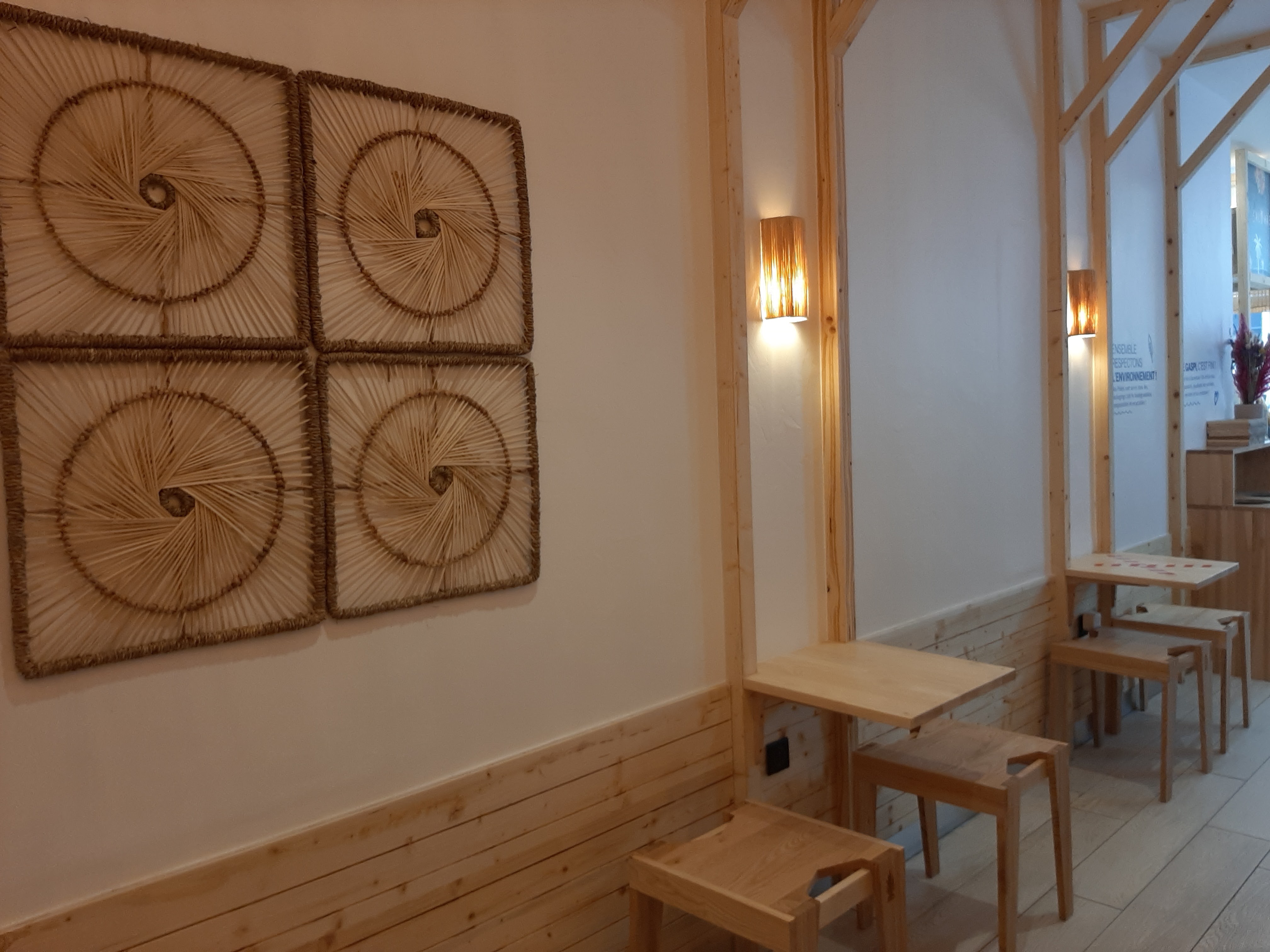 Service à emporter rapide, plat de qualité et atmosphère intérieure chaleureuse grâce aux mobilier bois couleur miel