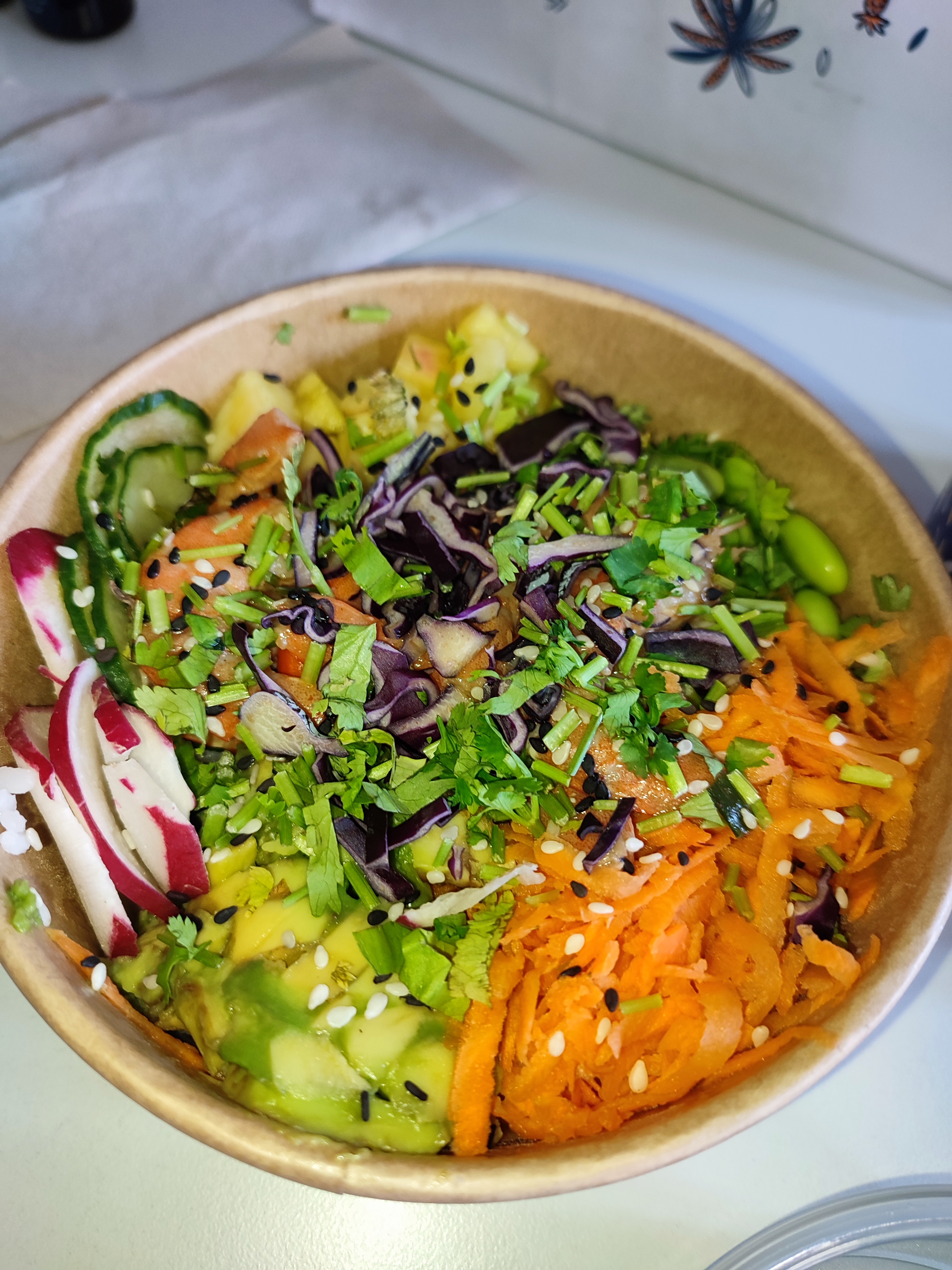 J’ai commandé un poké bowl Pour chez moi, malheureusement les légumes et le riz étaient pas top , riz trop collé et légumes pas frais , l’avocat a changé de couleur , dommage !