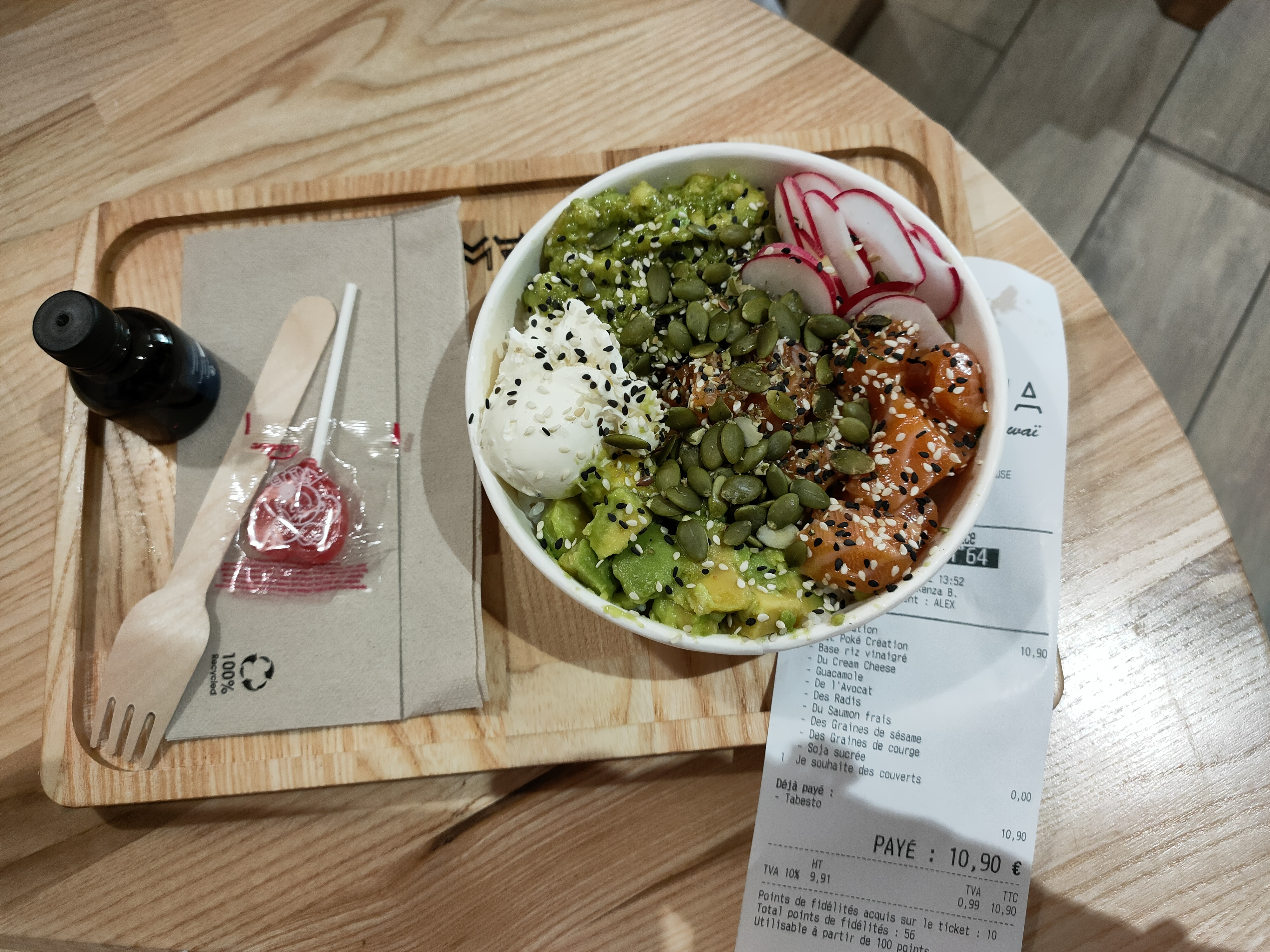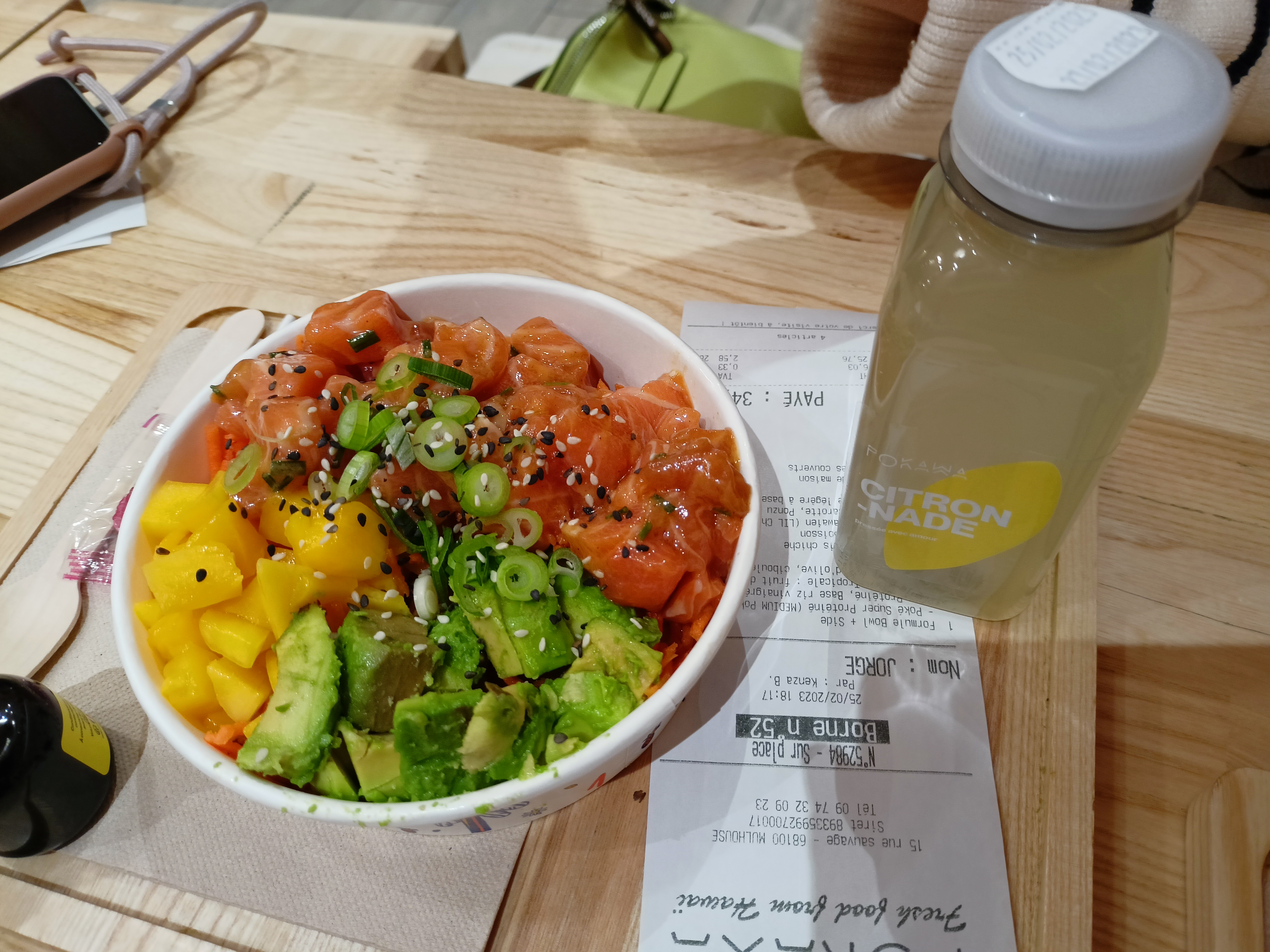 J’avais créé mon propre poke bowl (saumon mariné, ananas, grenade, éclats de pistache, riz noir, mangue…) et je me suis régalé ! Tous les ingredients étaient très frais et c'était tout simplement délicieux, surtout avec la sauce :)