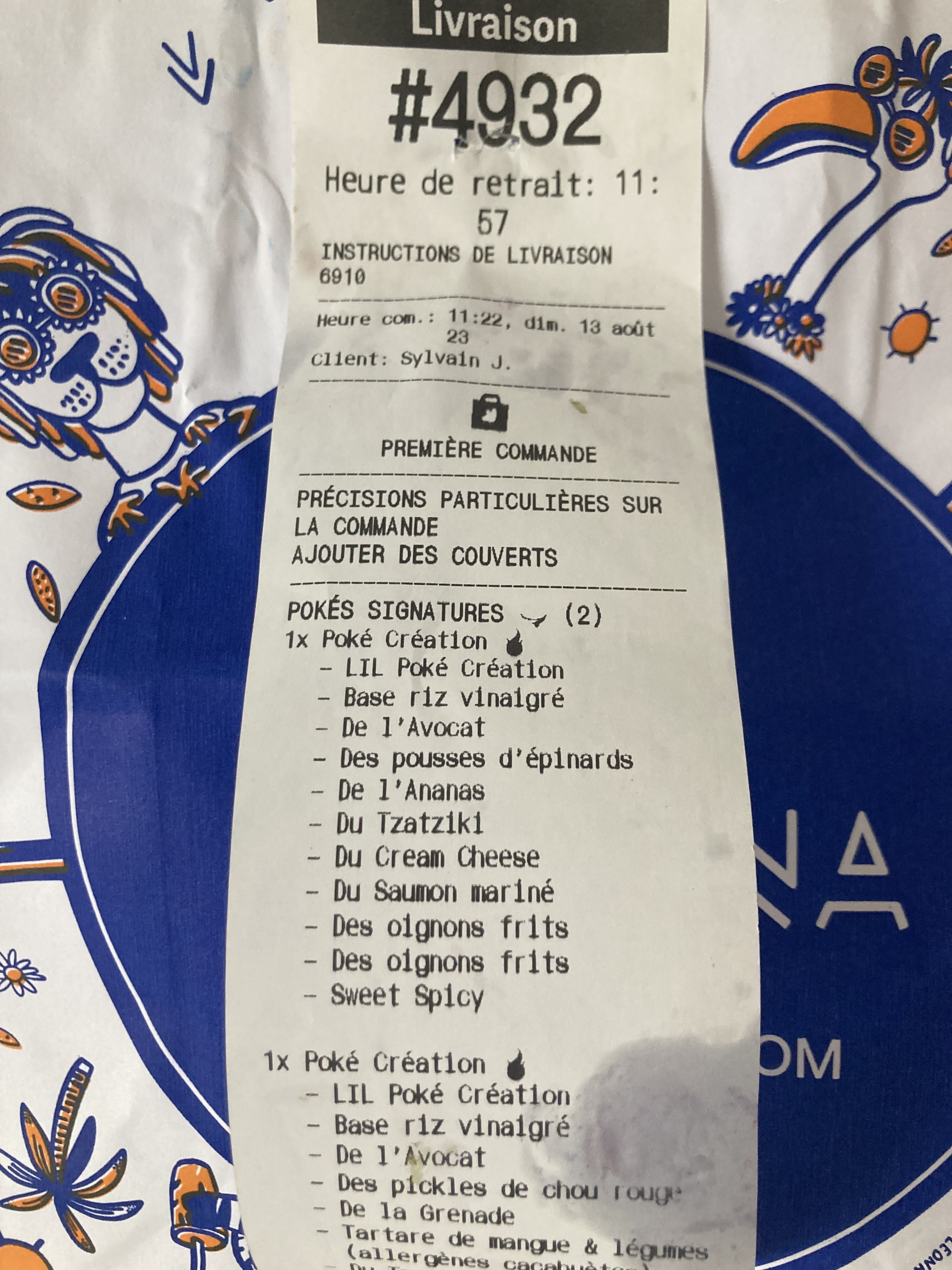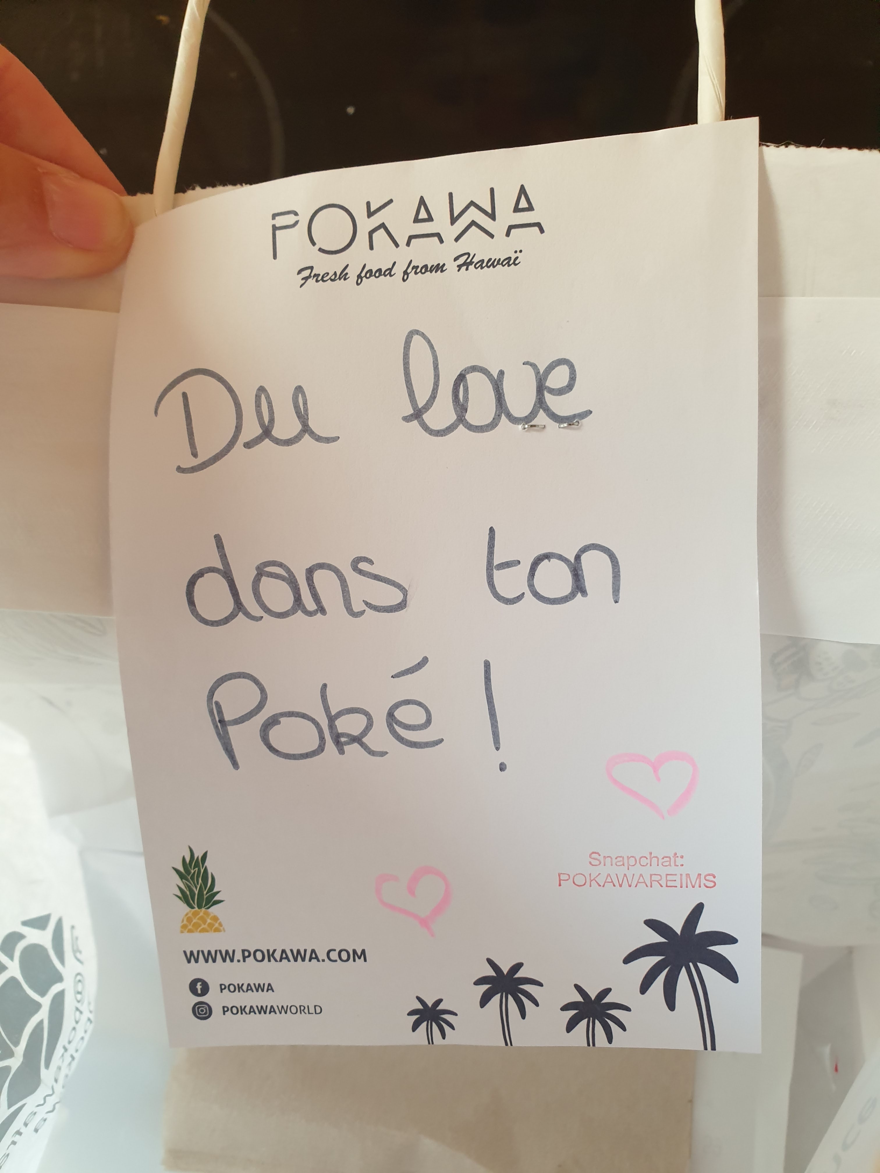 Commande Pokawa pour la pause repas au boulot, très très très bonne découverte ! Les pokés sont délicieux, bien garnis, je recommande. Gros + pour les petits mots adorables dans la commande et les 3 desserts offerts 🥰