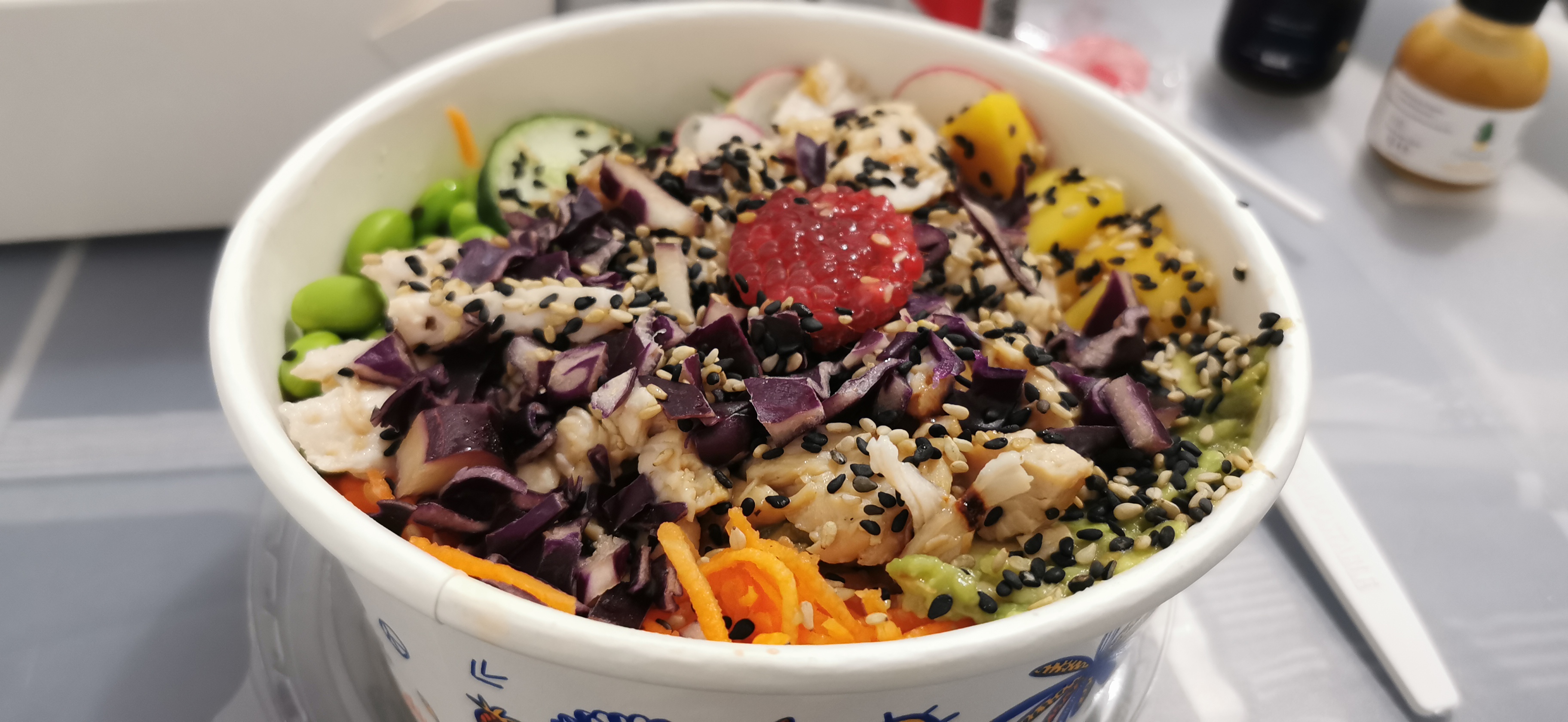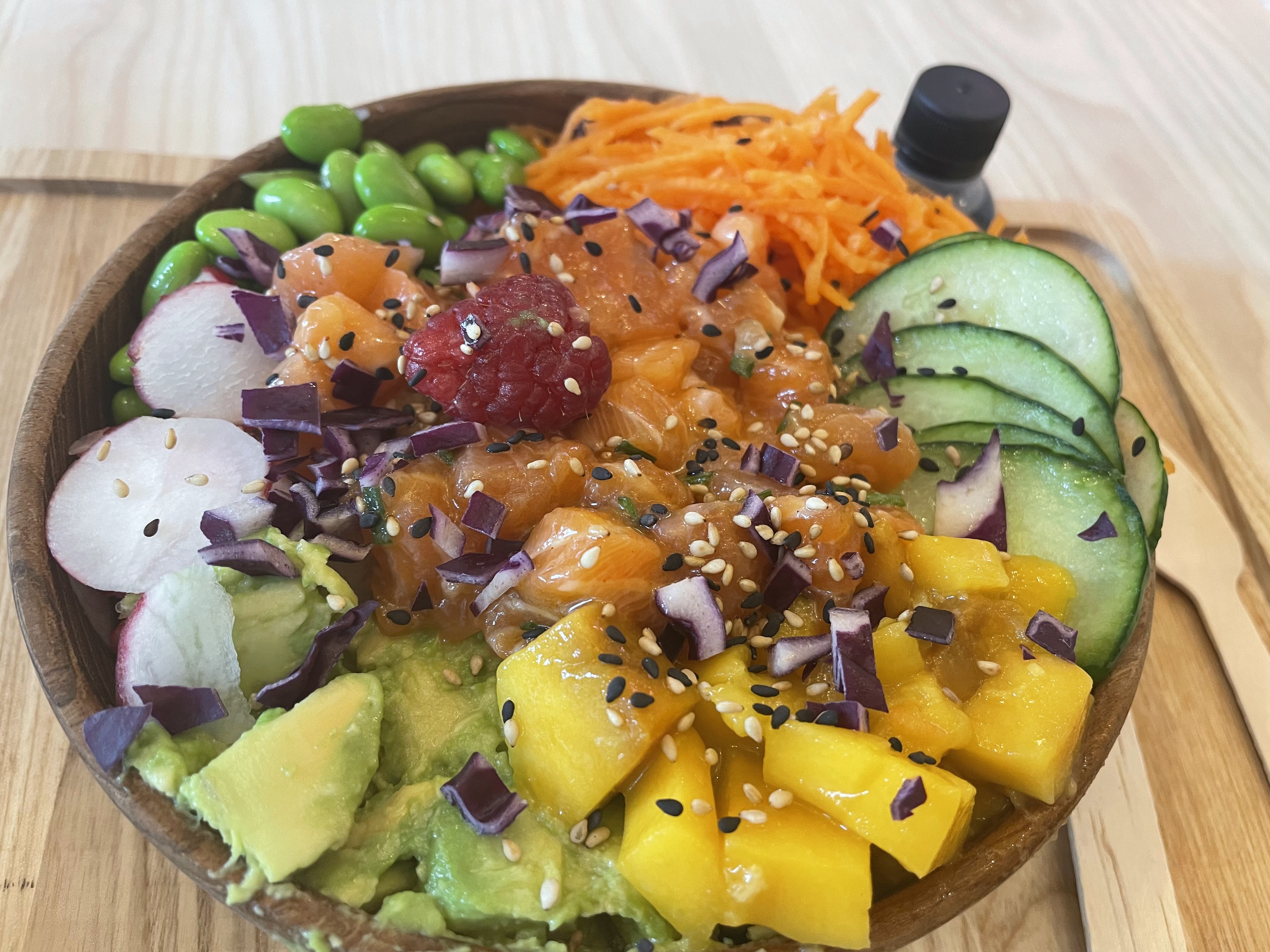 Le poke bowl poulet teriyaki est un délice avec l’avocat et la mangue fraîche je le recommande !
