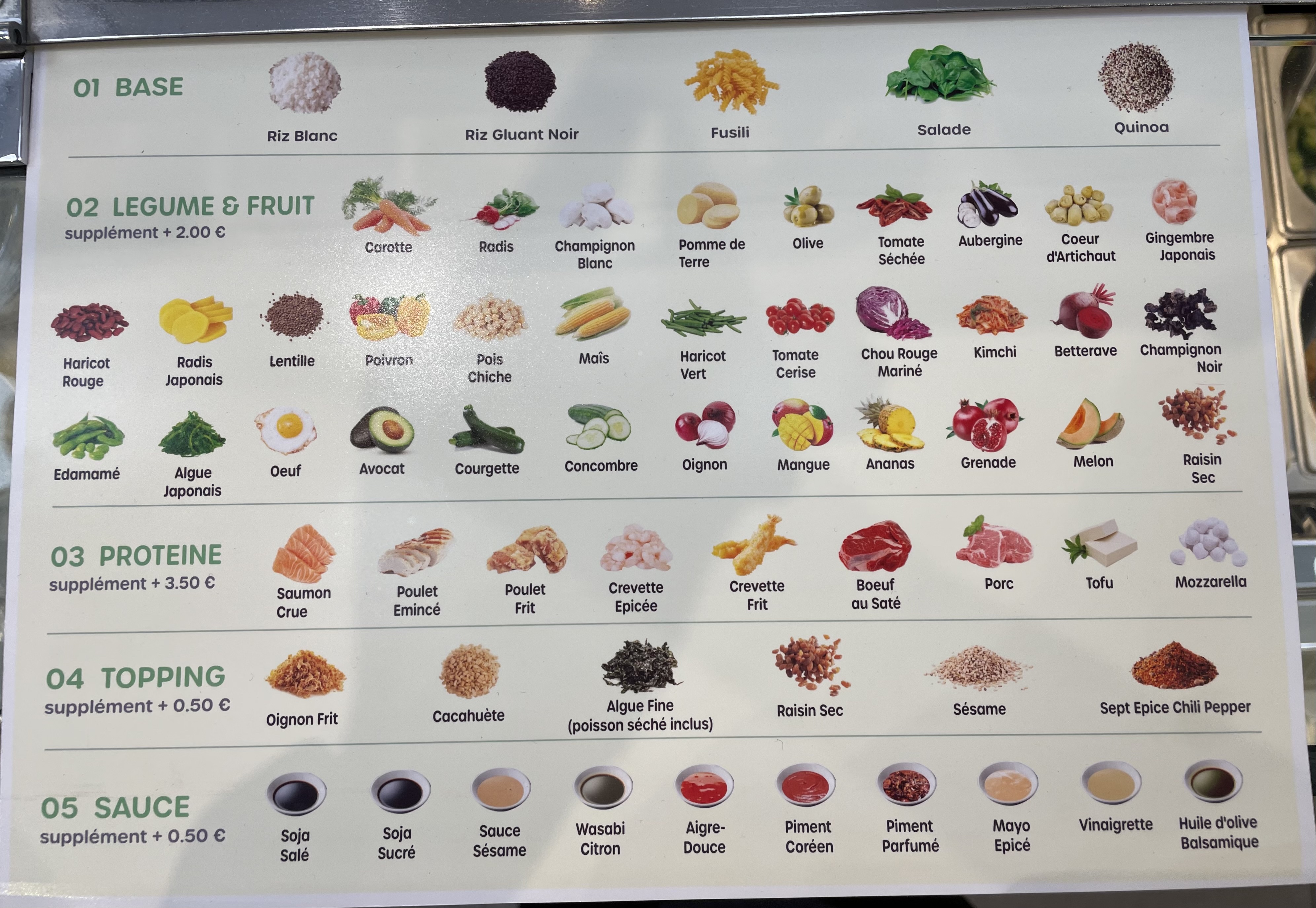 Expérience très décevante. Venus le soir, on découvre uniquement après avoir commencé à commander que la moitié des ingrédients normalement disponible pour créer son poké ne le sont plus (il manque notamment des basiques comme avocat, oignons, poulet frit ...). Je trouve cela particulièrement irrespectueux de ne pas prévenir le client dès le début car on se retrouve à payer après avoir fait des choix par défaut avec le peu qu'il reste.
