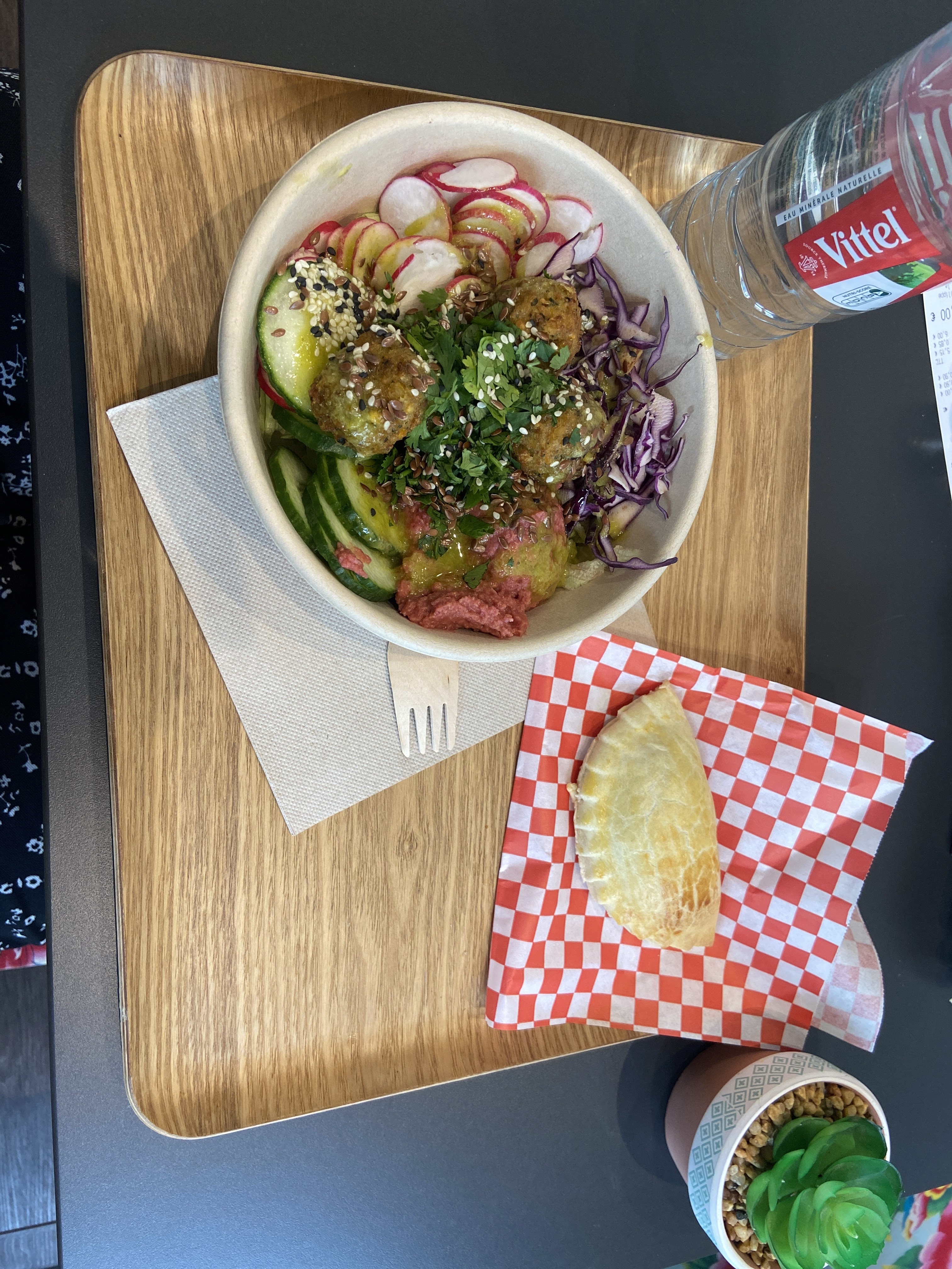 Repas sain avec des produits frais. Rapide et délicieux, le tout dans un cadre chaleureux. Très bon accueil ! Top !
