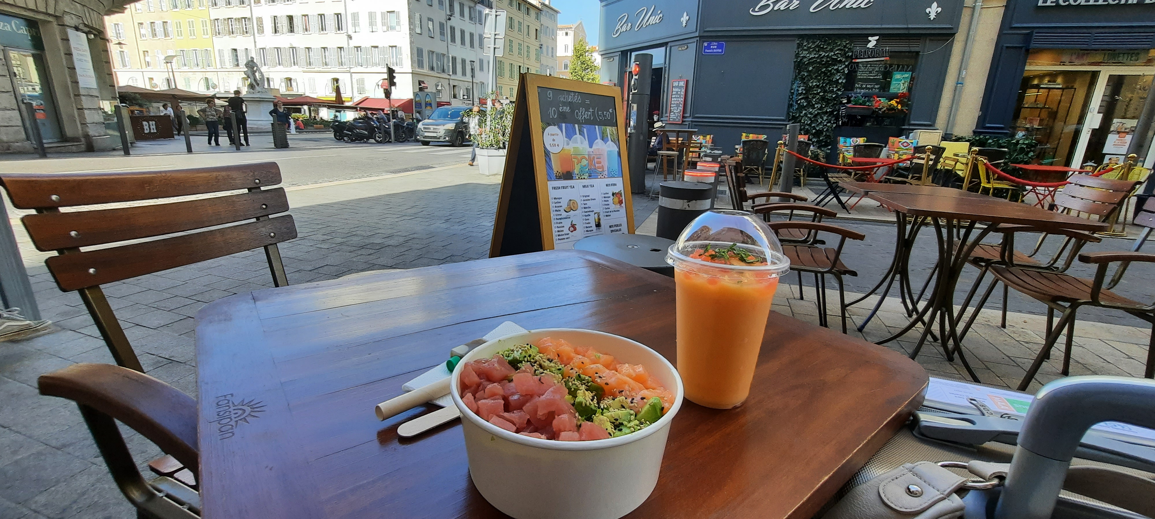 Passez prendre un buble tea et un Poké fruit après un déjeuner à côté et c’était agréable