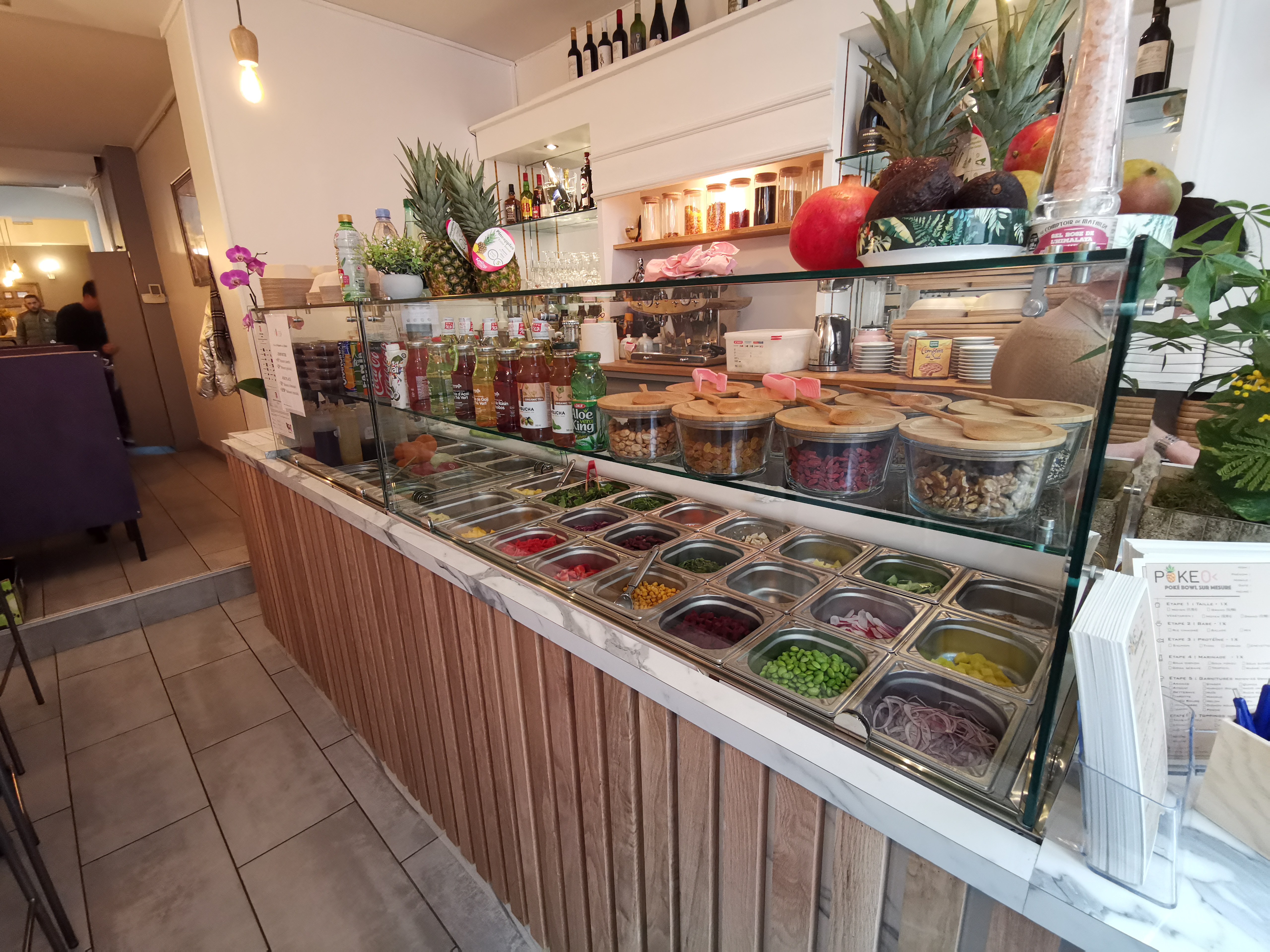 Le restaurant est plutôt grand (petite façade mais une bonne profondeur). Il y a un large choix de viandes, ingrédients et toppings... Les produits sont frais et de qualités. Si vous avez vos préférences en Poké, vous allez vous retrouvez avec un magnifique Poke Bowl, coloré et surtout délicieux ! Le grand Poke Bowl (~14€) est servi dans une bonne quantité et le service plus réactif que je ne le pensais. Le seul défaut que je peux dire (en fait il y en a pas vraiment) c’est peut être le monde, la queue aux heures de grandes affluences ! PS : la sauce yuzu wasabi est à essayer !
