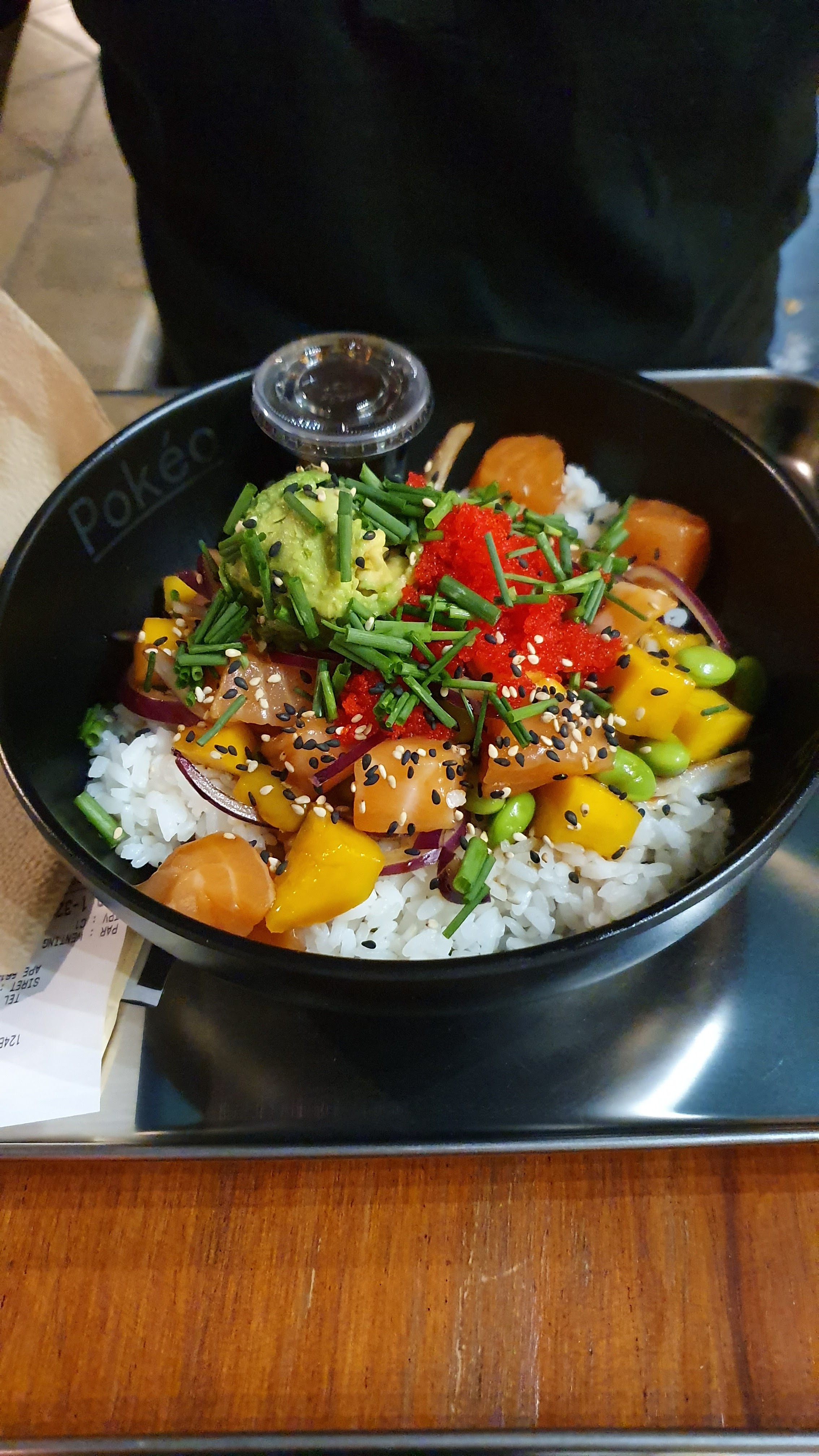 Je fais pour le moment un comparatif des enseignes proposant des Poké et celui ci n'est pas exceptionnel. Le prix est vraiment agréable, environ 10 euros. Les quantité correctes, mais ne pas s'attendre à beaucoup de protéines ou de bon gras (comme l'avocat). Niveau goût, bha là c'est pas exceptionnel. Le ris n'est pas assaisonner ( même peut être un peu trop cuit, car trop mou), et le poisson non plus ni le reste d'ailleurs. La seule chose qui assaisonne c'est la sauce. Alors que le principe d'un Poké c'est des carrée de poisson mariné mais là non. Donc bon, j'ai essayé, mais je ne reviendrai pas. Ni bon ni mauvais, déçue car j'aurai pu le faire chez moi.