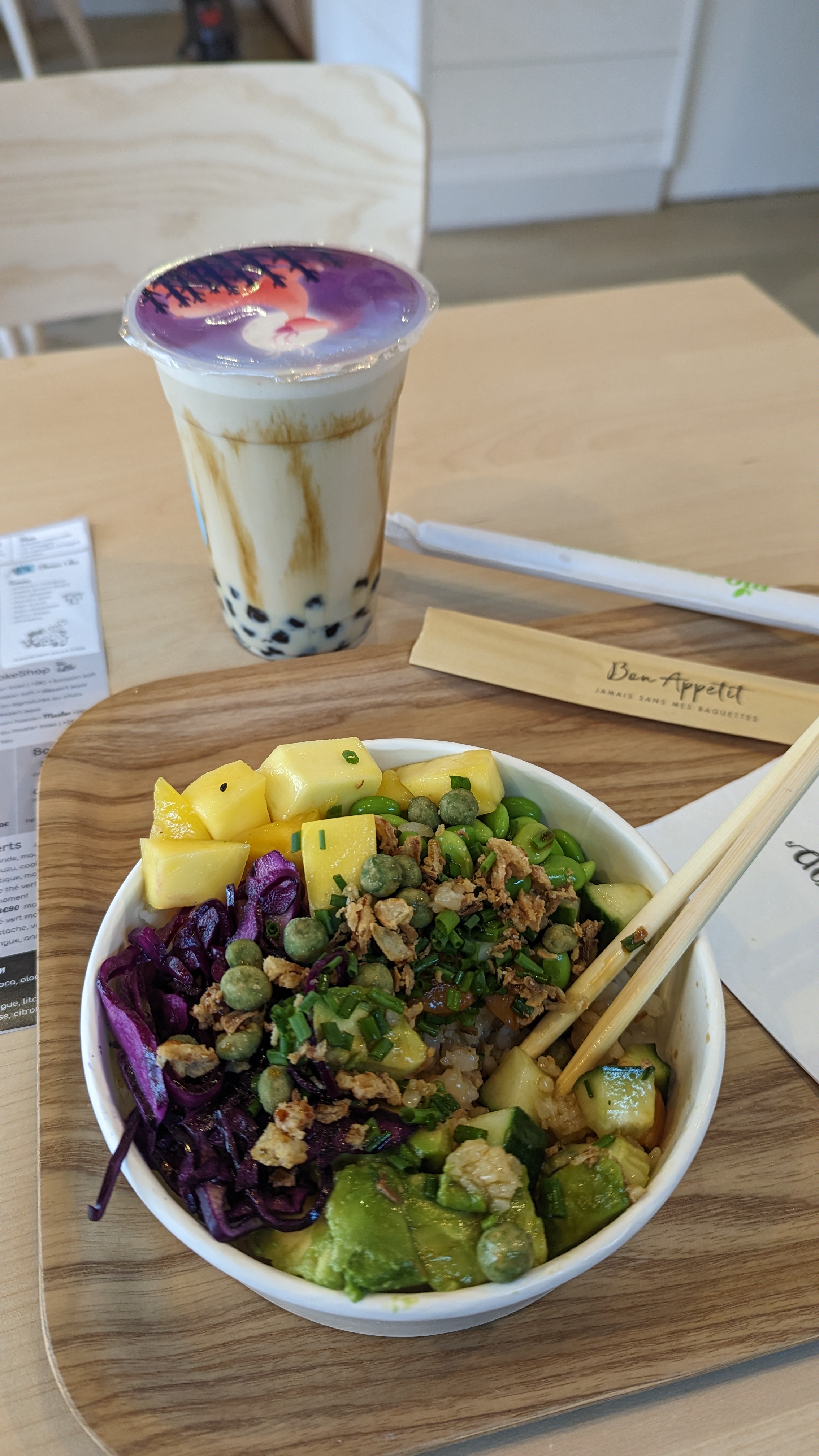 Très bons poke bowls et bubble tea a 5,50€. Beaucoup de choix.