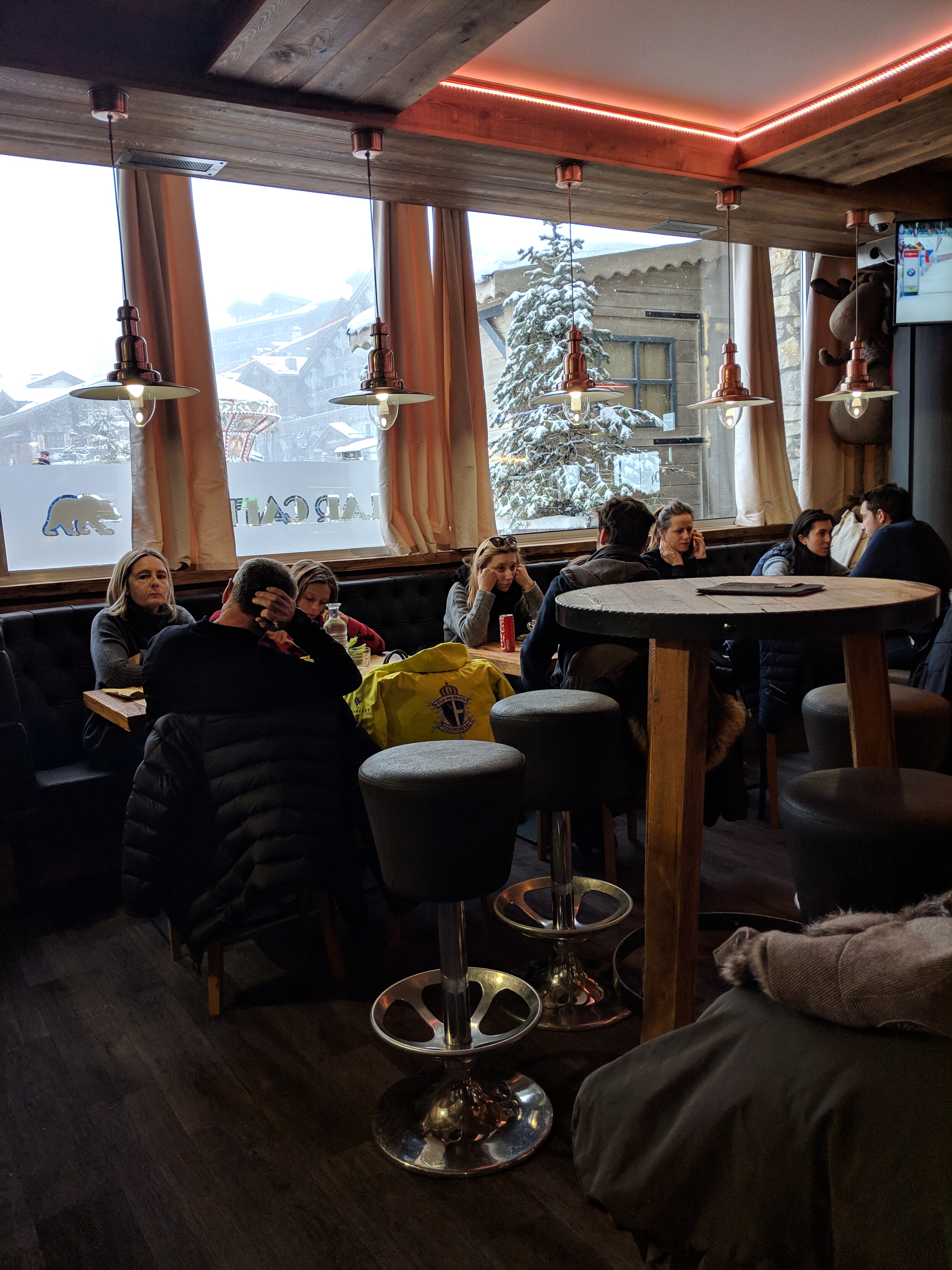 Très bon emplacement à côté de toutes les remontées mécaniques à Courcheval 1850m. Nous sommes venus ici plusieurs fois et leur chocolat chaud est à tomber par terre. C'est un prix raisonnable pour la région. Vous faites la queue à l'intérieur et mangez à l'intérieur ou à l'extérieur. Il n'y a pas de service à table, ce qui ne me dérangeait pas. C'est un véritable espace décontracté pour prendre un café ou un déjeuner. Nous avons déjeuné et les sandwichs étaient excellents.