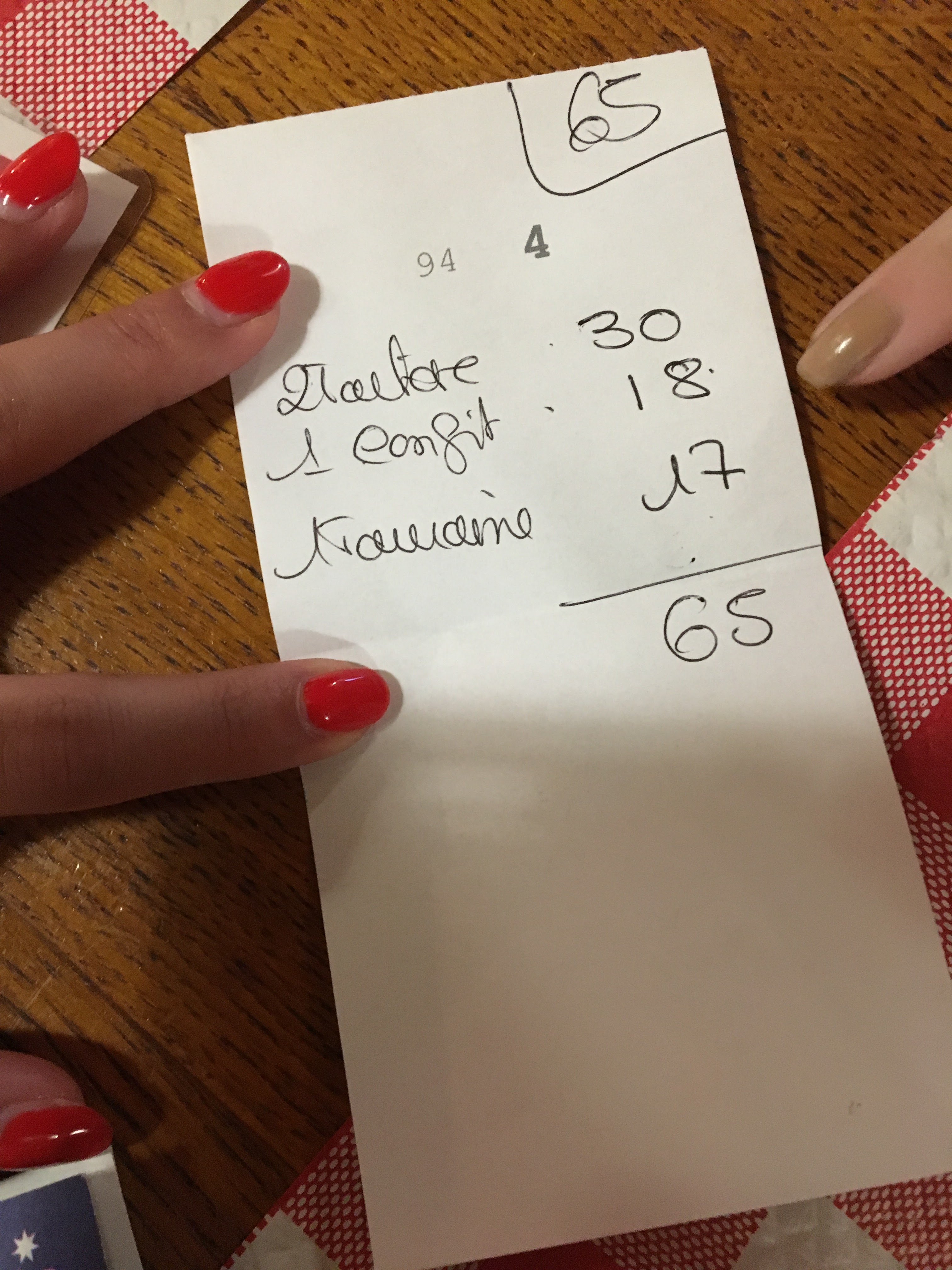 Pas très sympathique pour un voyageur solitaire. Ils m'assoient au milieu de deux couples. Quoi qu'il en soit, la nourriture est bonne. J'ai aimé le bœuf bourguignon. Et ce n'est pas cher, 13 euros. La salle de bain était une surprise totale. Ils n'ont qu'UN bain turc. Je ne sais vraiment pas pourquoi... Je ne pouvais pas l'utiliser.