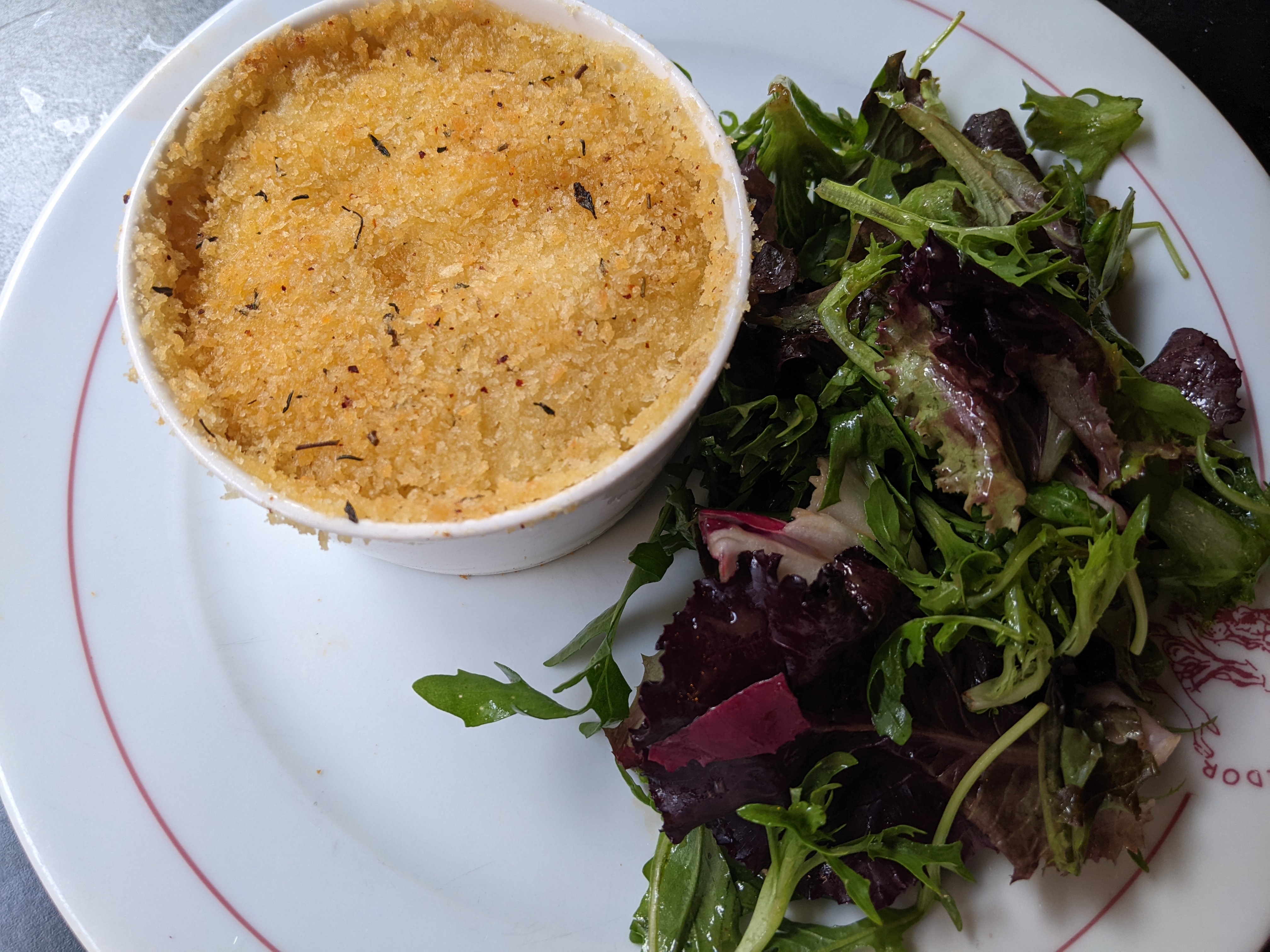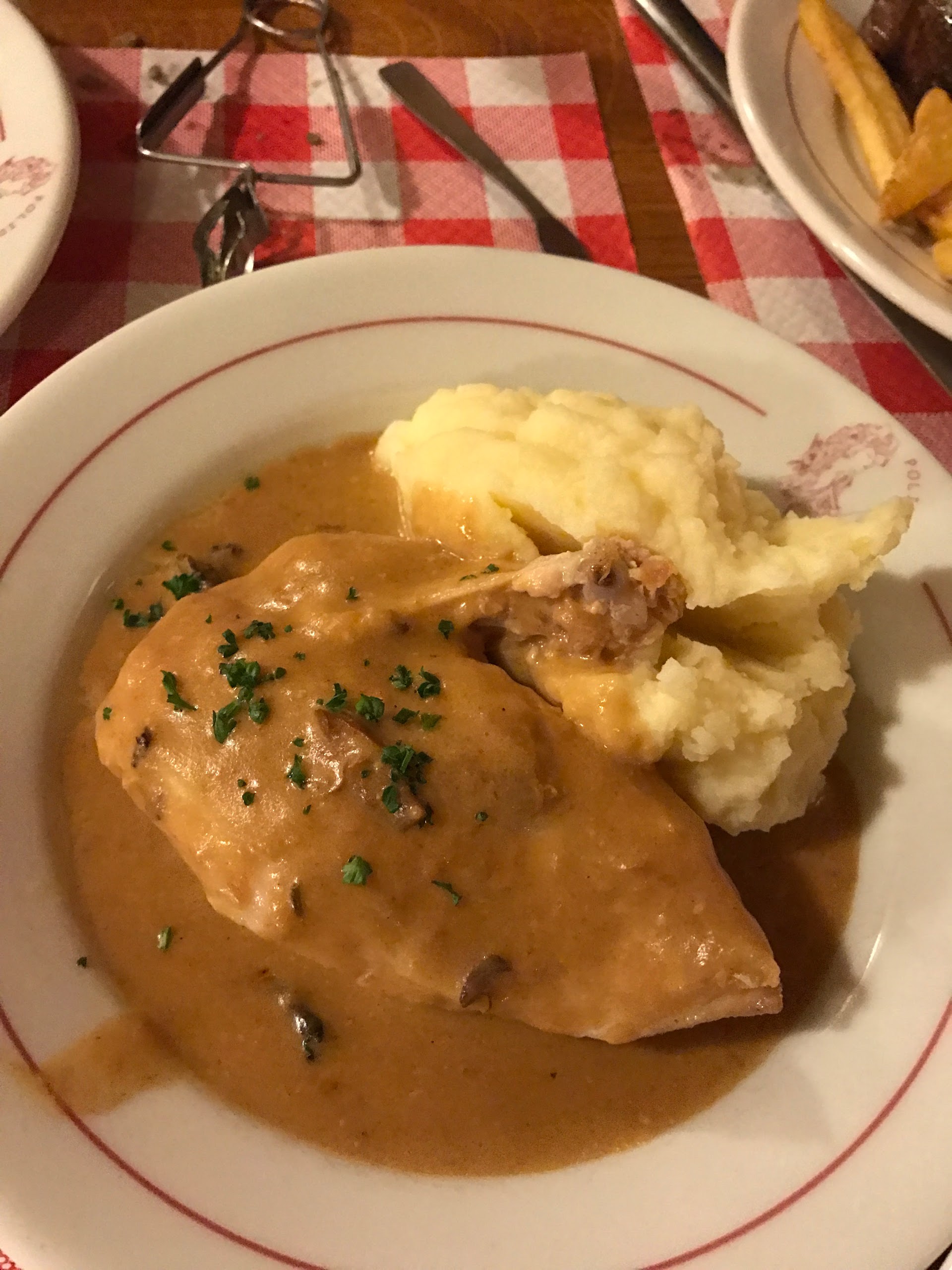 Le confit de canard n'était pas disponible le midi. J'ai pris le poulet et la purée de pommes de terre à la place. Nourriture décente. J'y suis allé vers 13 heures un vendredi et il n'y avait que deux ou trois autres tables occupées. Je ne sais pas quel était le problème avec la serveuse, mais elle avait l'air plutôt maussade. Quel est l'intérêt de dire « Bon Appetit » si vous le dites avec un regard noir et presque en vous lançant le plat ?