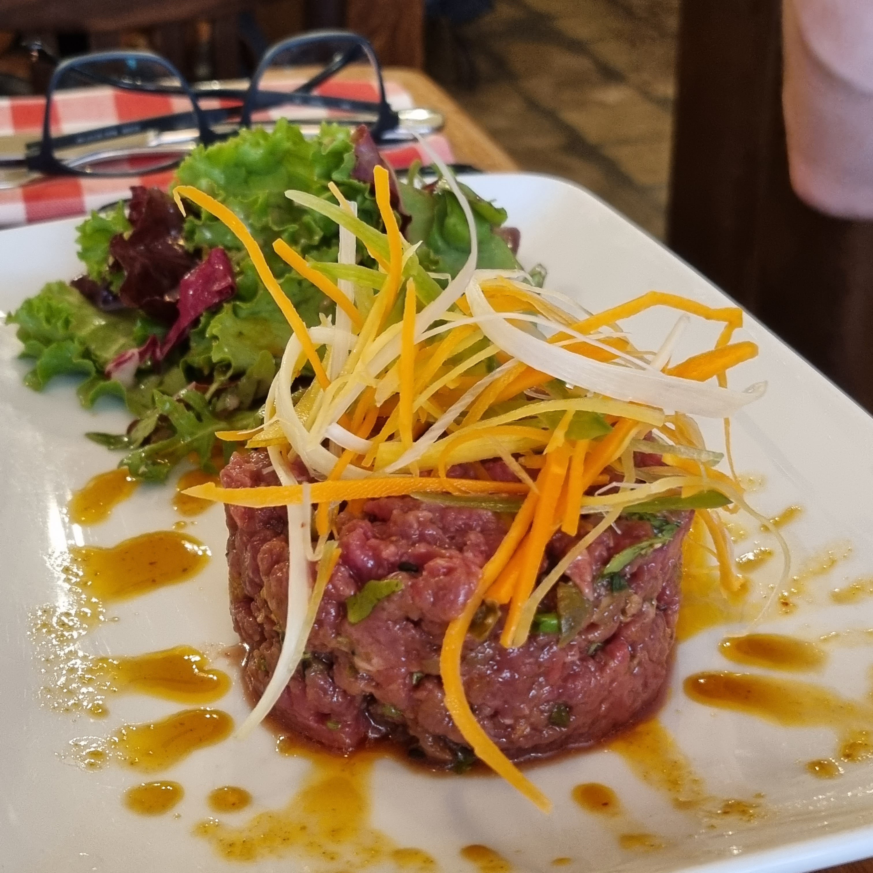 Dîner (entrée, assiette et dessert) à 22h00 au prix avantageux. J'ai choisi des mini raviolis (crémeux), du bœuf (grosse portion) & des frites et une tarte (genre tarte aux pommes) pas trop sucrées ; le serveur était très sympathique, patient avec mon français quasi inexistant. Nous avons visité vers 20h45. Un mardi. Était occupé et bruyant.