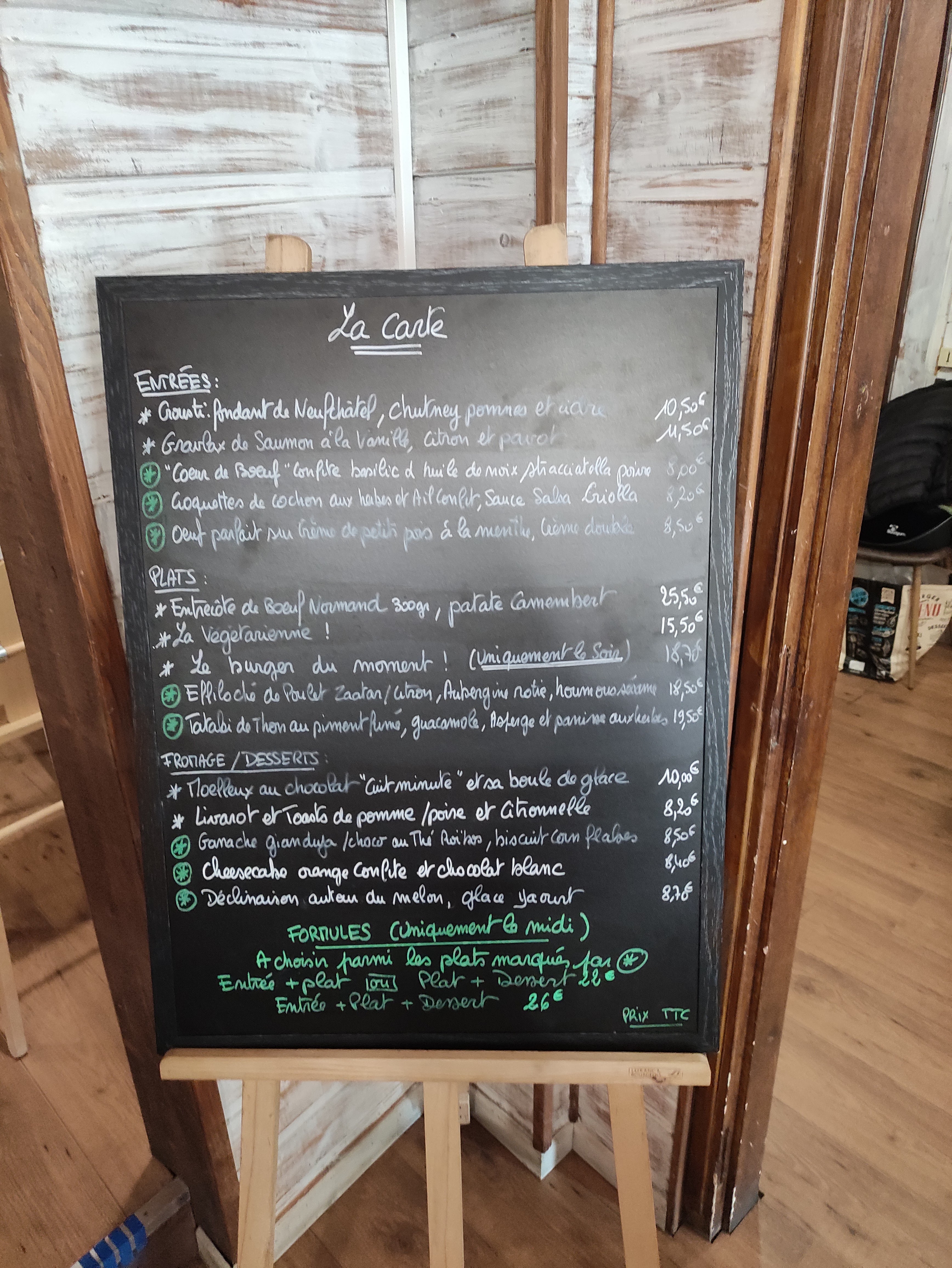 Carte originale et plats excellents. Entrées et desserts autour de 7-8 € / plats autour de 17 €. Vaut largement le prix car la qualité est là. Acceuil très aimable. On nous a proposé un plat spécial hors carte pour le petit dernier. Toute la famille s'est régalé. Je recommande à 200 %