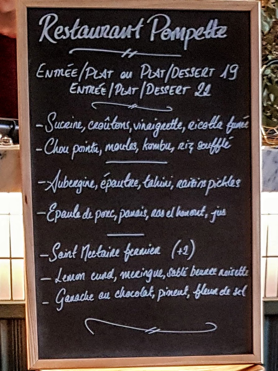 Ce Pompette porte bien son nom, car la très jolie carte des vins incite à bien boire ! Mais côté cuisine, ce n'est pas mal du tout non ! De belles assiettes bien fichues et pas chères au déjeuner (menu à 22€!) avec des beaux produits jusqu'aux pain et café ! Review complète sur le site Restos sur le Grill .fr