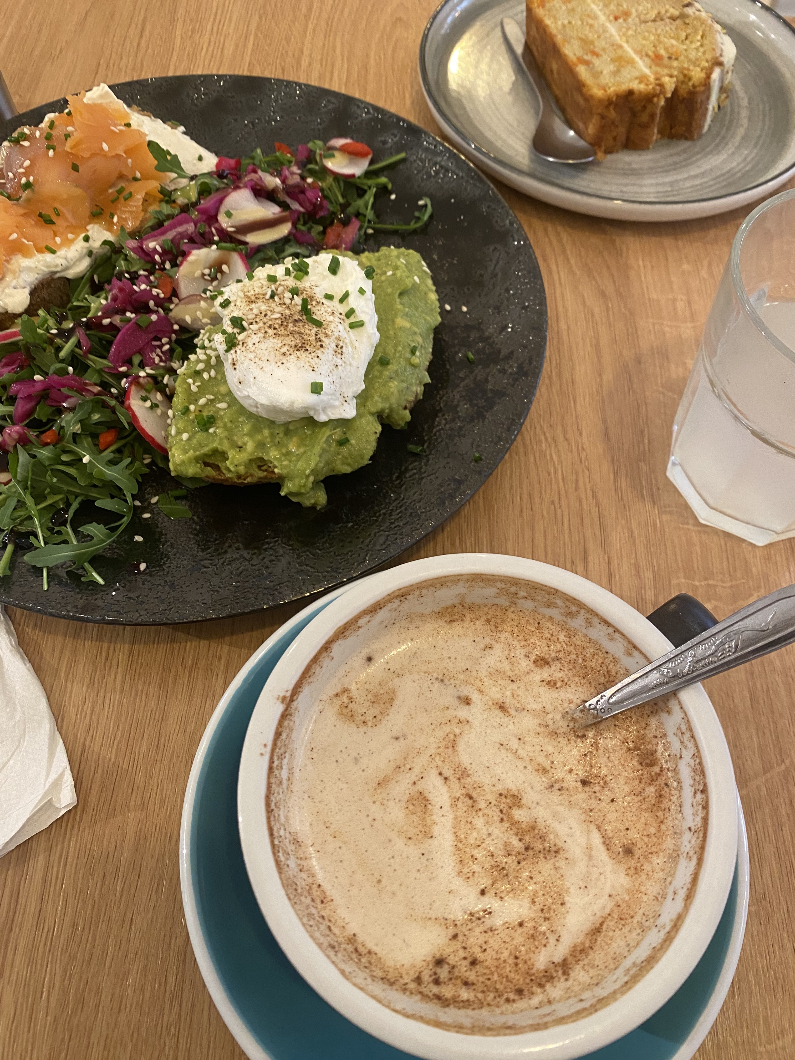 Personnel aux petits soins, Ensemble des plats servi délicieux (pain au chocolat, toast au saumon, carrot cake, citronnade maison) Bon rapport qualité/prix, Adresse à partager sans modération.