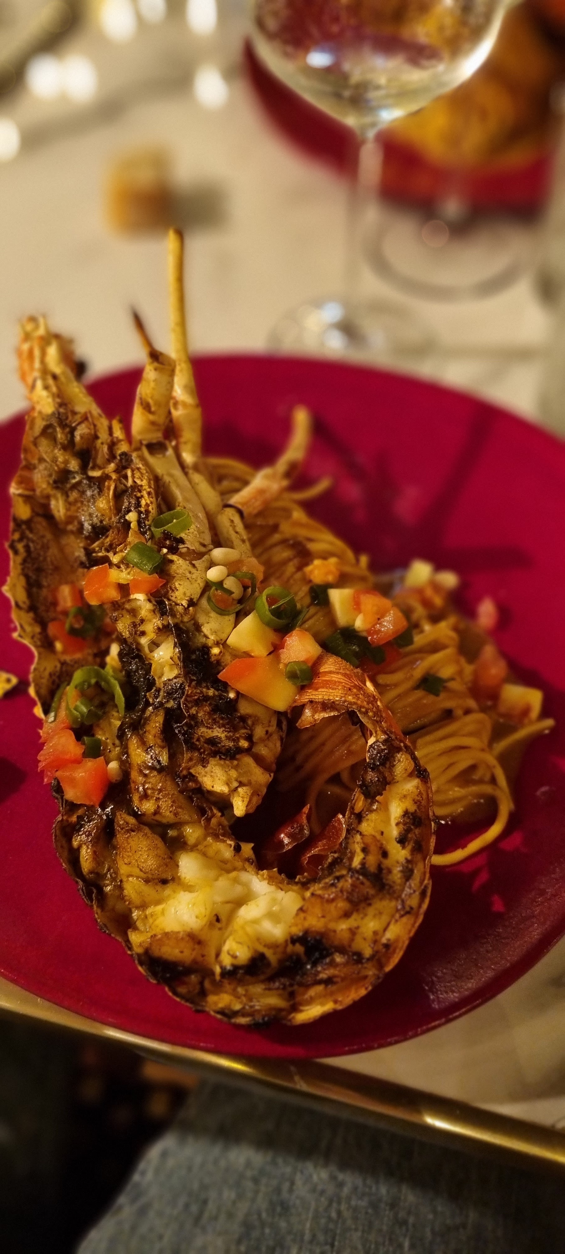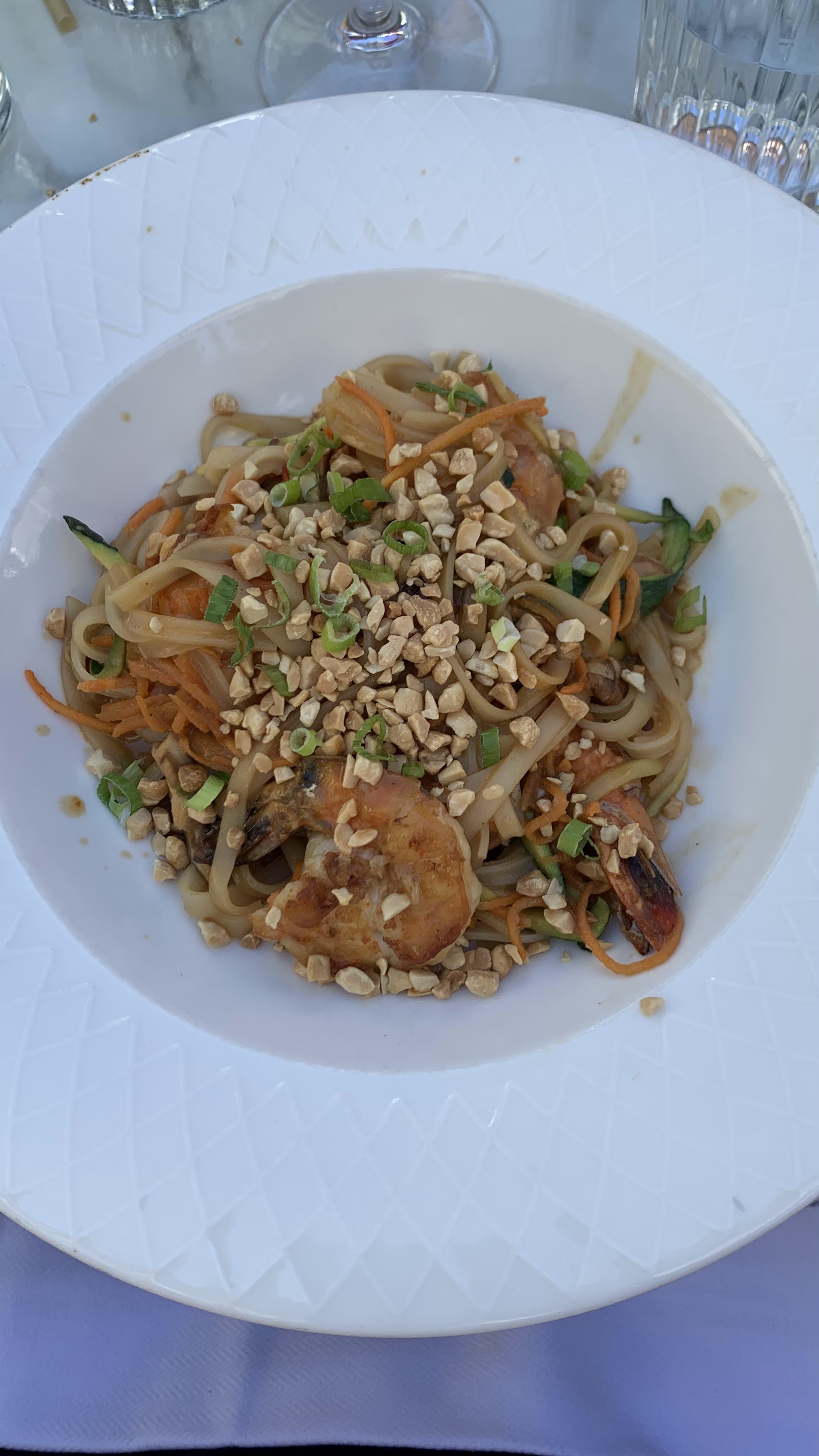 Dîner en terrasse. Belle adresse avec vue sur le Ponant et les décors nocturnes (dame blanches et boules de violettes !). Très bon, très sympa. Saint-Jacques snackées et artichauts crème truffée, 1/2 langouste pasta et tiramisu pour finir 😋