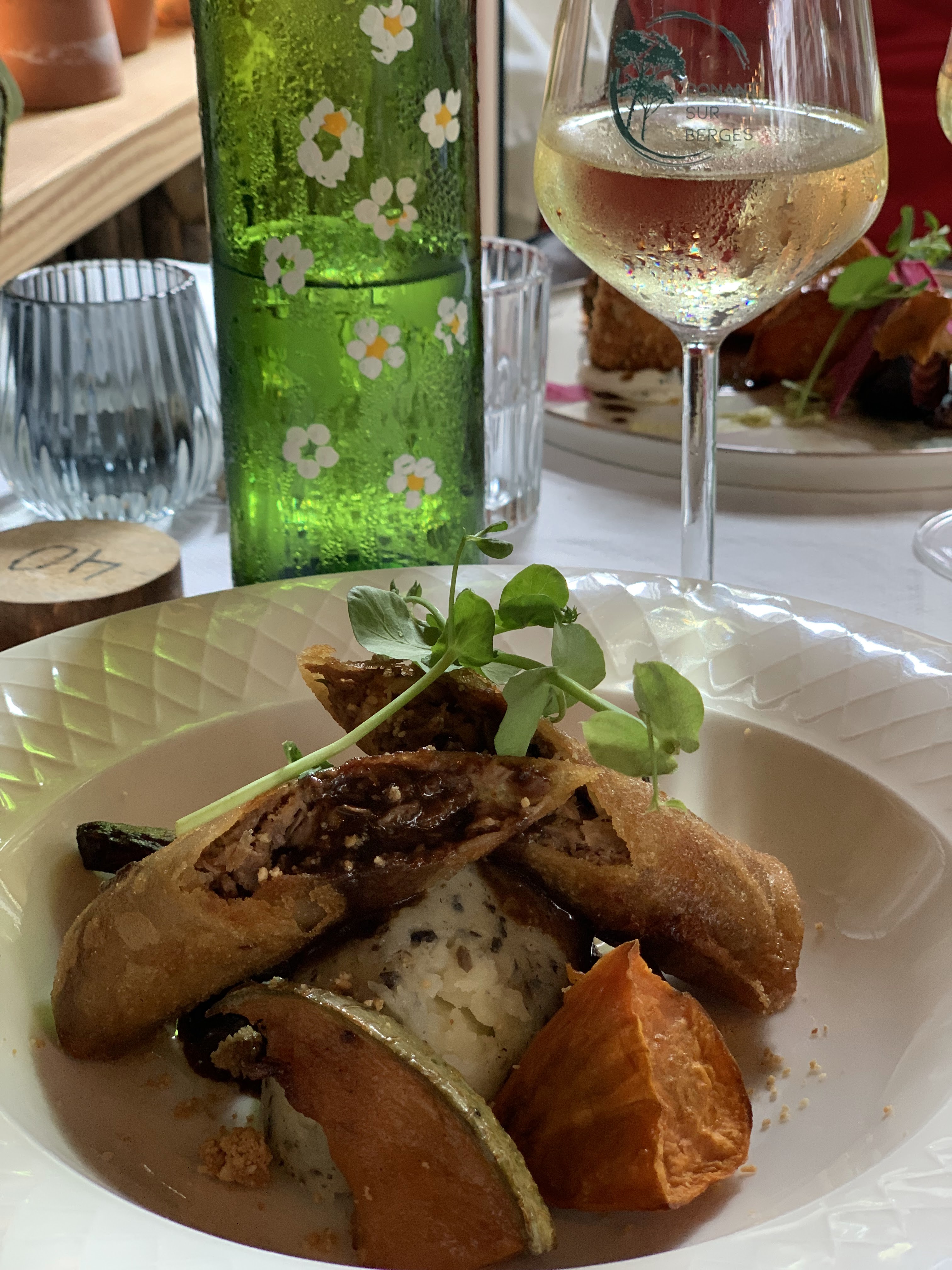 Tout simplement remarquable et succulent. Créatif, belle présentation des assiettes et des saladiers, léger, des legumes, des parfums...Service très agréable et efficace. Sommes allés 3 fois en 3 jours. Verres estampillés de la maison, même la corbeille à pain vous surprend