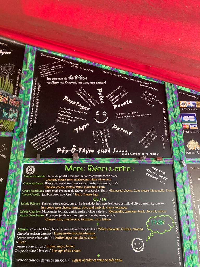 Un autre de mes préférés quand je suis en ville. Les crêpes sont savoureuses et les prix sont corrects, ce qui est difficile à trouver dans leur bel emplacement, le Marché Saleya. En tant que Québécoise, je suis particulièrement impressionnée par le fait qu'ils proposent du sirop d'érable biologique, la vraie affaire aussi. Cependant, ce qui m'a volé le cœur, c'est leur personnel, notamment leur propriétaire « à temps partiel », Jean-Marie. Sa gentillesse ne faiblit pas au fil des années. Son sens de l'humour non plus, qui se retrouve également sur les murs ! Je dirais que lui et son équipe font partie de la qualité de l'expérience.