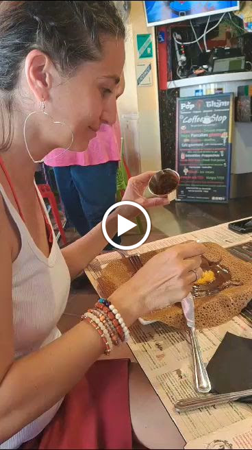 Nourriture délicieuse, crêpes sans gluten incroyables! Je ne pouvais pas faire de gaufres sans gluten mais la crêpe était délicieuse ! Des smoothies fabuleux aussi