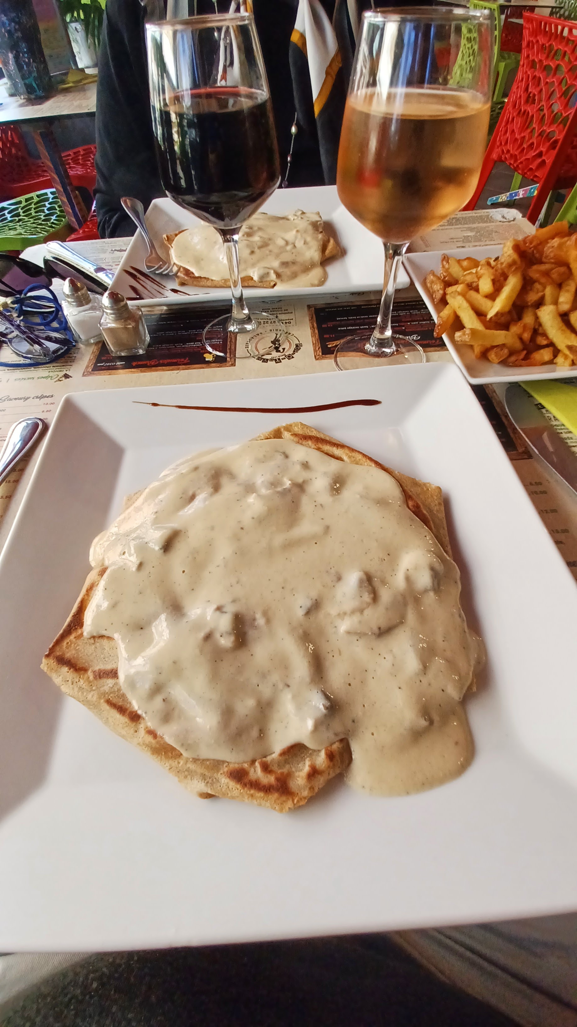 Des crêpes incroyables !! Le service était également bon, très sympathique. Nous avons pris le menu du déjeuner avec une crêpe salée et une crêpe déserte. Nous avons pris celui avec du poulet au fromage et une sauce aux champignons et au vin blanc. C'était vraiment un repas complet et le goût était incroyable ! Pour finir nous avons eu la crêpe chocolat coco qui était également bonne mais nous étions déjà presque trop rassasiés 😊