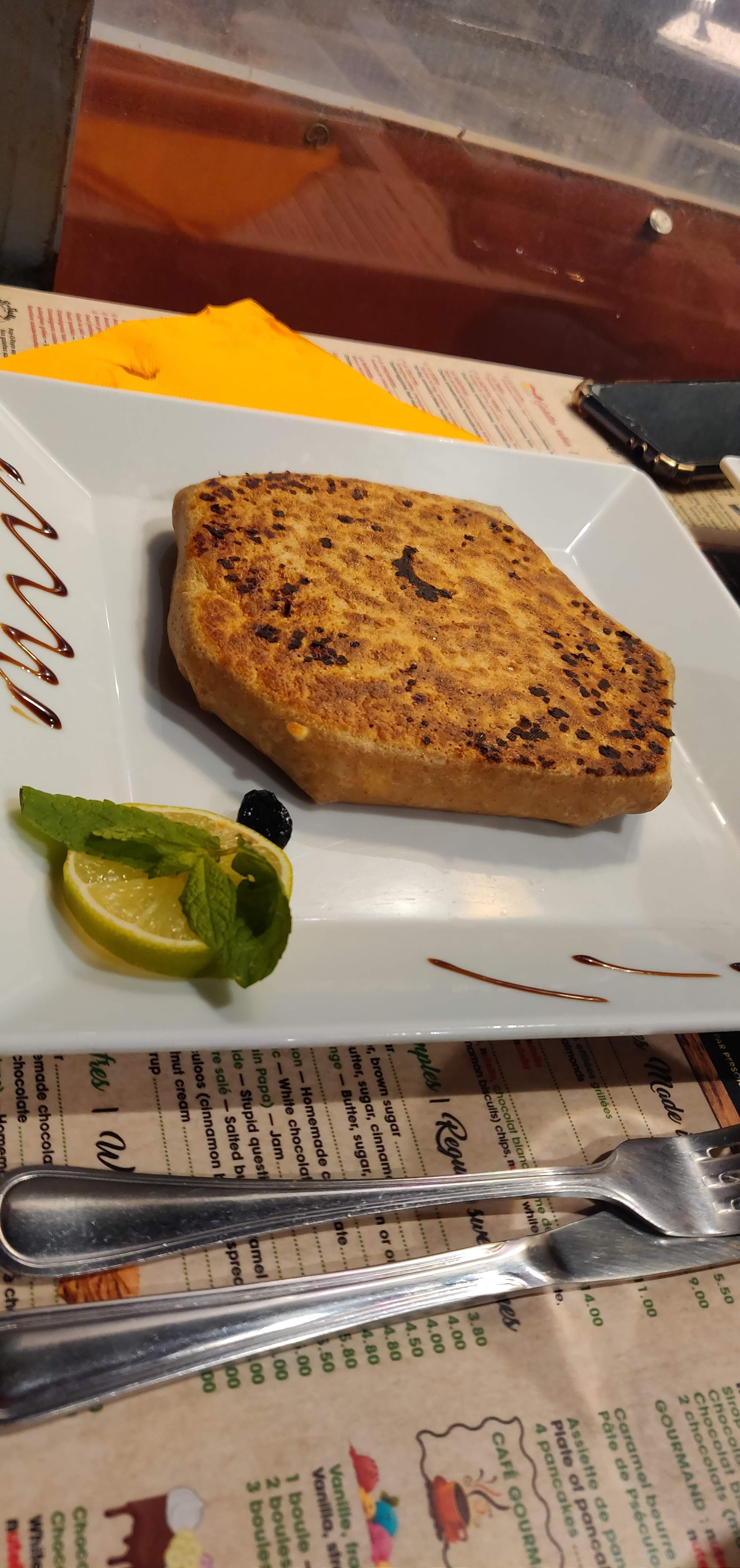 Il faut y aller. Les crêpes et pancakes sont vraiment frais et savoureux. Le personnel est super sympa et le gars Amin est très drôle. Donnez-vous une sensation agréable au restaurant. Ce lieu a son propre caractère et est situé dans un quartier charmant. Voir les photos pour avoir une idée de la nourriture. Ils servent également des brunchs et des petits-déjeuners avec des portions énormes et un prix raisonnable. Dois essayer!!!