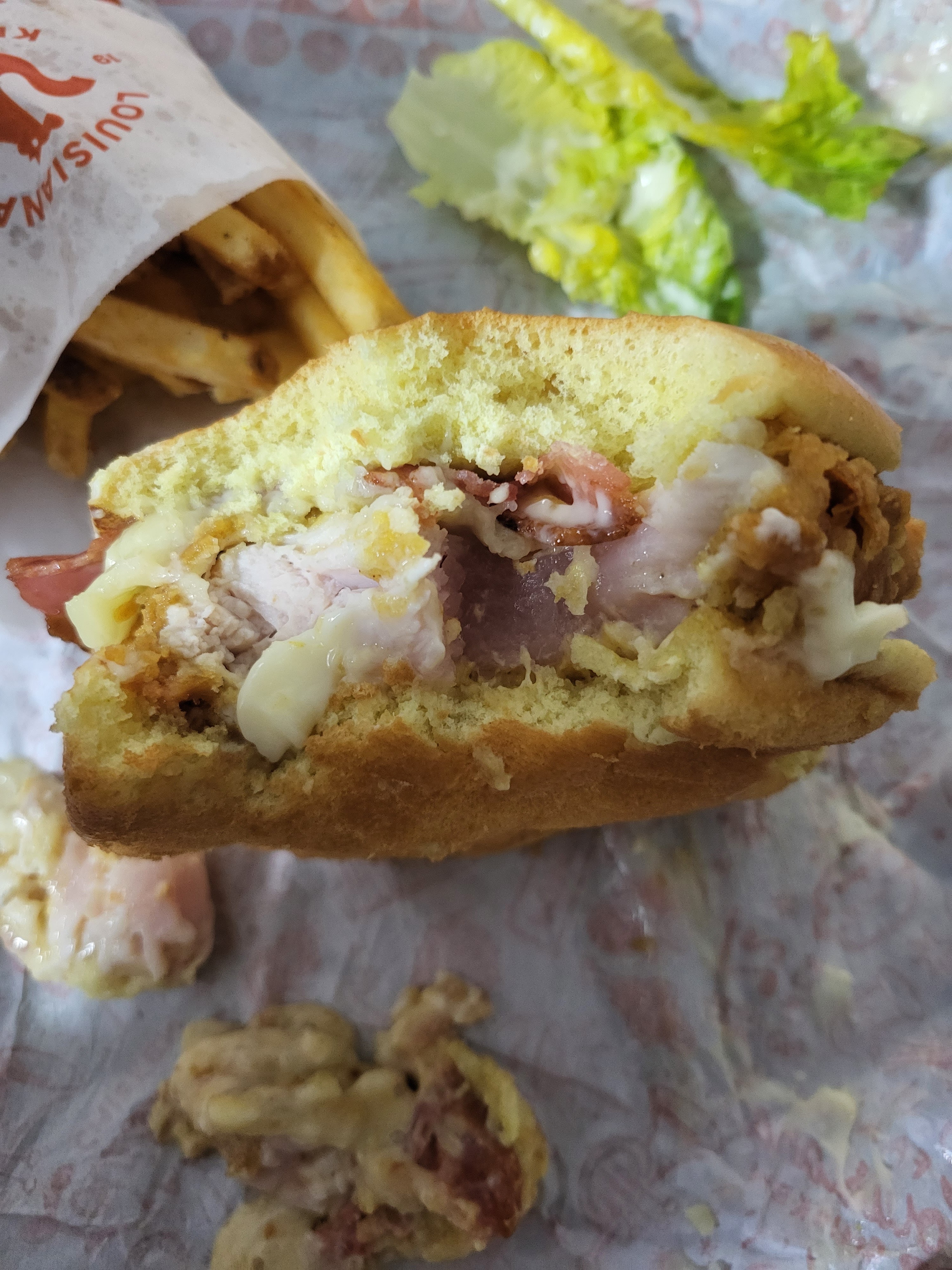 Je suis venue manger aujourd'hui à Popeyes, le repas est bien bon malgré le fait que les restant d'huile de friture au niveau du poulet et des frites étaient spéciales... Le goût, pareille pour les tenders, il restait beaucoup d'huile entre la panure et la viande et j'avais l'impression de manger de l'huile.. écoeurant à un moment donné. J'ai ensuite demandé du sel à l' employer qui était au SAT, elle m'a répondu d'une manière peu désolé nous n'avons pas de sel. Et est partie sans un excusez moi ou un désolé. Un ton où je me suis sentie agressée.. Ce n'est peut-être pas de sa faute, peut-être le stress mais ça m'a surpris sa façon de parler avec moi. Sinon, l' ambiance était sympathique.
