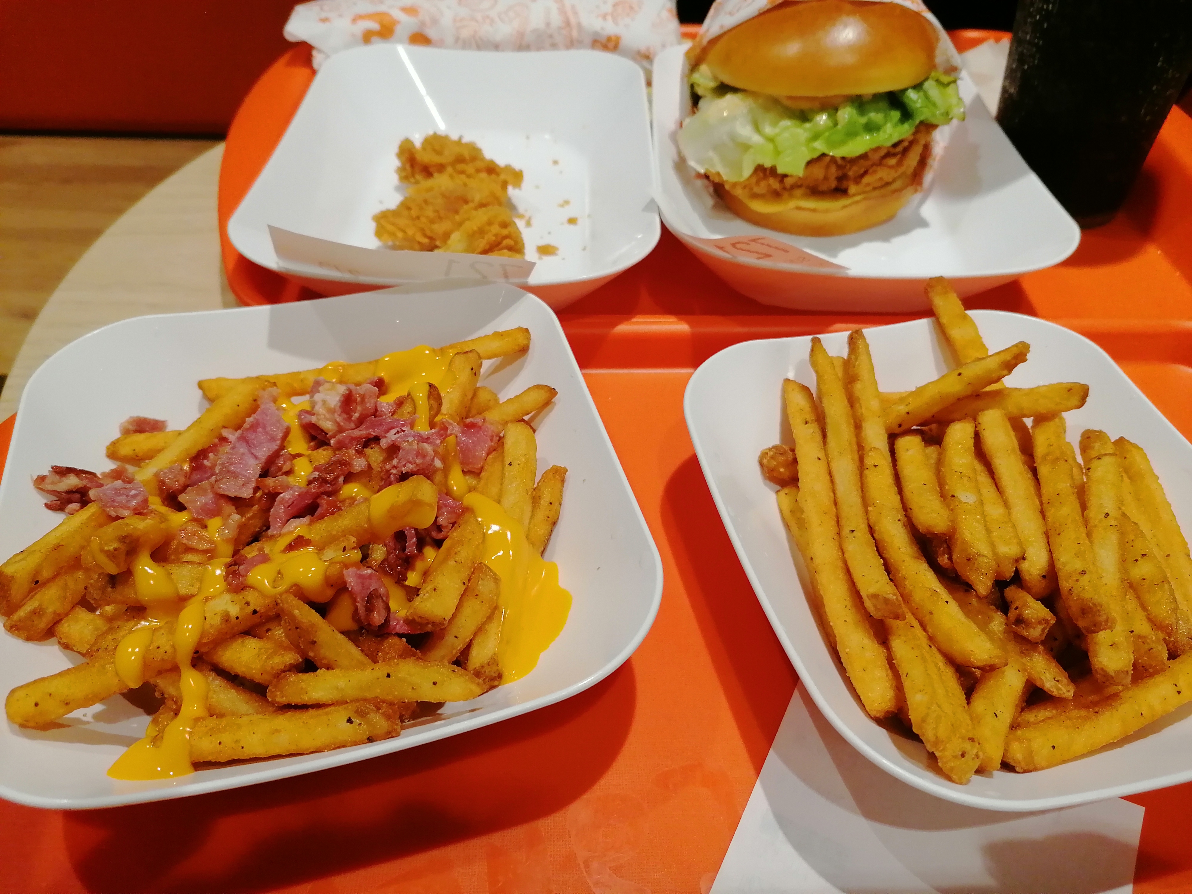 Peu de choix au niveau des burgers (3choix) et je n’ai pas réussi à voir la liste des ingrédients dans les burgers, on ne sais pas quelle est la différence entre X et Y burgers. J’ai également commandé 2 tenders. En terme de goût c’est vraiment bon, mais les tenders sont minuscules et il n’y a pas de sauce avec. 3.95€ pour 2 petits tenders sans sauce je trouve ça limite. Les frites bacon cheddar sont bonnes, bien croustillantes. Au niveau du Burger j’ai pris un Chicken Sandwich Deluxe. Je l’ai trouvé « fade » je pense que c’est du au peu de sauce qu’il y avait dedans. Le Burger reste néanmoins conséquent et c’est un bon point. Le cadre pour manger est vraiment agréable et propre. Les serveurs sont aimables et débarrassent pour nous !