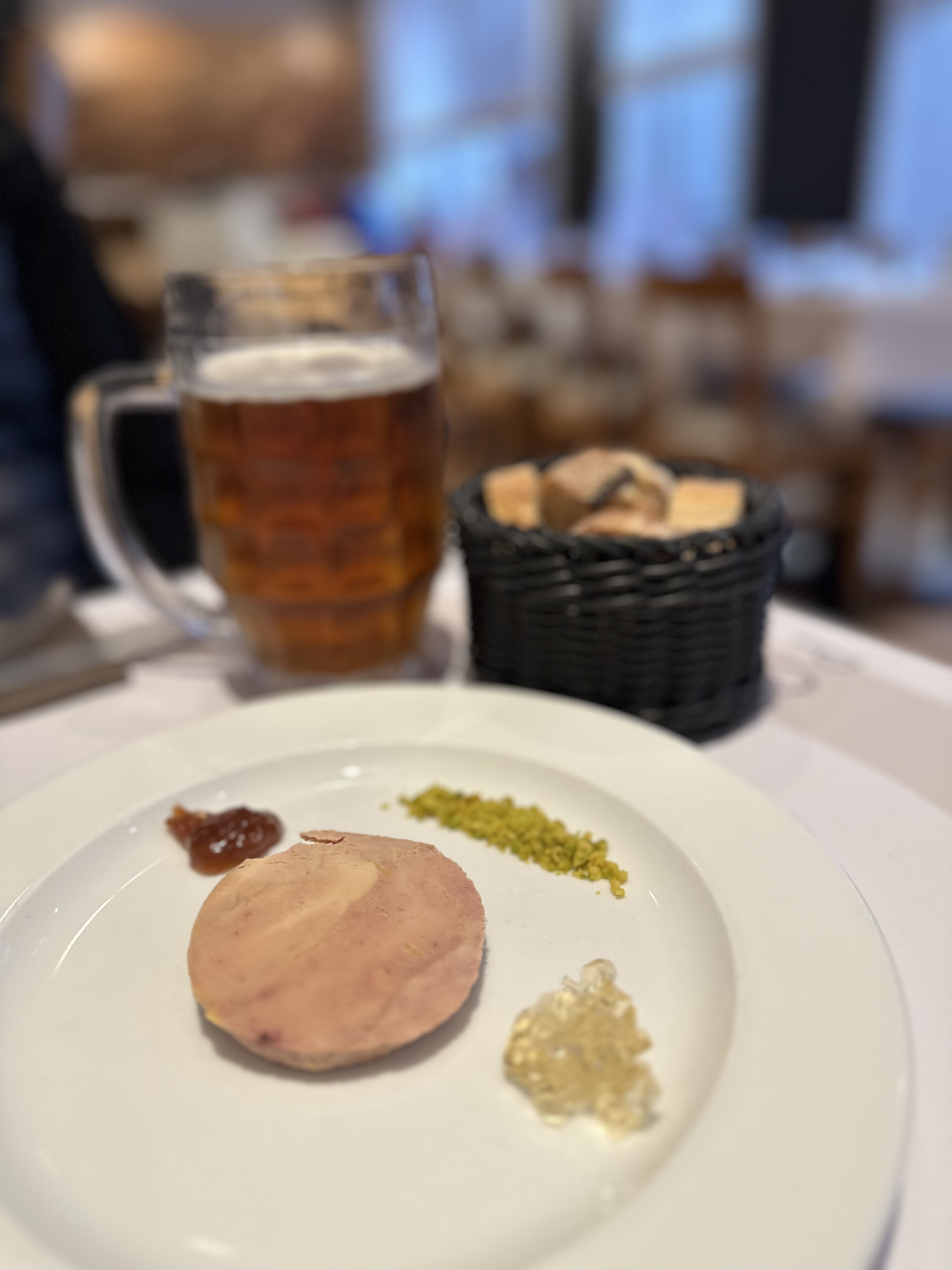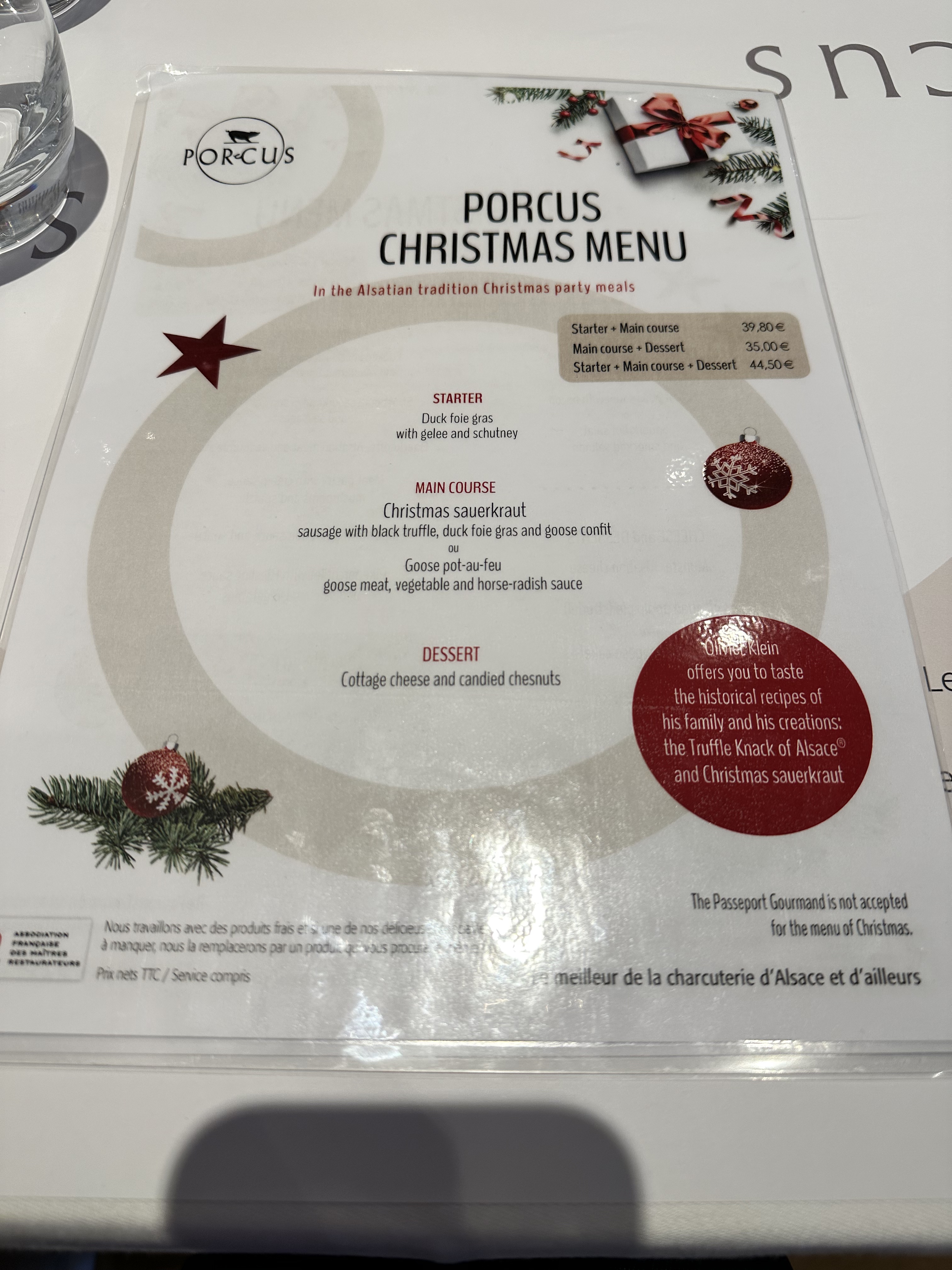 Un endroit fantastique où séjourner lorsque vous êtes à Strasbourg. Nous sommes venus l’année dernière mais nous n’avons pas pu entrer. Nous avons eu de la chance cette année. L'un de nous a eu sa dégustation du menu de Noël et l'autre a eu la choucroute spéciale de Noël. Le repas était fantastique car les deux avaient de la viande d'oie. Le foie gras était crémeux et raffiné. Le plat principal était une explosion de goût et de texture, encore une fois très raffiné. Le dessert saupoudré de fruits secs sur le fromage était un excellent choix pour terminer le repas. Hautement recommandé. Mention spéciale aux serveurs, sympathiques, serviables et merci tout spécial à Kim qui nous a servi pendant le déjeuner. PS - le magasin de détail se trouve en bas où vous pouvez acheter leurs charcuteries.