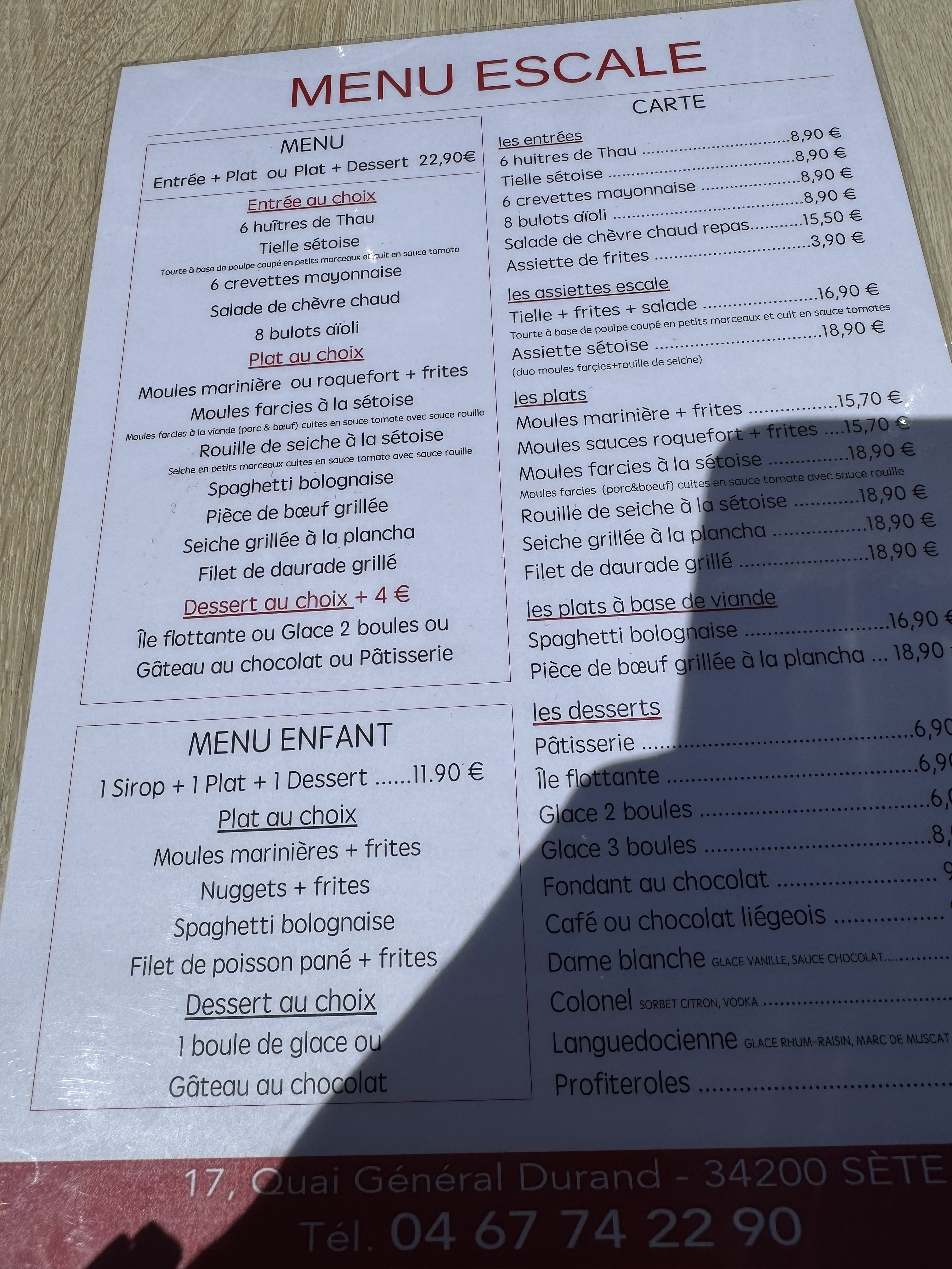 Assiettes sétoise avec moules sétoise et poulpe : 16,90. Prix très raisonnable. Nickel, bon et très bien servi. Patron sympa et service rapide. Resto pas cher et sur les quais. Bonne adresse.