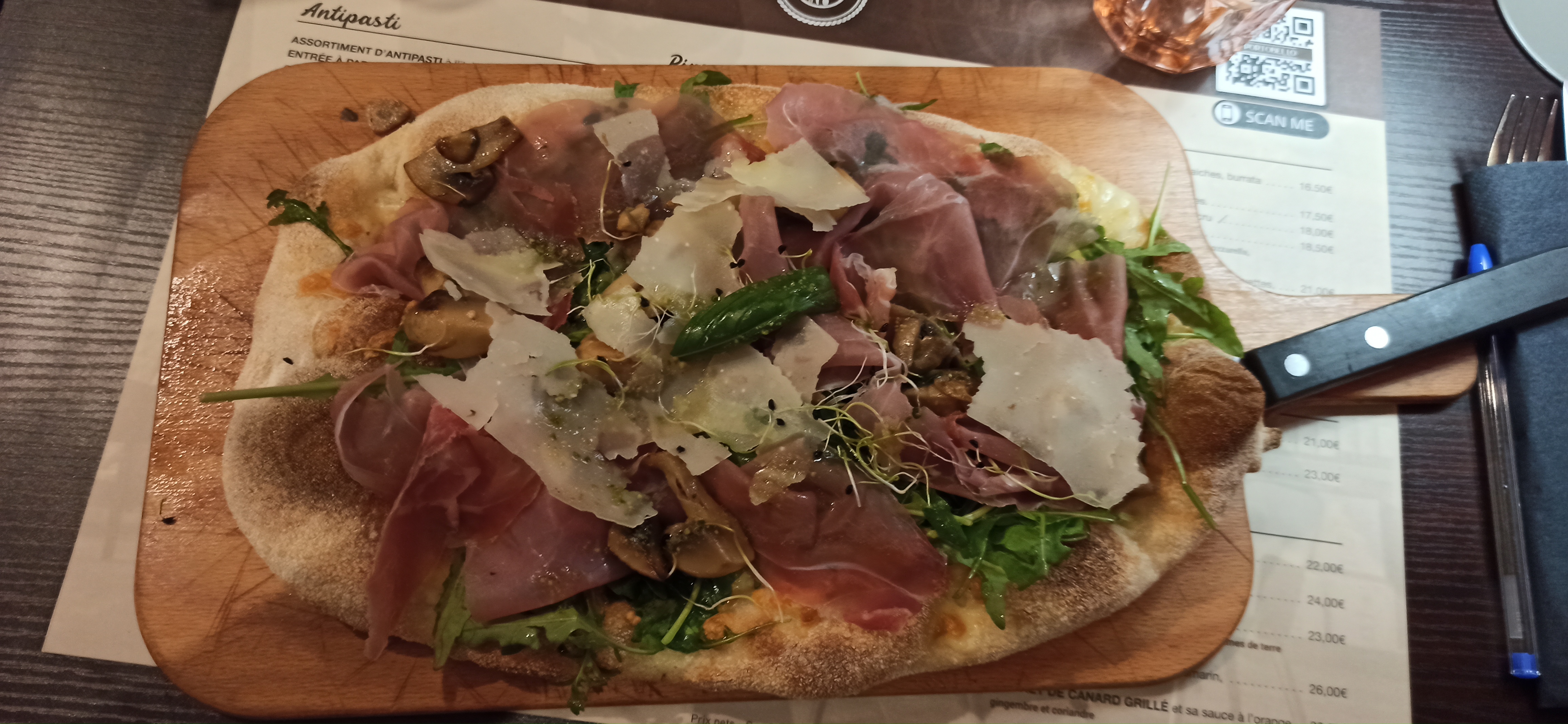 Pinsa délicieuse, service agréable, maque d'une petite musique d'ambiance a l'extérieur et des lumières/ bougies sinon tout est Top ! Merci 😁