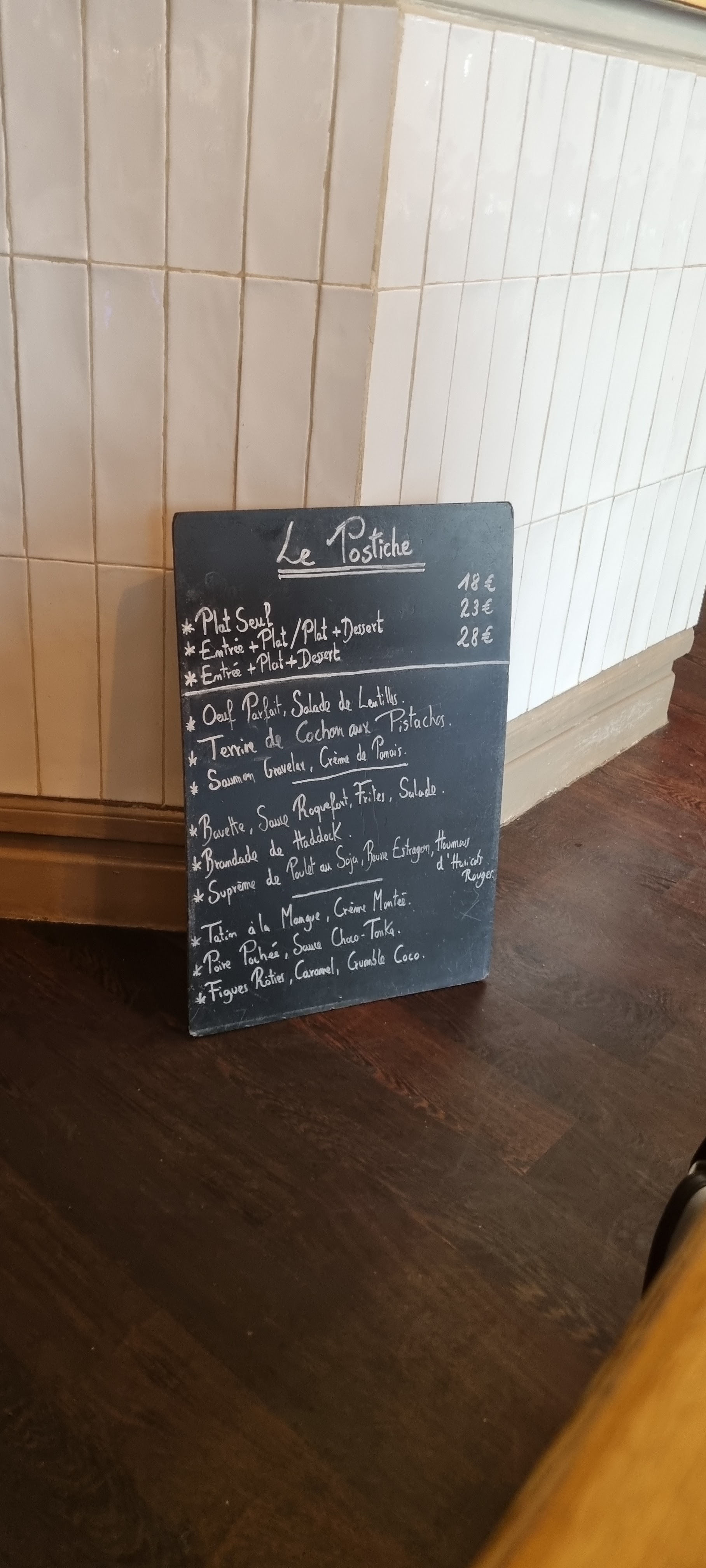 Le Postiche dispose de nombreux atouts, à commencer par la gentillesse du staff, toujours positif, tirant sur le blagueur. Ensuite, la carte, qui tourne autour de quelques valeurs originales mais sûres (supions à tomber, risotto dingo, pain perdu irrésistible, etc.) Enfin, le lieu : simple et chaleureux, et agréable en terrasse quand il fait beau. Et la carte des vins remplit son office (pour la version désuète) ou fait le taf (version plus actuelle). Enjoy !!!