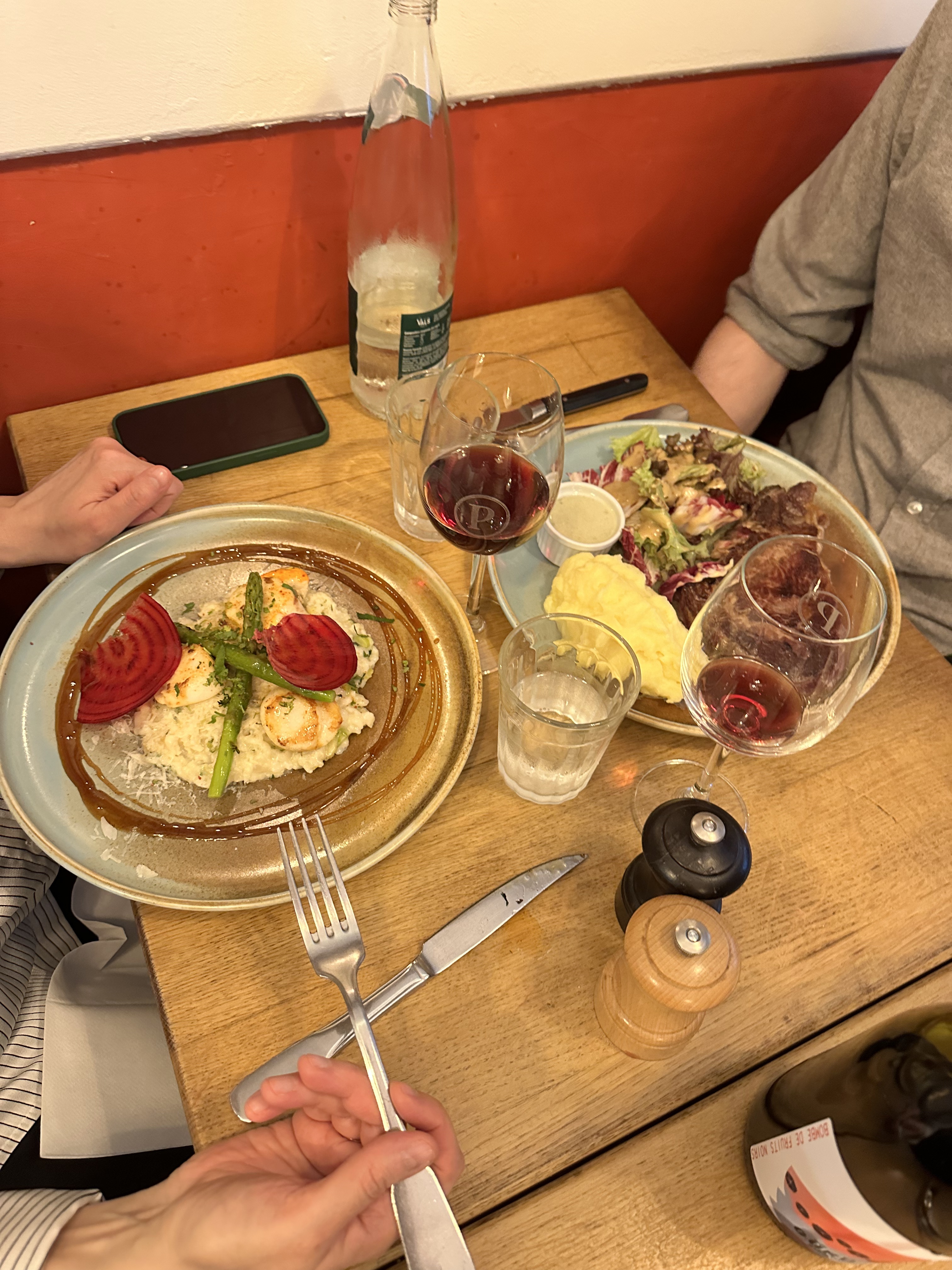 Endroit impressionnant! La serveuse était incroyable et, comme indiqué précédemment, nous a expliqué le menu en anglais. Nous avons pris le steak, le foie de veau, le saumon et le riscotto. Nourriture plutôt bonne pour le prix. Je reviendrai ici à mon retour à Paris !