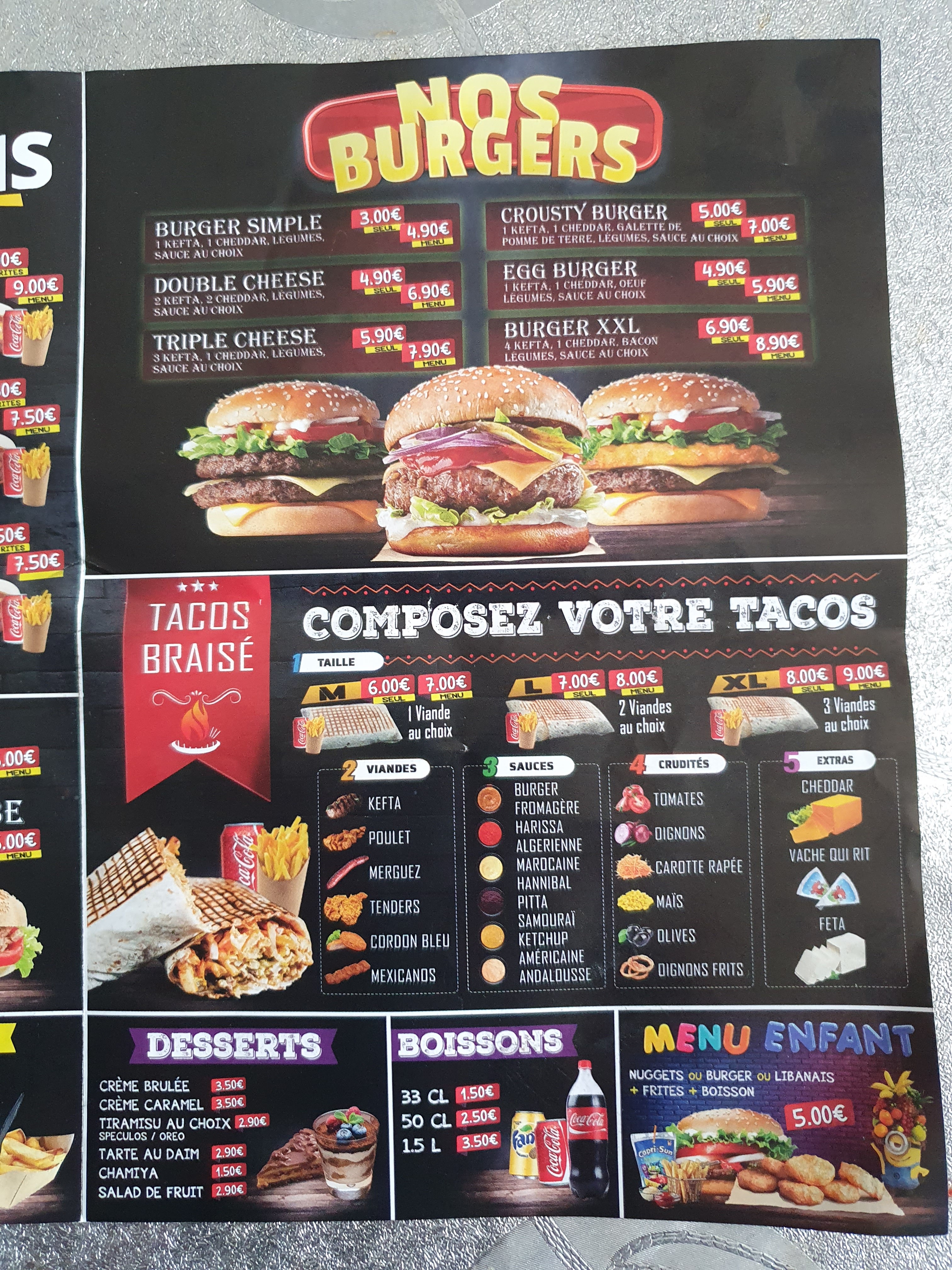 Sa a bien changer c'était bien meilleur avant j'y retournerai plus Bonjour ma compagne est passer hier soir les frites pas cuite sont tacos avais tout des morceaux noir de la plaque de cuisson donc le goût de cramé à chaque bouché 2 cros dedans il a fini à la poubelle et le poulet il était pas vraiment cuit les cuisse oui mais les pilons était en parti cru vraiment déçu