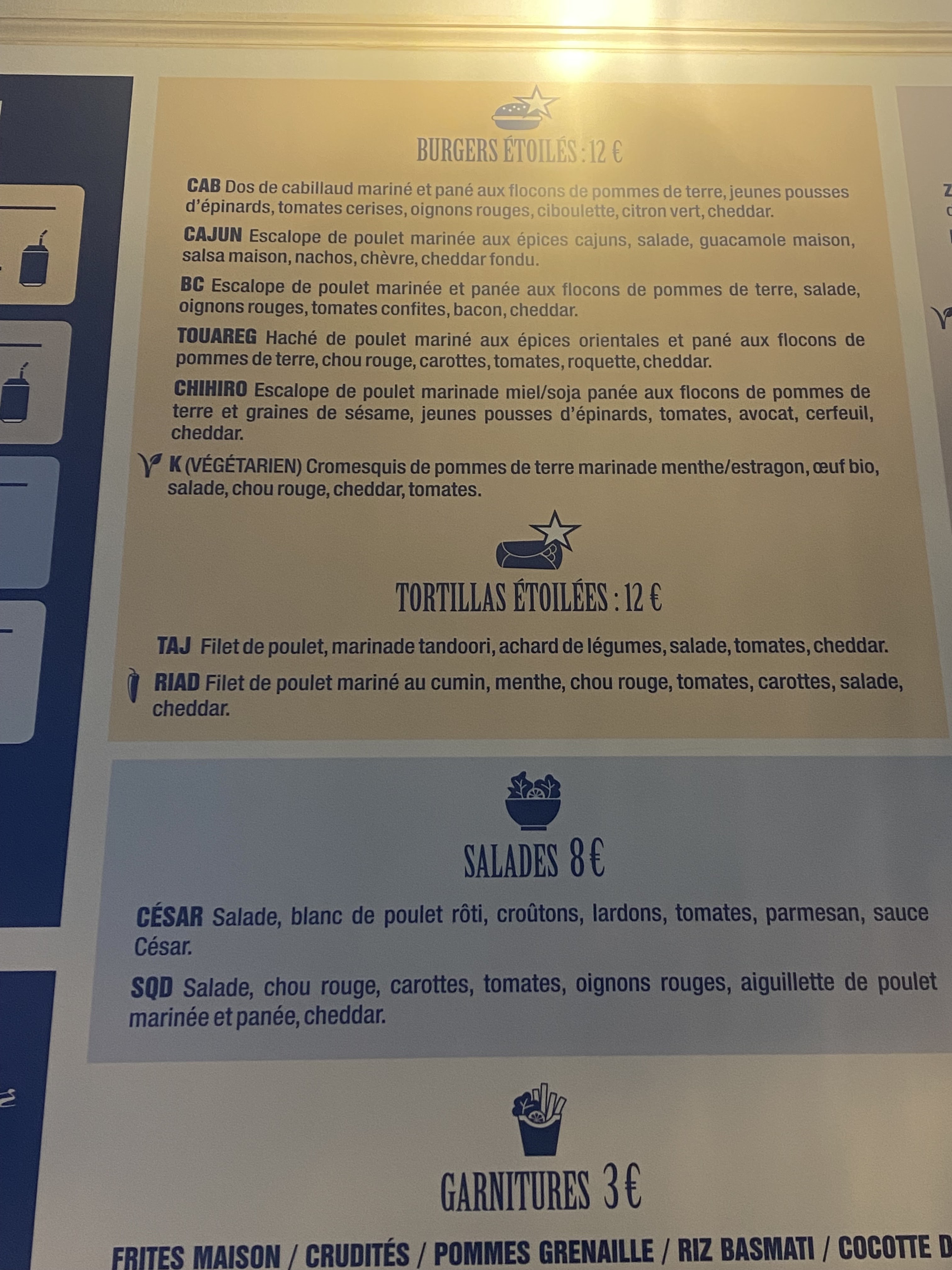 Des burgers uniquement au poulet toujours très frais et des recettes originales. Le Jim est un bon classique, et le fresh donne un twist frais justement, très agréable l'été. La mayo relevée est top et avec les frites maison. Seul bémol, le prix un peu élevé pour une des viandes les moins chères : 10€ le burger + 3€ l'accompagnement (frites, coslaw, pdt) / 13€ le menu avec boisson (exclu les limonades artisanales qui sont en supplément) et les desserts en supplément aussi Mais bon, normal pour le quartier et la qualité y est !