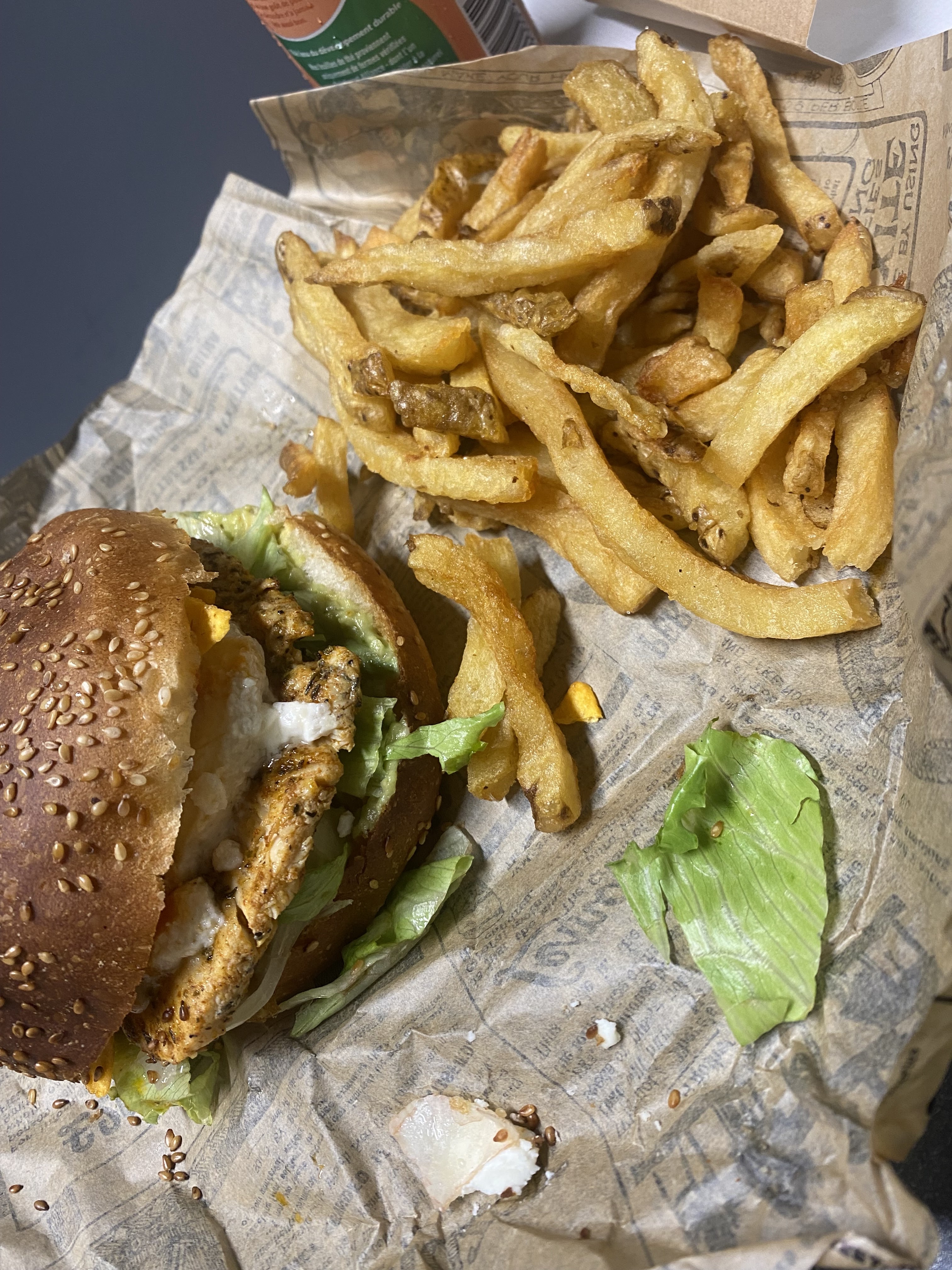 Burger 100 % poulet. Frites maison croustillantes et chaudes ou pommes de terre marinées dans le jus de cuisson de poulet Burgers originaux avec des gouts rapelant l inde. Tout ca servit tres vite ! Je recommande