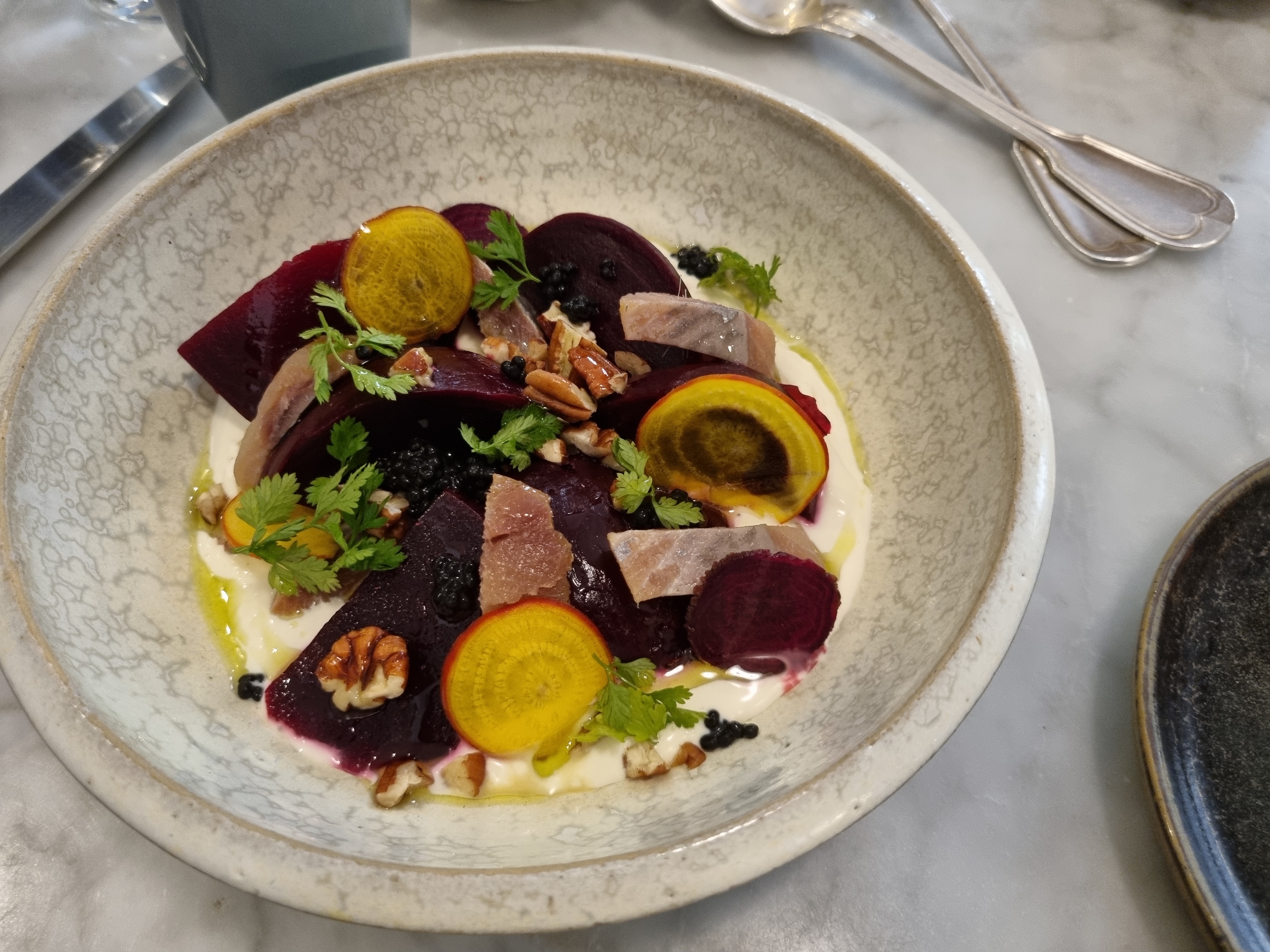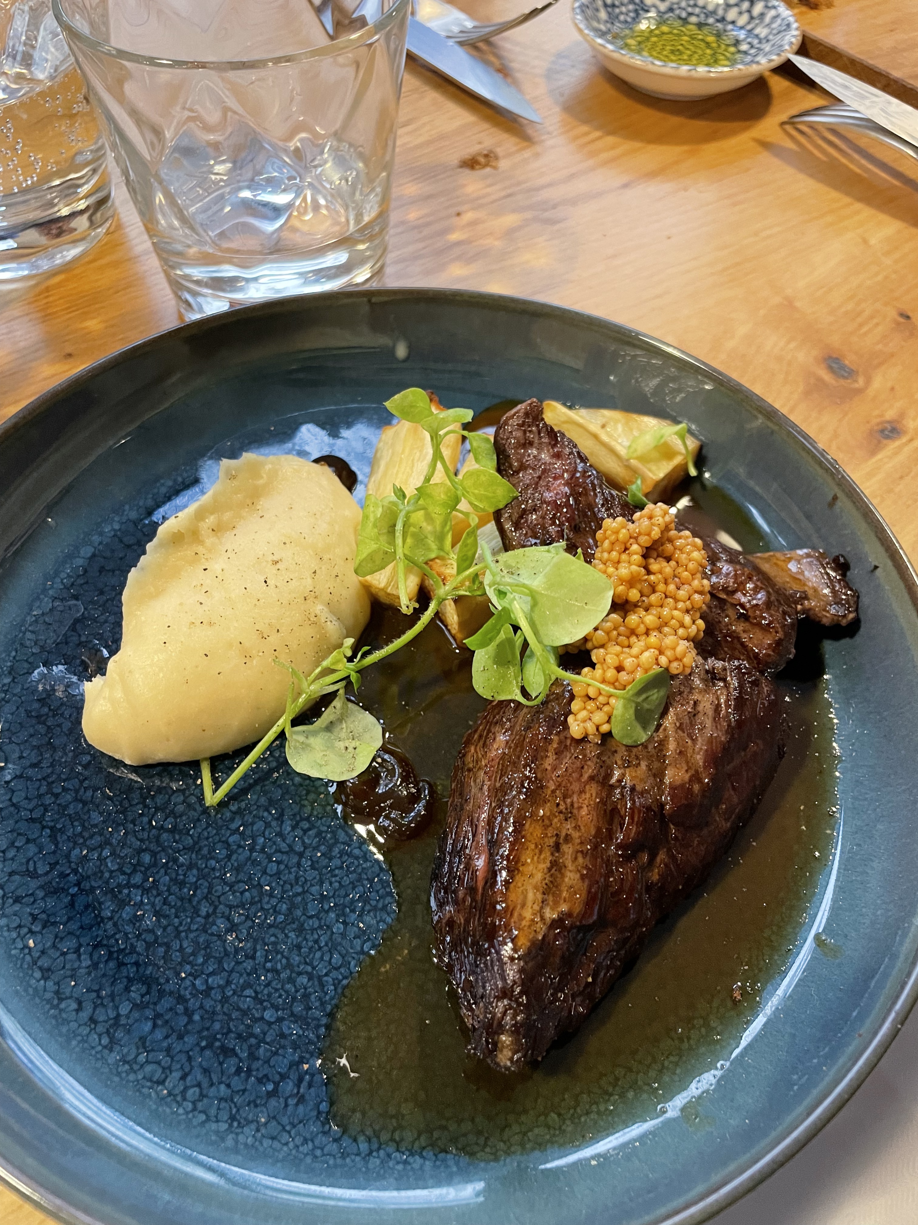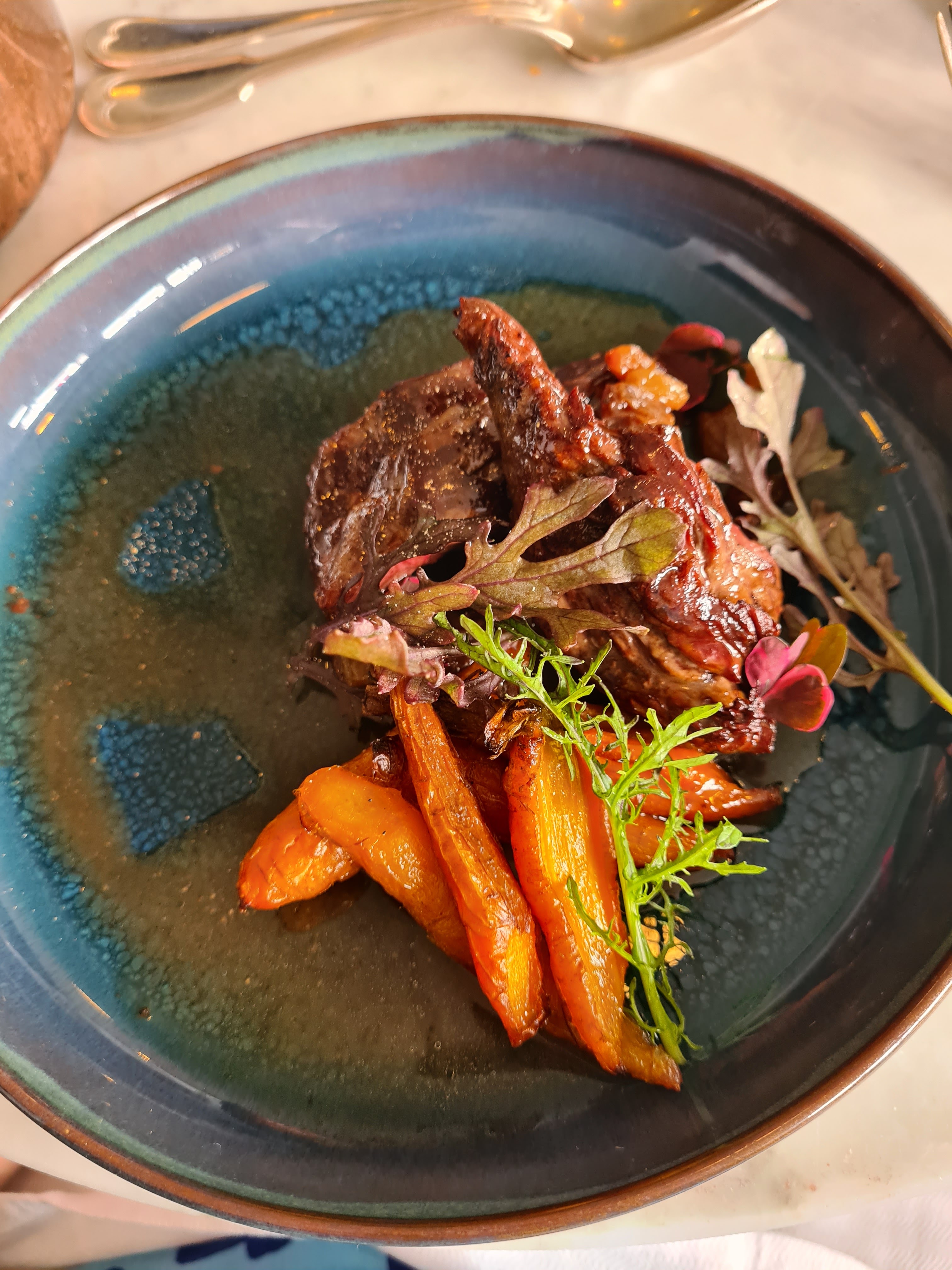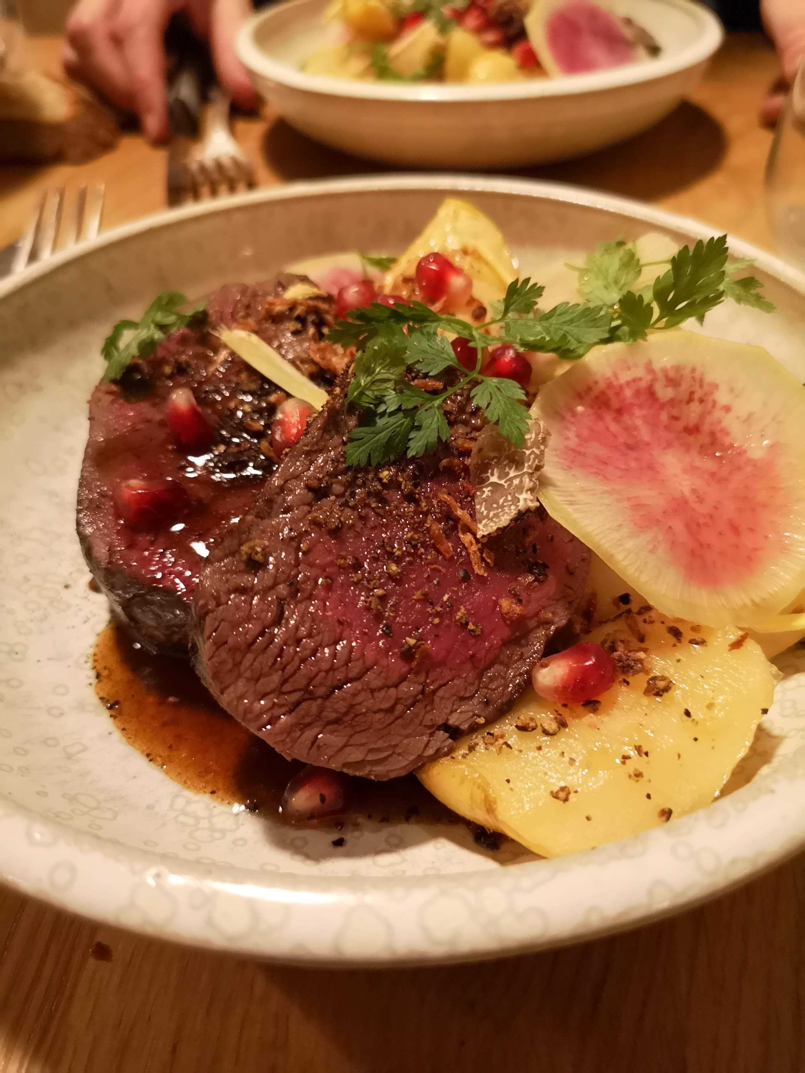 L'entrée partagée est raffinée et jolie en couleur. La viande de plat principal est malheureusement difficile à finir, le couteau n'est pas adapté.