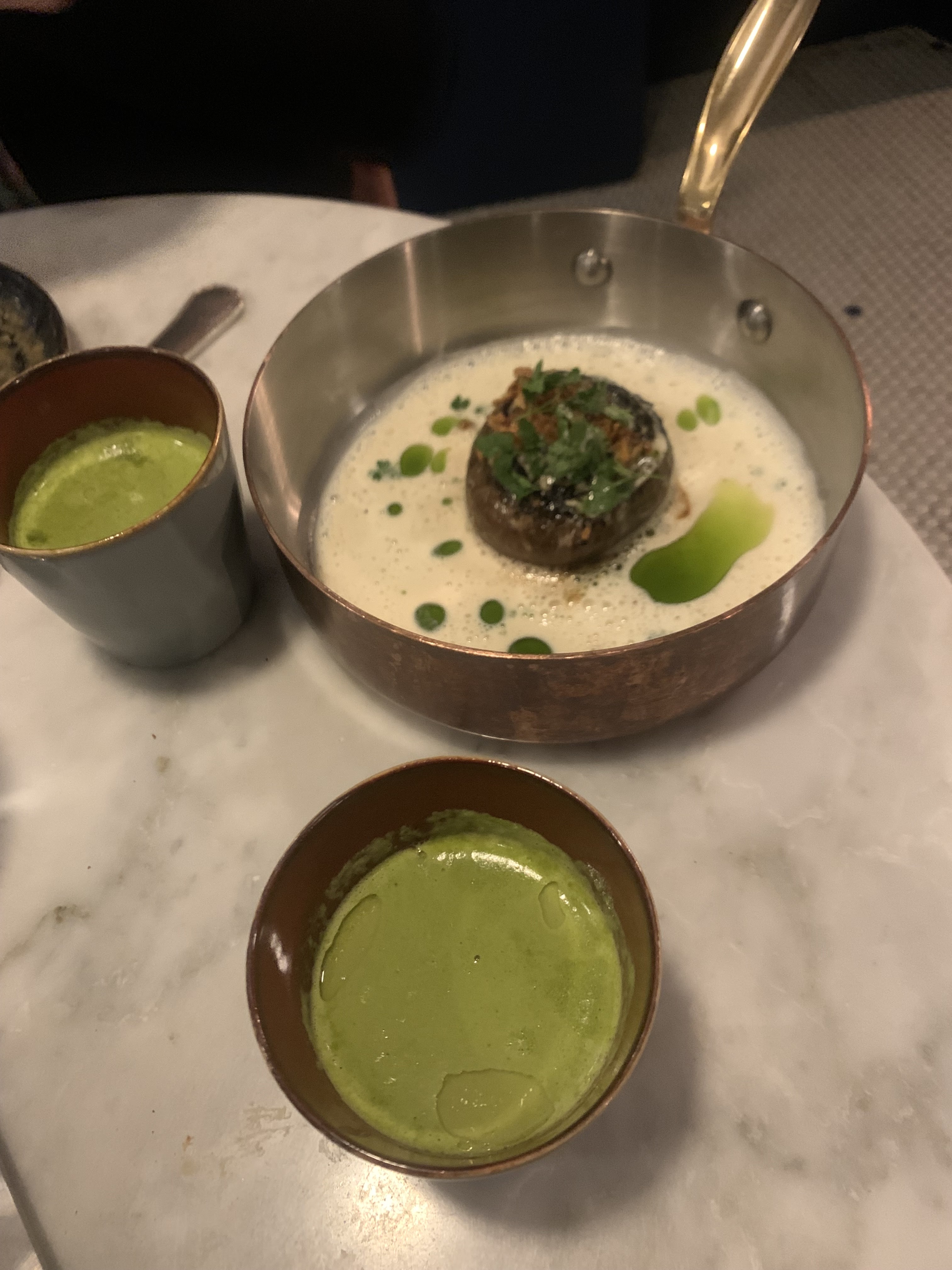 Le meilleur restaurant que je connaisse à Paris. Le menu pré-fixé du déjeuner à 28 € était incroyable. Repas entièrement végétarien (et je me considère comme un carnivore donc c'est un énorme complément au chef), 3 entrées (la soupe pastèque-tomate était non seulement alléchante mais évoquait une grande émotion et une sensation presque de picotement sur la peau), 1 plat principal (le plus copieux concoction de beurre de champignons et de pois verts, également sur la photo), et 2 délicieux desserts. Chaque plat a été parfaitement élaboré, touchant toutes les papilles gustatives et équilibrées, avec un mélange de couleurs et de textures, magnifiquement présenté. Un rapport qualité/prix incroyable. La seule chose à noter est qu'en été, essayez de vous asseoir à l'avant du restaurant car l'arrière, à côté de la cuisine, devient un peu chaud.