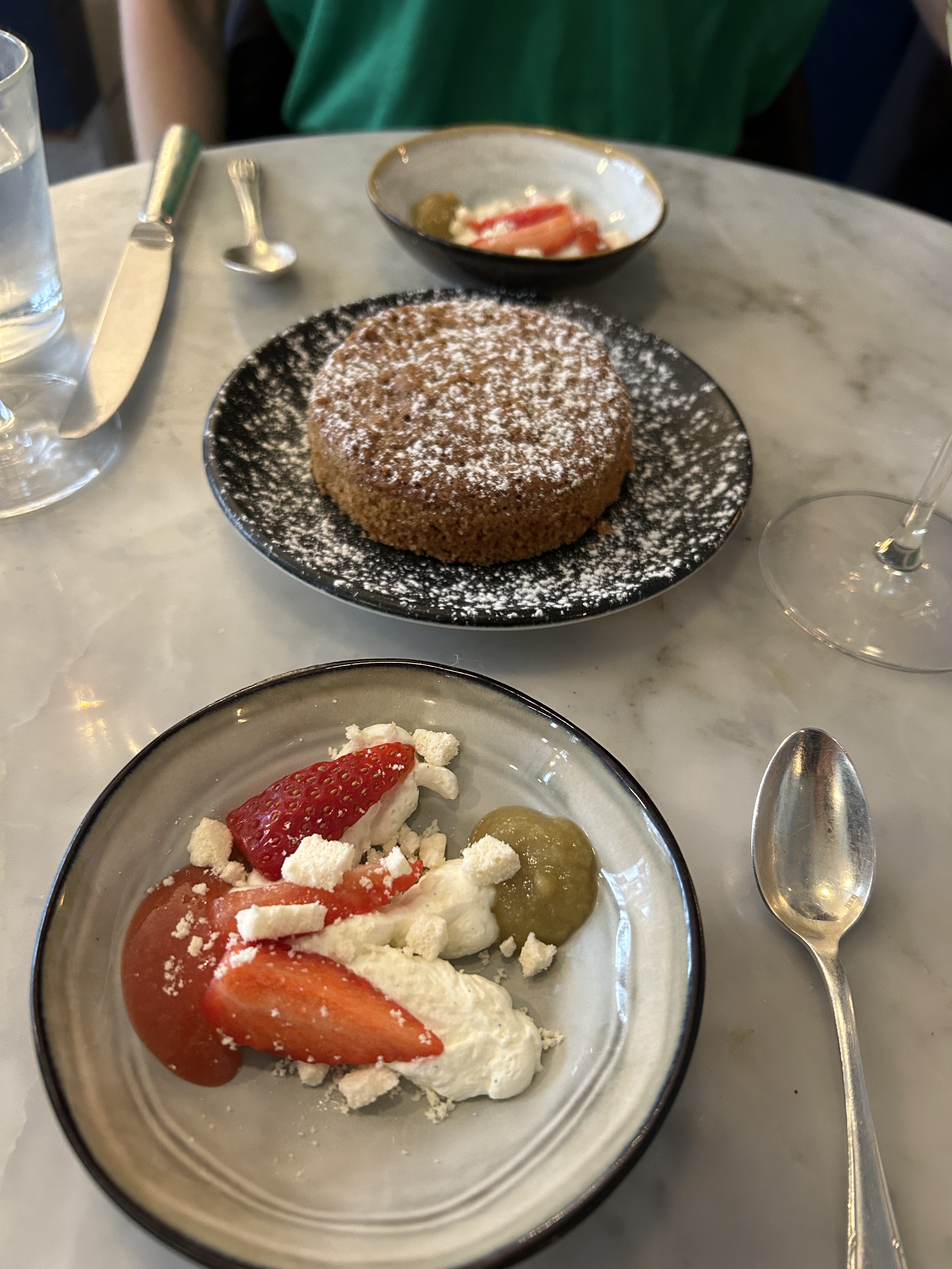 Un joyau caché à Paris. Pour 30 euros au déjeuner, c'est une bonne affaire. Le concept est assez unique : vous entrez, vous choisissez entre un plat principal à base de viande, de poisson ou végétarien, et le reste est une surprise. En entrée, ils ont servi un petit verre de soupe de cresson, une portion de houmous d'aubergines aux amandes et agrumes, et un plat de blettes au pesto et pignons de pin rôtis. Tout avait un goût si frais et le houmous était exceptionnel (ils ont également apporté un très bon pain au levain) et très léger. En plat j'ai choisi la bavette avec des courgettes rôties et un jus de viande. Les courgettes étaient bonnes, mais la viande était assez dure, probablement trop cuite. Mais le dessert m'a fait oublier ça. Il était servi en 2 parties : d'une part une crème chantilly avec un sorbet aux griottes et cerises confites, et d'autre part un gâteau aux noisettes et à l'huile d'olive. La première partie était tellement rafraîchissante et les textures étaient fantastiques, surtout avec le pollen d'abeille saupoudré dessus. Ensuite le gâteau : il avait un bon goût de noisette et les bords étaient croustillants, presque comme ceux d'un biscuit fraîchement sorti du four. Incroyable. Recommande fortement. Le menu change tous les jours, vous êtes donc assuré d'être surpris lorsque vous y allez.
