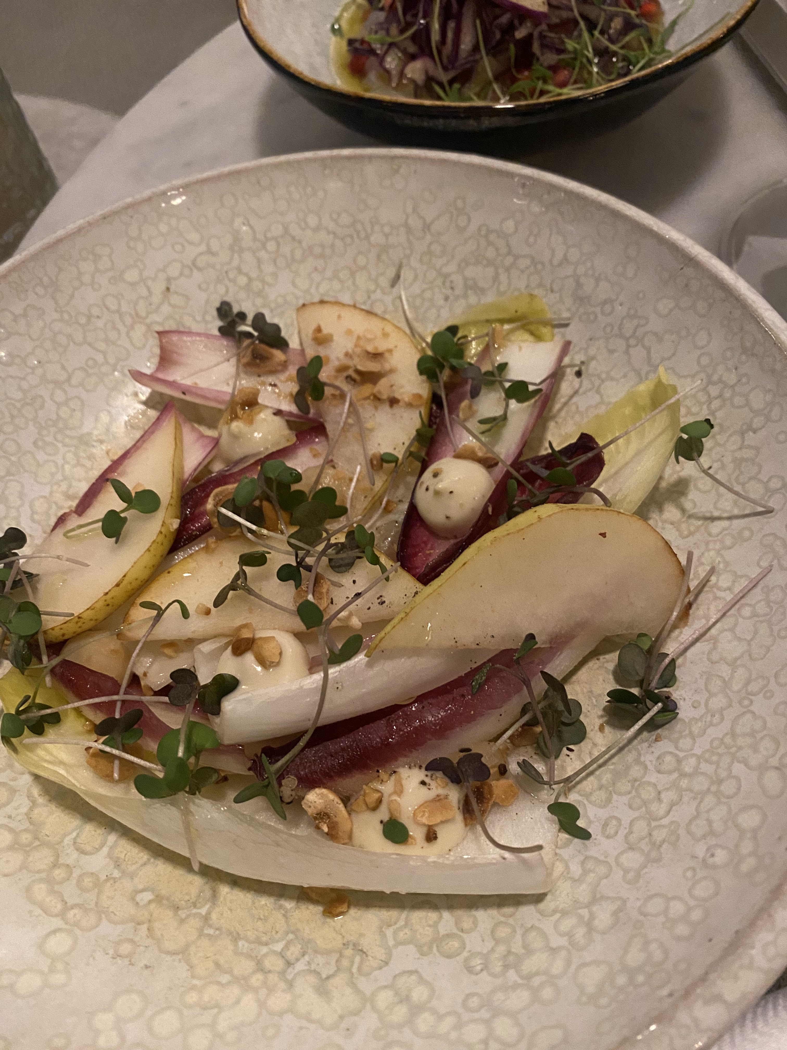 Globalement assez déçue par ce lieu qui était plein de promesses. Un menu à 62 assez copieux (rapport qualité prix correct au demeurant) mais au final très lisse et aucun des plats ne m’aura marqué. La seule entrée qui m’a donné un peu d’émotion est le tonato avec oeufs de truites. Pour le plat principal choix entre lapin et lieu noir. Le lieu noir ça ne fait pas rêver. Le lapin bien exécuté mais manque de chance, pas fan des patates douces. Quant au service, l’équipe y met du sien, mais quand on entend à la grande table d’à côté : « viande, poisson, végétarien, levez la main »… ça fait un peu service repas sur un long courrier Air France. C’est bon, mais ça ne casse pas 3 pattes à un canard. Encore un restaurant de plus de pseudo fooding. Une formule au final très standardisée. Nous sommes également saturés de ces concepts à partager… et espérons un retour à des vraies bonnes assiettes individuelles et traditionnelles. Le lait de coco pour le tartare ceviche, pour le dessert et les cacahouètes et noix de cajou pour le soit disant croquant, il y a un moment où cela n’apporte pas grand chose. Une carte des vins chère et très conventionnelle. En bons voisins nous n’en ferons pas nôtre cantine.
