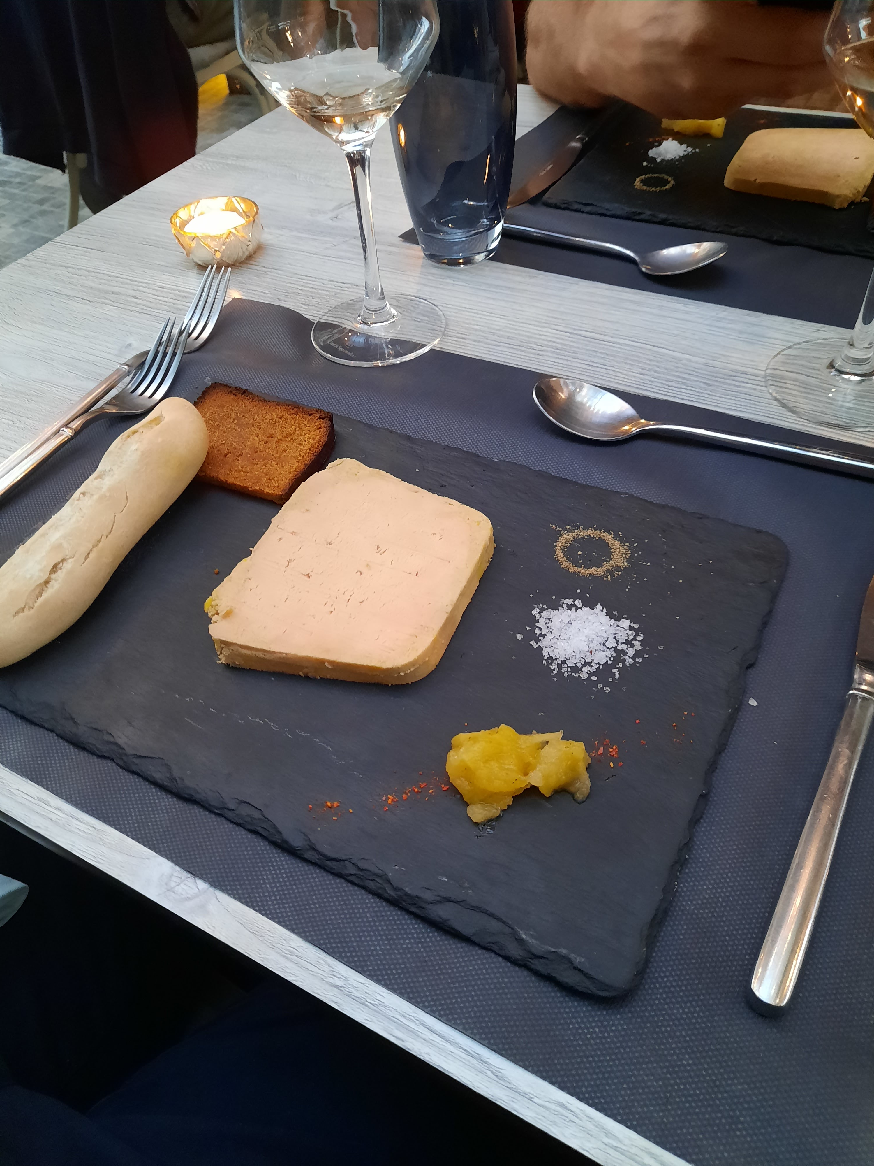 Très beau resto, je suis passé plein de fois devant et j'avais vraiment hâte de tester. On a été bien accueilli, le service est rapide et le personnel est sympa, mais on été placé à une table juste en face des toilettes. C'est par ordre de réservation apparemment. J'avais lu un commentaire déjà à ce sujet et je me disais que la personne abusait et que c'était sûrement une place de dernière minute 😅 On dirait trop une place pr ceux qui attendent leur commande à emporter.. Il devrait y avoir l'apero offert pr cette table ou cela devrait être précise lors de la réservation. On a pris le cocktail du jour à base de fruit de la passion, je n'ai senti que de l'ananas... Bonne part de foie gras qui est bon, mais un peu trop salé. La souris d'agneau très bonne, tendre, juteuse avec du goût mais l'accompagnent Franchement 0. Il y a tellement mieux à proposer. C'est 3-4 mini pommes de terres froides sans goût... On fait des salades de pommes de terres chez moi et je vous assure que ça n'a rien à voir. Le dessert j'ai pris un mile feuille sans intérêt. La personne qui a diné avec moi était contente de ses plats mais sans plus et sa crème caramel baignait dans un liquide, je ne sais pas si c'est normal 🤔 Le verre de chardonnay bof aussi. En bref rapport qualité-prix je ne suis pas satisfaite.