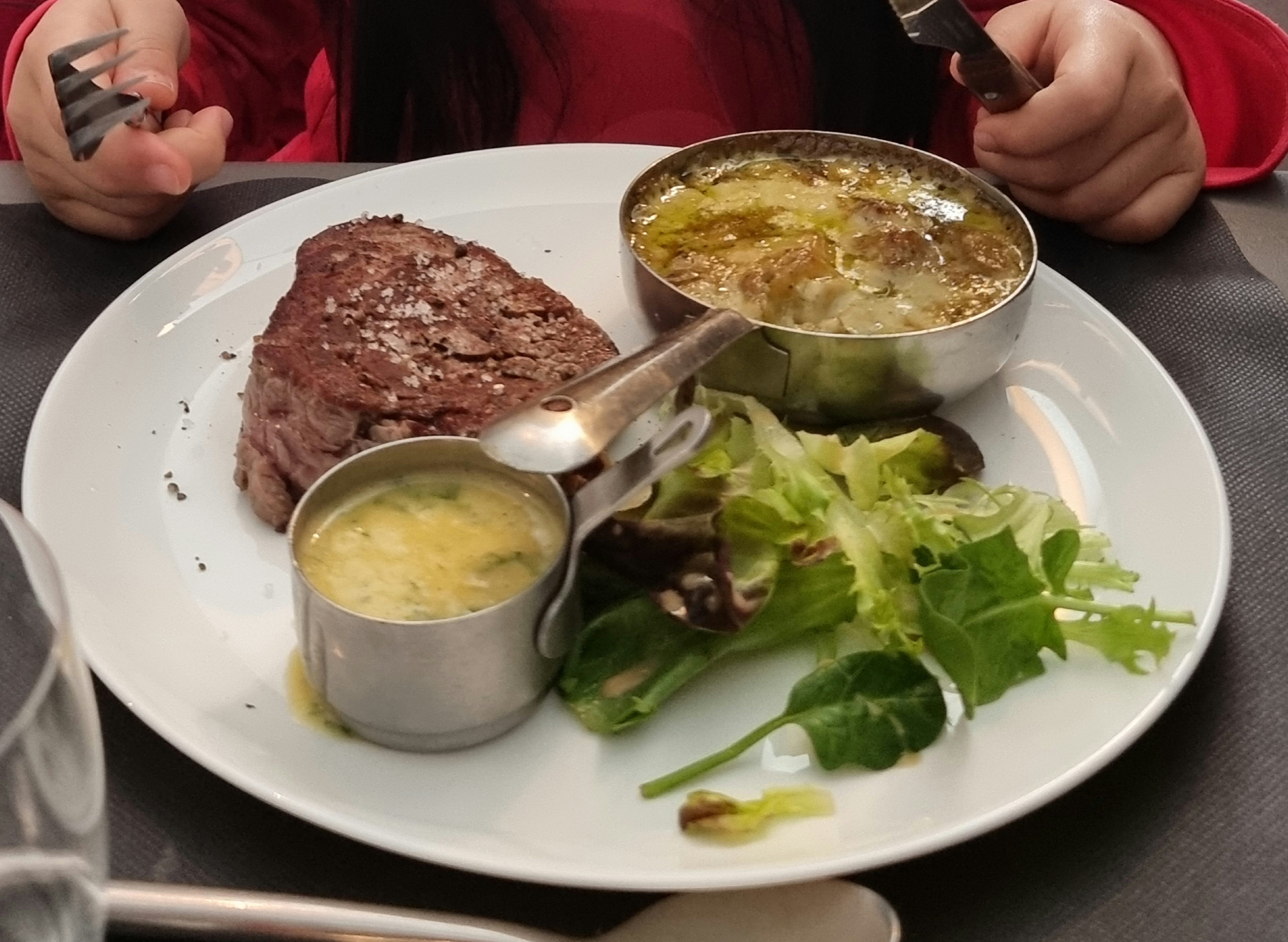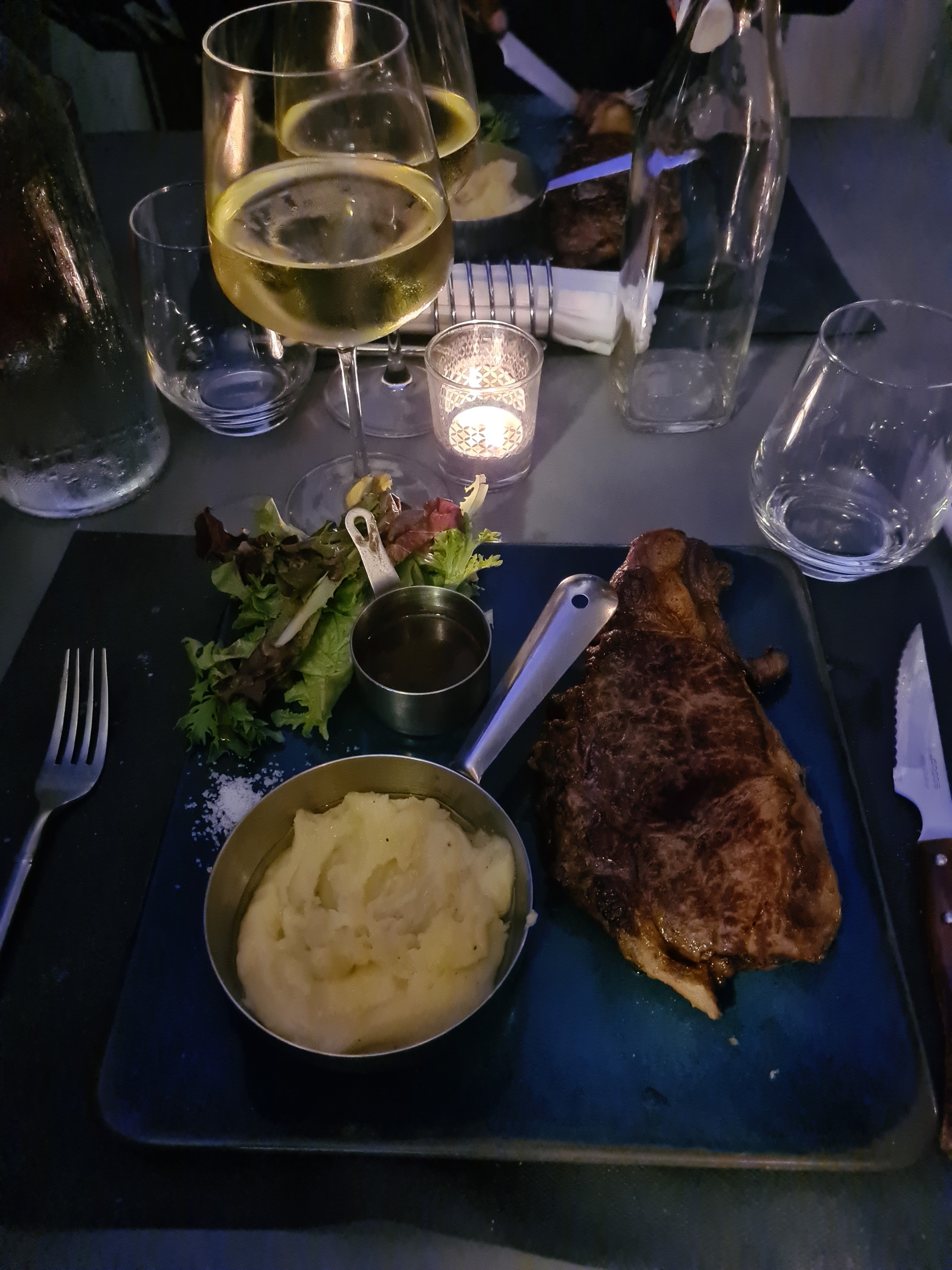 Cadre agréable, carte intéressante avec des plats et des sauces recherchés (sur le papier en tout cas), personnel sympathique et accueillant. Je mets une note de 3/5 car j’ai été tout de même assez déçu par la fameuse côte de boeuf de 350g, qui était très grasse à mon goût. Pour une note de 80e à 2, je m’attendais à mieux.