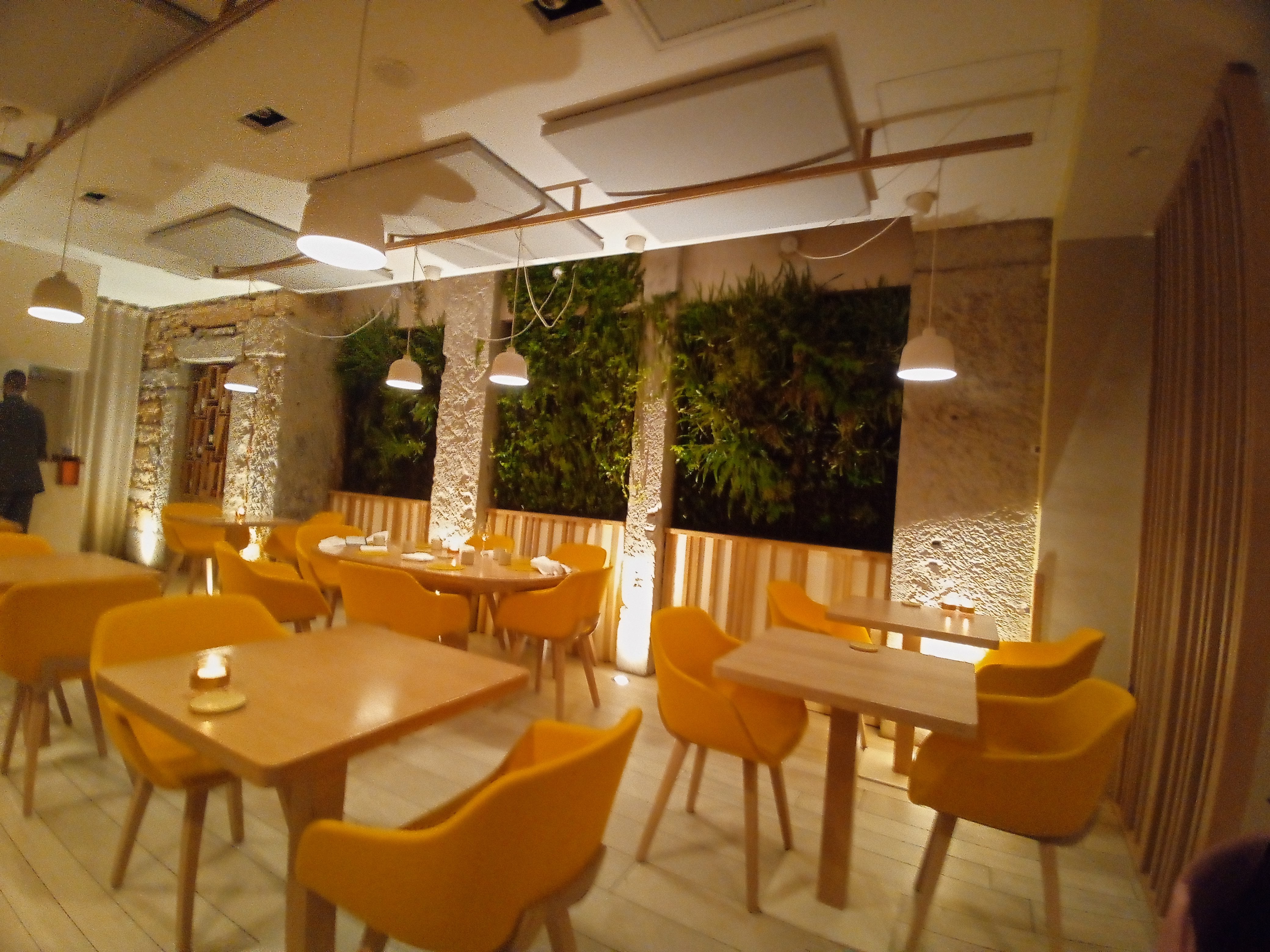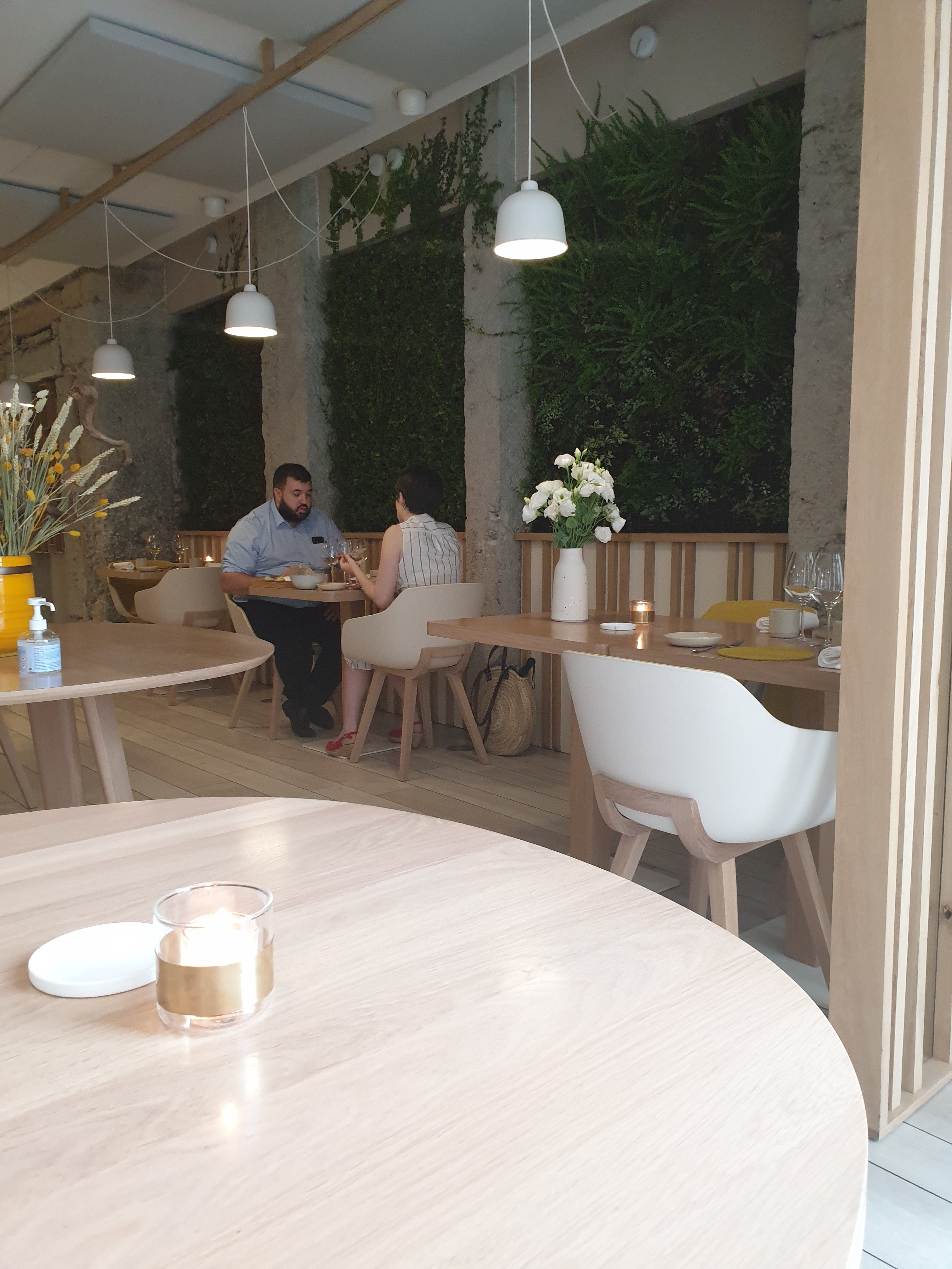 Une première pour nous et ce fut une invitation au voyage dans le pays des saveurs. le cadre est épuré et acidulé. Un mur végétal crée une ambiance harmonieuse avec les meubles clairs. Tout ici rappelle la nature qui est au coeur de la cuisine de GG. Le service, impeccable, n’était pas en reste. Chaleur, gentillesse et discrétion nous ont accompagné tout le long de notre repas. Le menu, tout en finesse, est un menu surprise où chaque plat est présenté. Un véritable travail d’orfèvre dans les assiettes. L’accord mets-vin pouvait parfois surprendre, voire dérouter nos palais, mais ce fut une belle découverte dans l’ensemble.