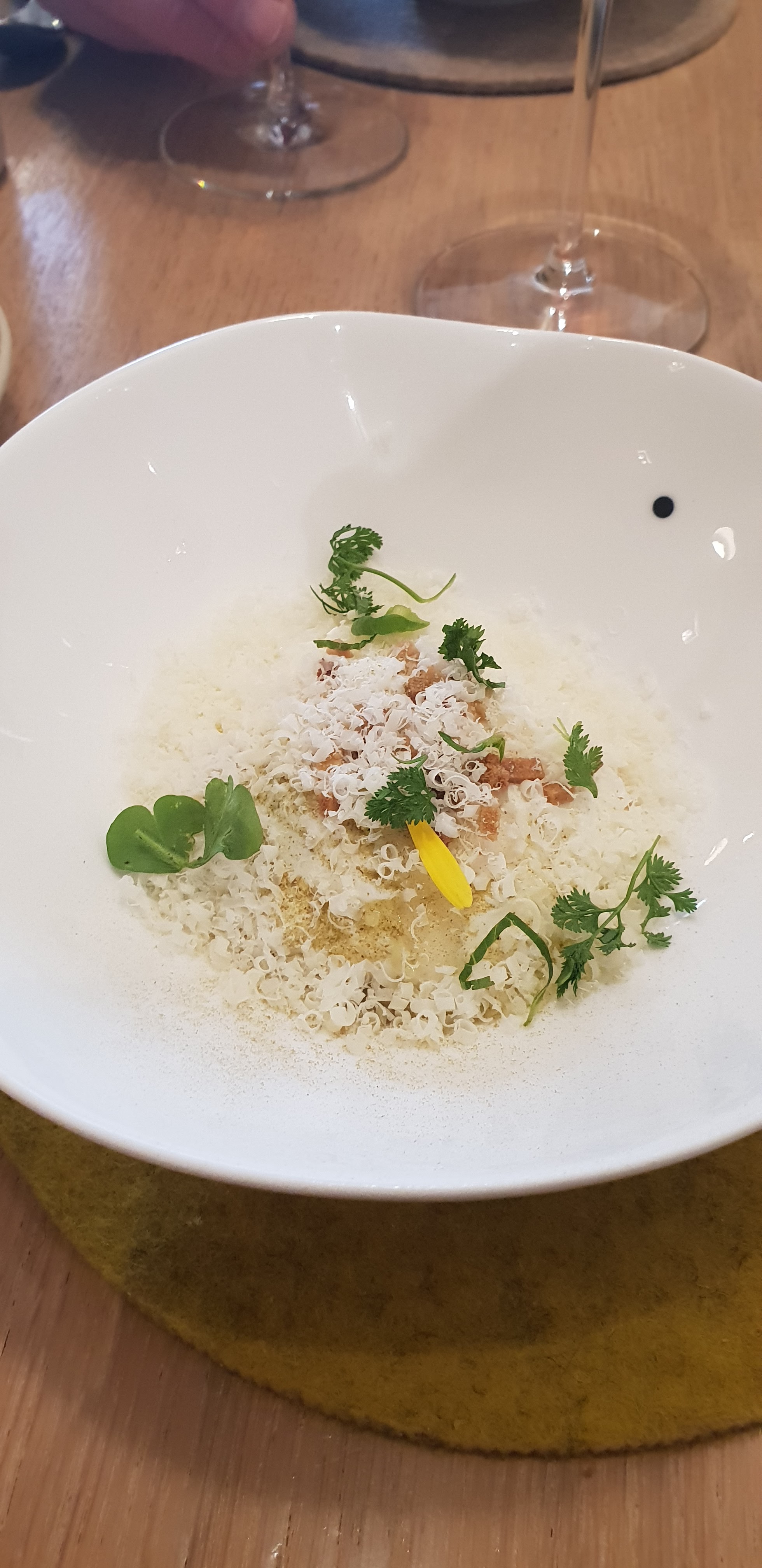 Végétale, surprenante et pleine de finesse. C'est ce que je retiendrai de la cuisine de ce beau restaurant où le cadre et le gastronomie vous transportent. On voit vraiment que le chef y donne de la passion et défend une belle démarche autour de la nature. J'apporte cependant un tout petit bémol sur le service, agréable, très professionnel mais qui manque un peu de naturel et de convivialité. L'ensemble reste très bien.